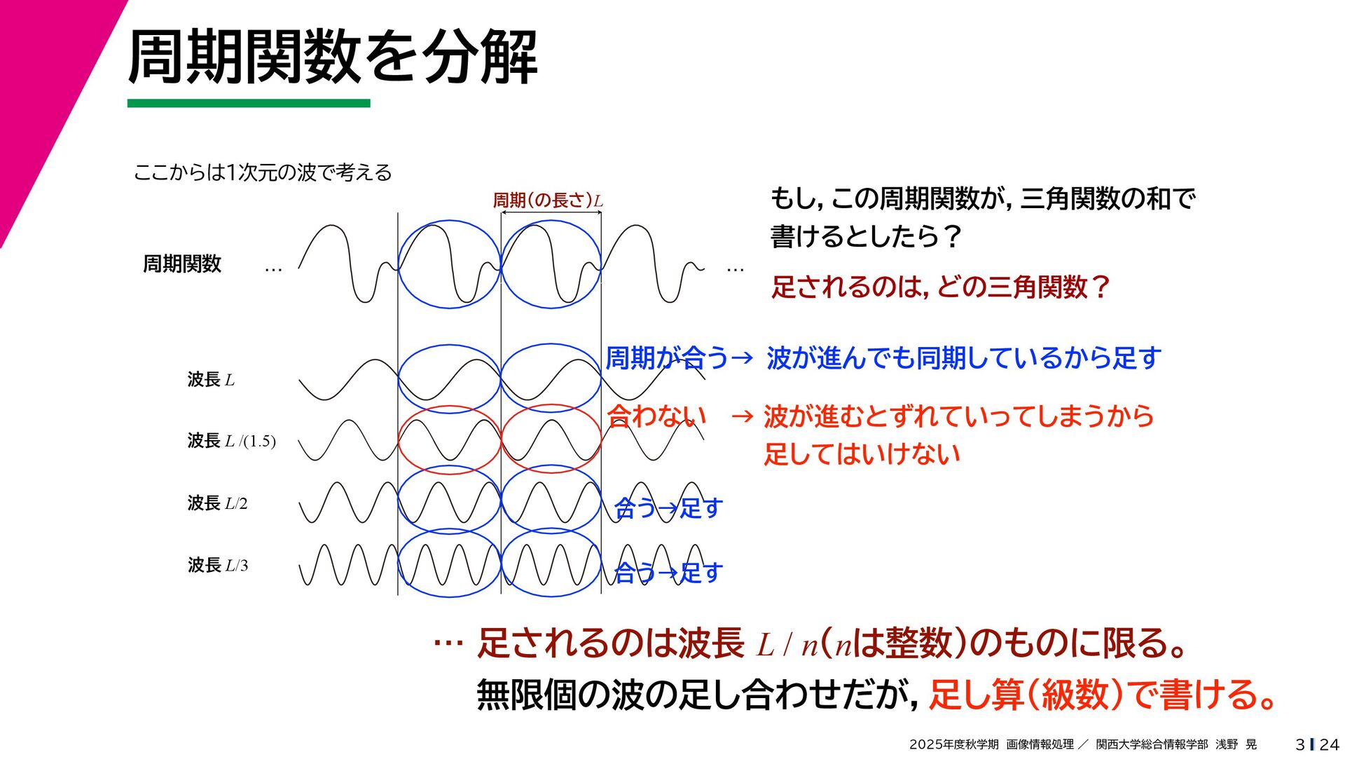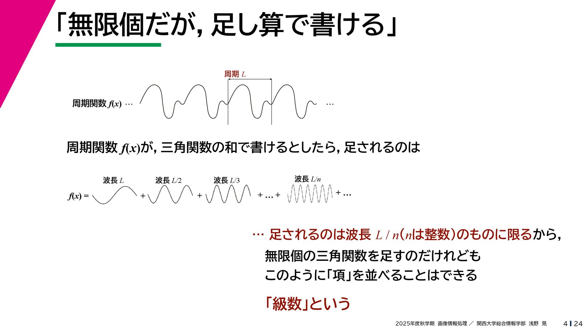 2. 24 2025年度秋学期 画像情報処理 / 関西大学総合情報学部 浅野 晃 「無限個だが,足し算で書ける」 4 周期関数 f(x) … … 周期関数