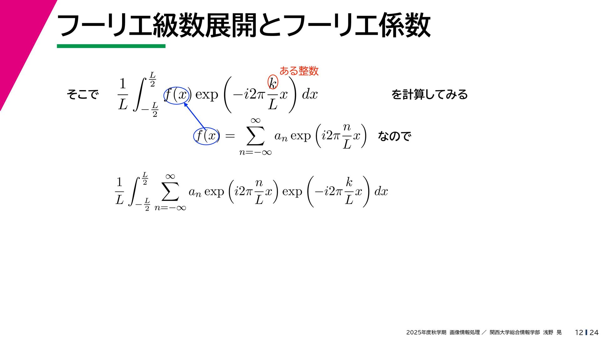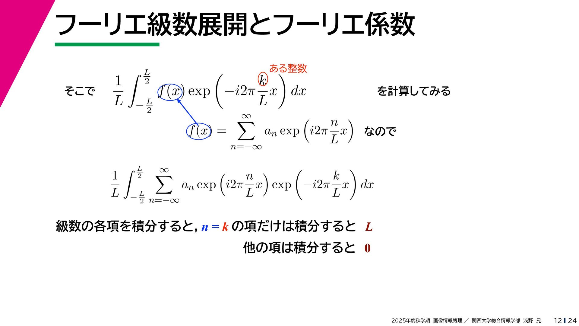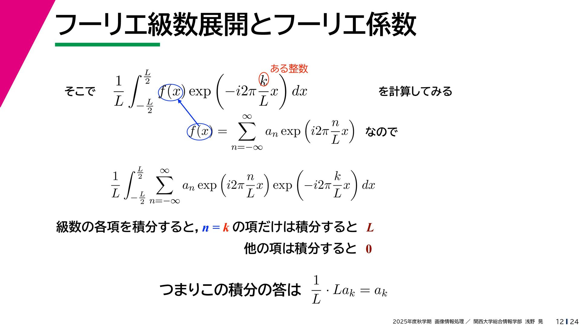 20. 24 2025年度秋学期 画像情報処理 / 関西大学総合情報学部 浅野 晃 フーリエ級数展開とフーリエ係数 12 級数の各項を積分すると,n = k の項だけは積分すると L そこで