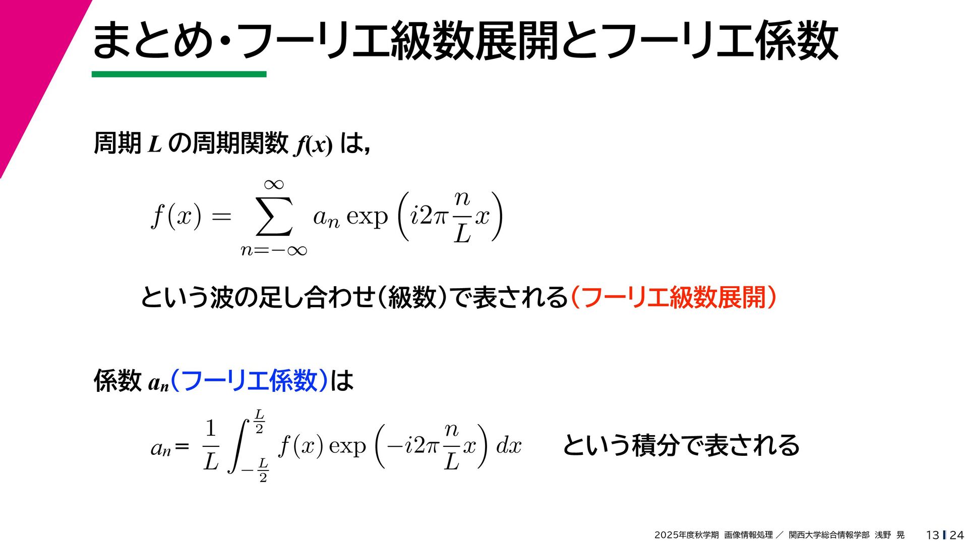 21. 24 2025年度秋学期 画像情報処理 / 関西大学総合情報学部 浅野 晃 まとめ・フーリエ級数展開とフーリエ係数 13 周期 L の周期関数 f(x) は,