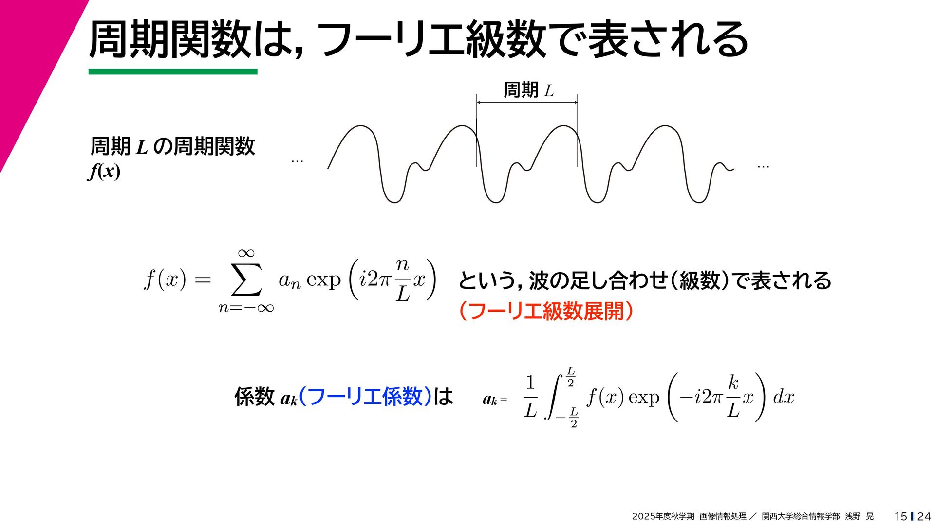 22. 24 2025年度秋学期 画像情報処理 / 関西大学総合情報学部 浅野 晃 周期関数は,フーリエ級数で表される 15 周期 L の周期関数 f(x) …