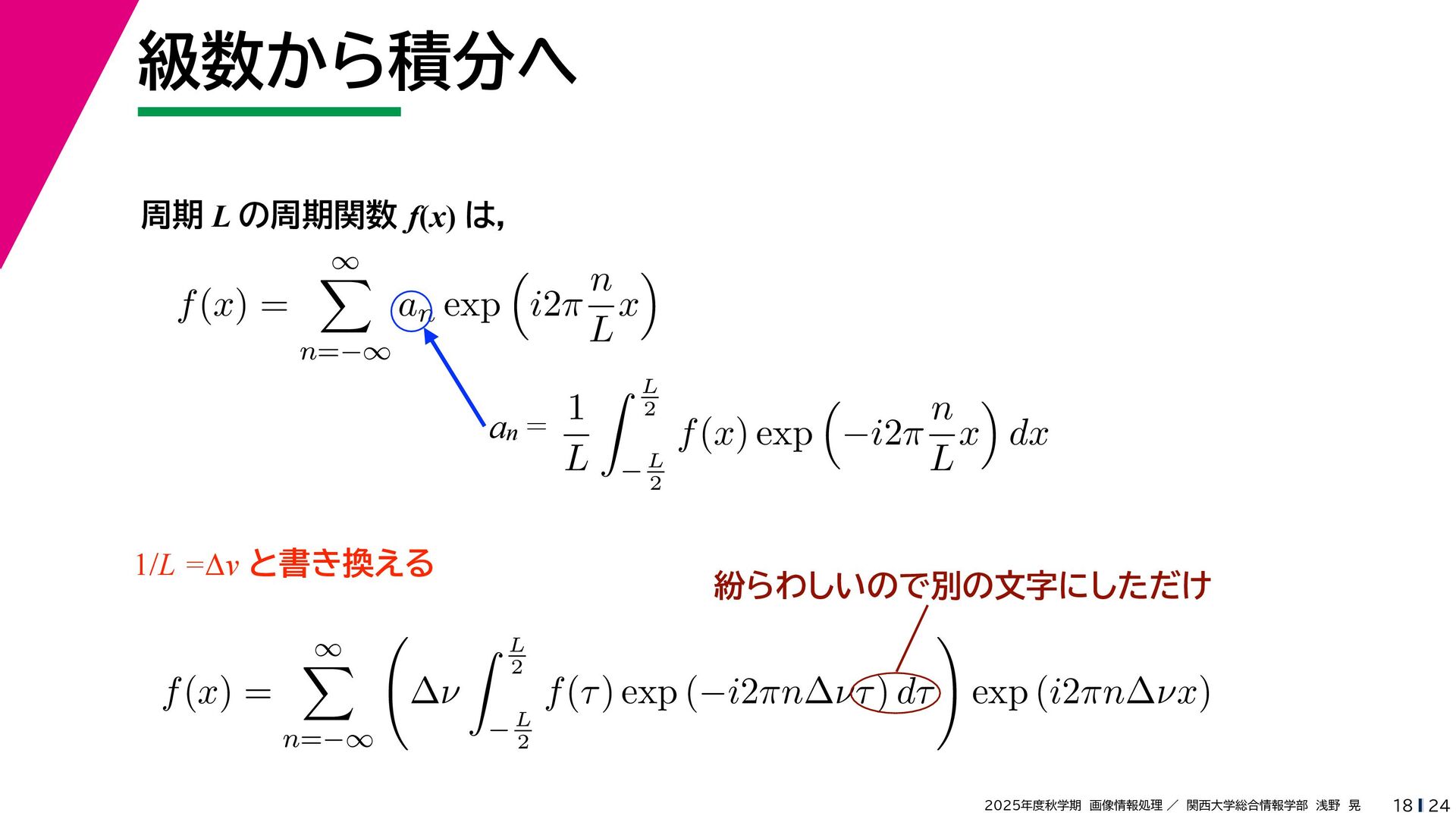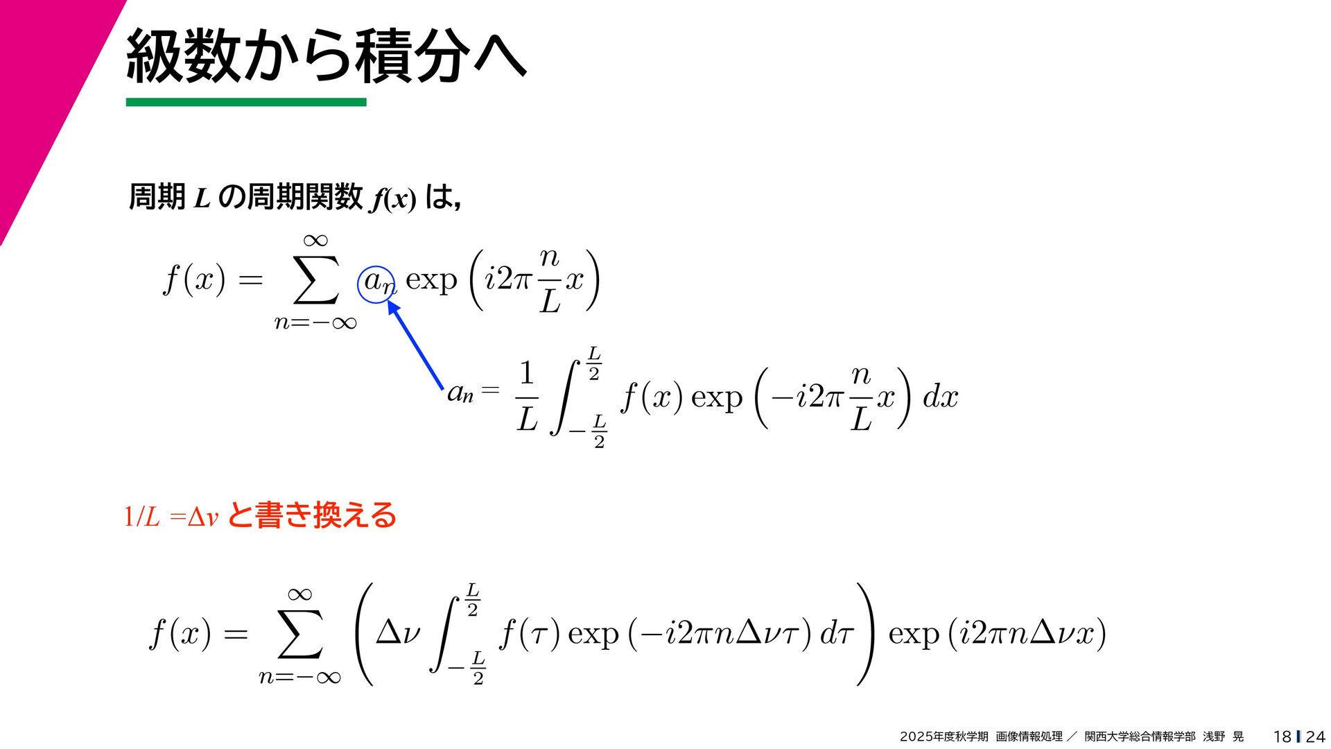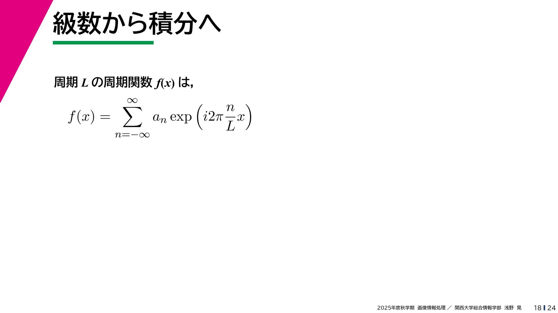 30. 24 2025年度秋学期 画像情報処理 / 関西大学総合情報学部 浅野 晃 級数から積分へ 18 周期 L の周期関数 f(x) は,