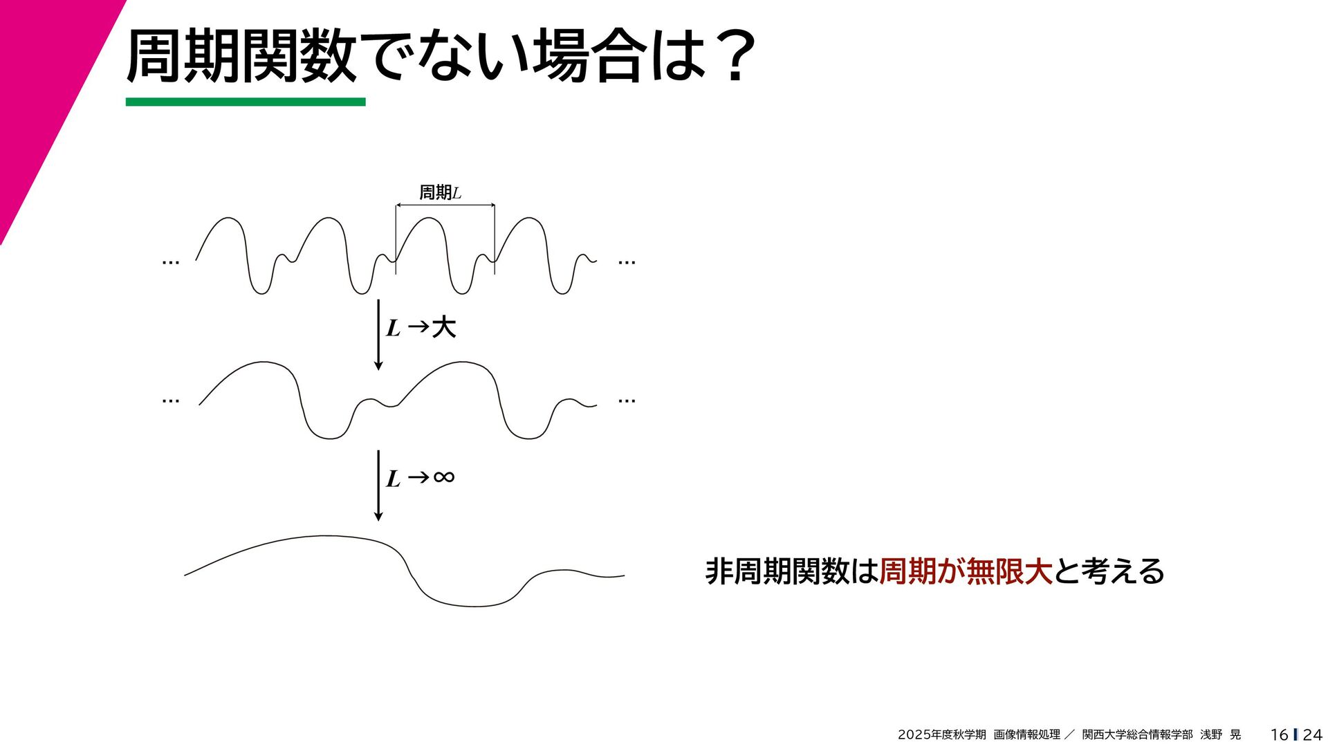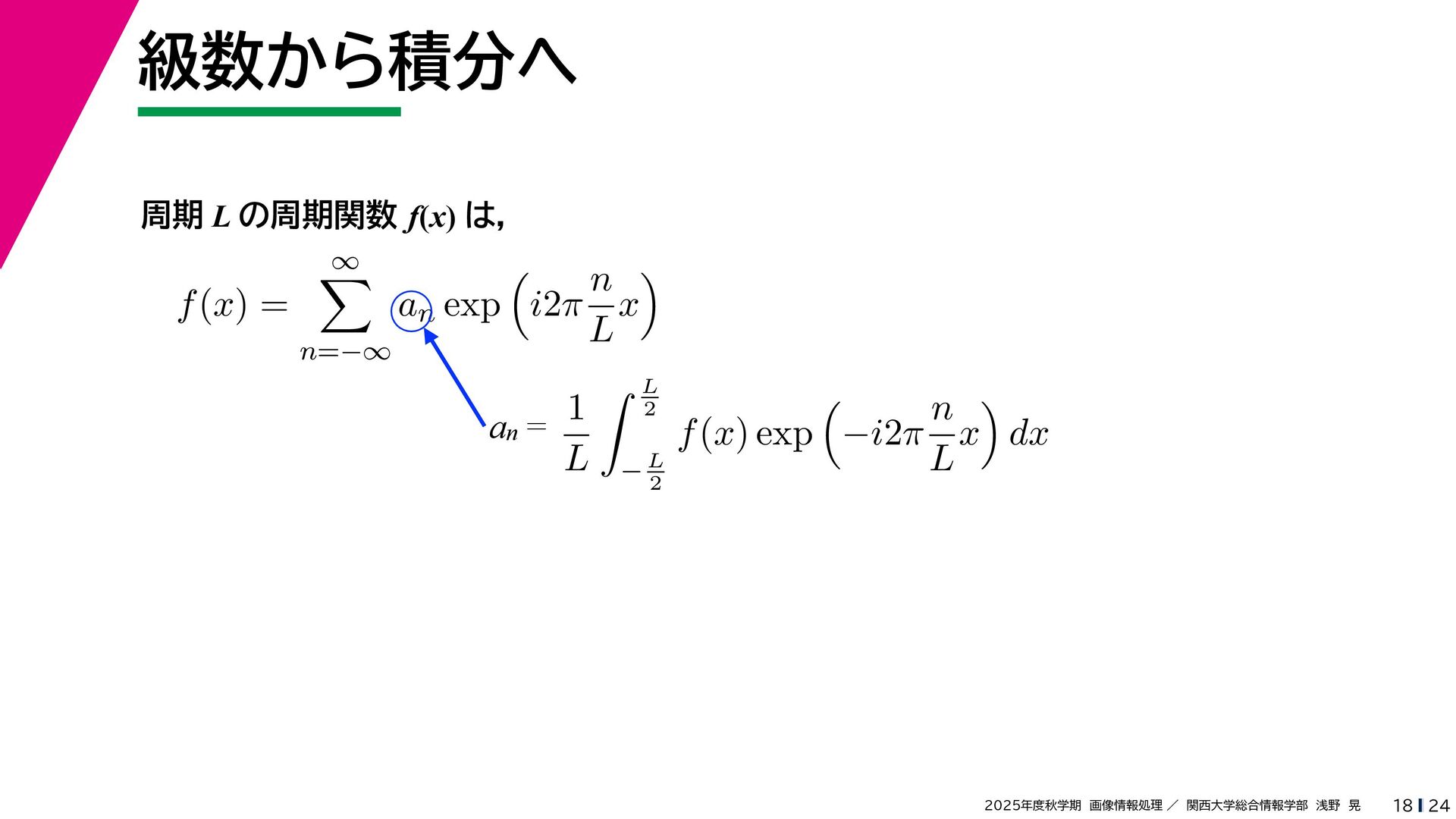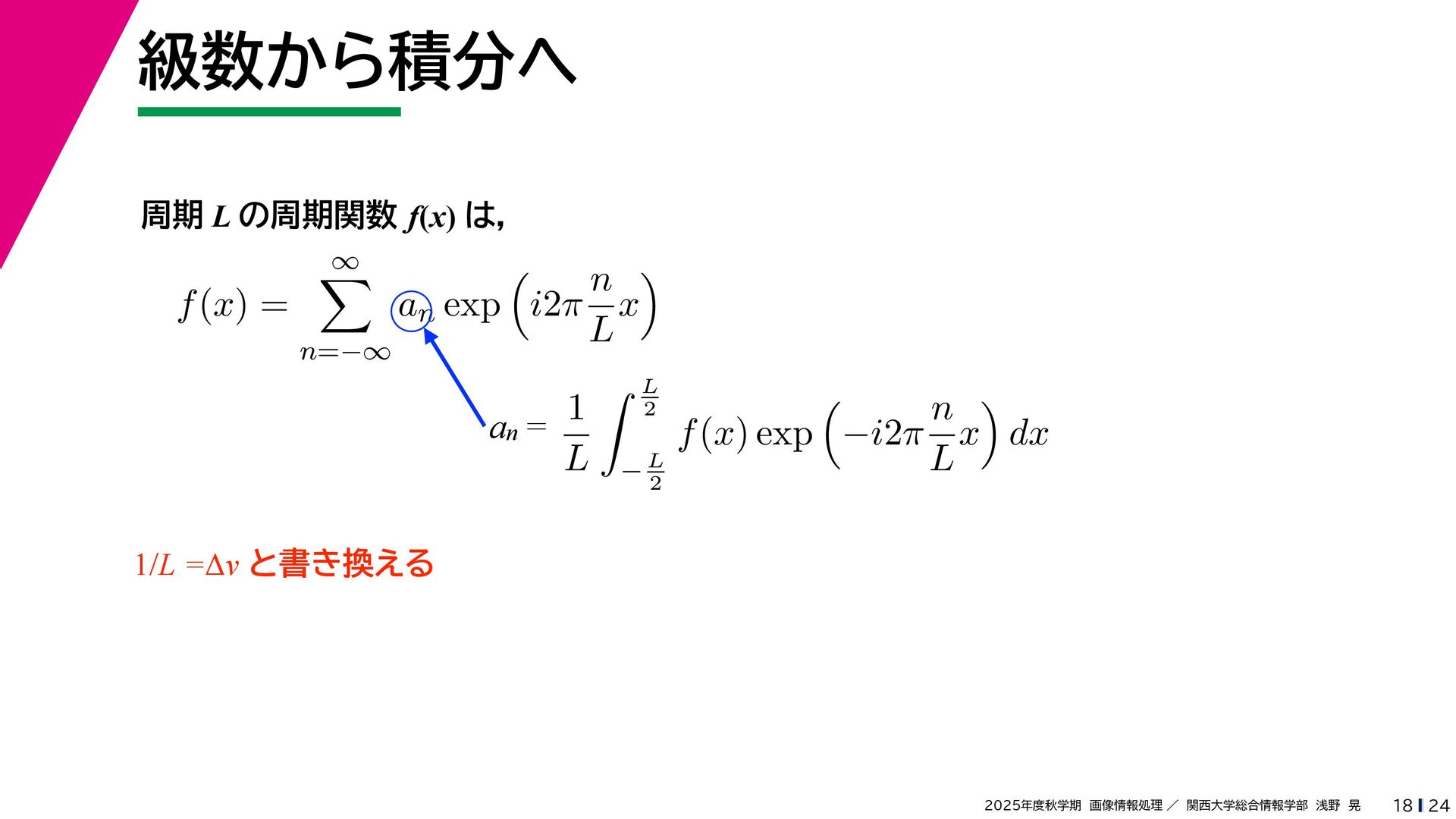 30. 24 2025年度秋学期 画像情報処理 / 関西大学総合情報学部 浅野 晃 級数から積分へ 18 周期 L の周期関数 f(x) は,