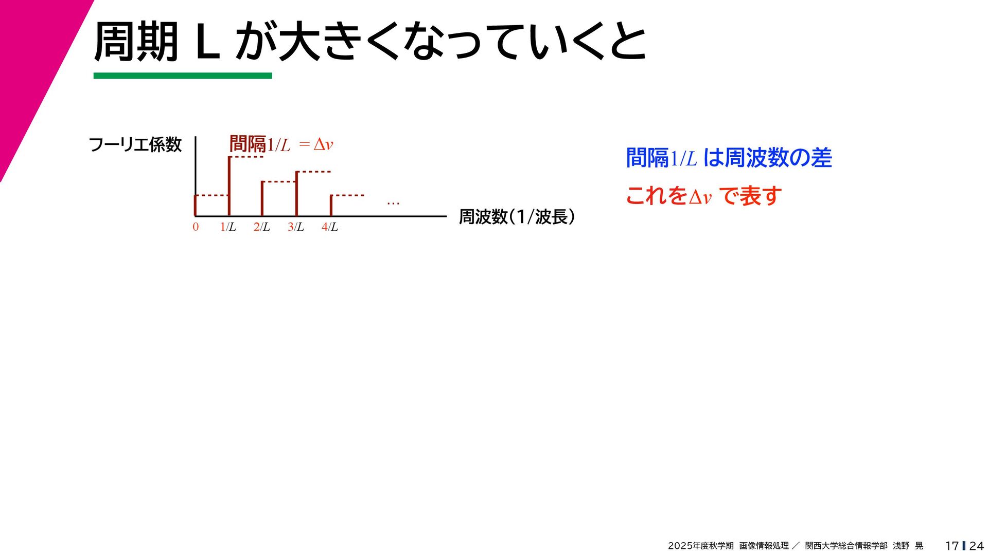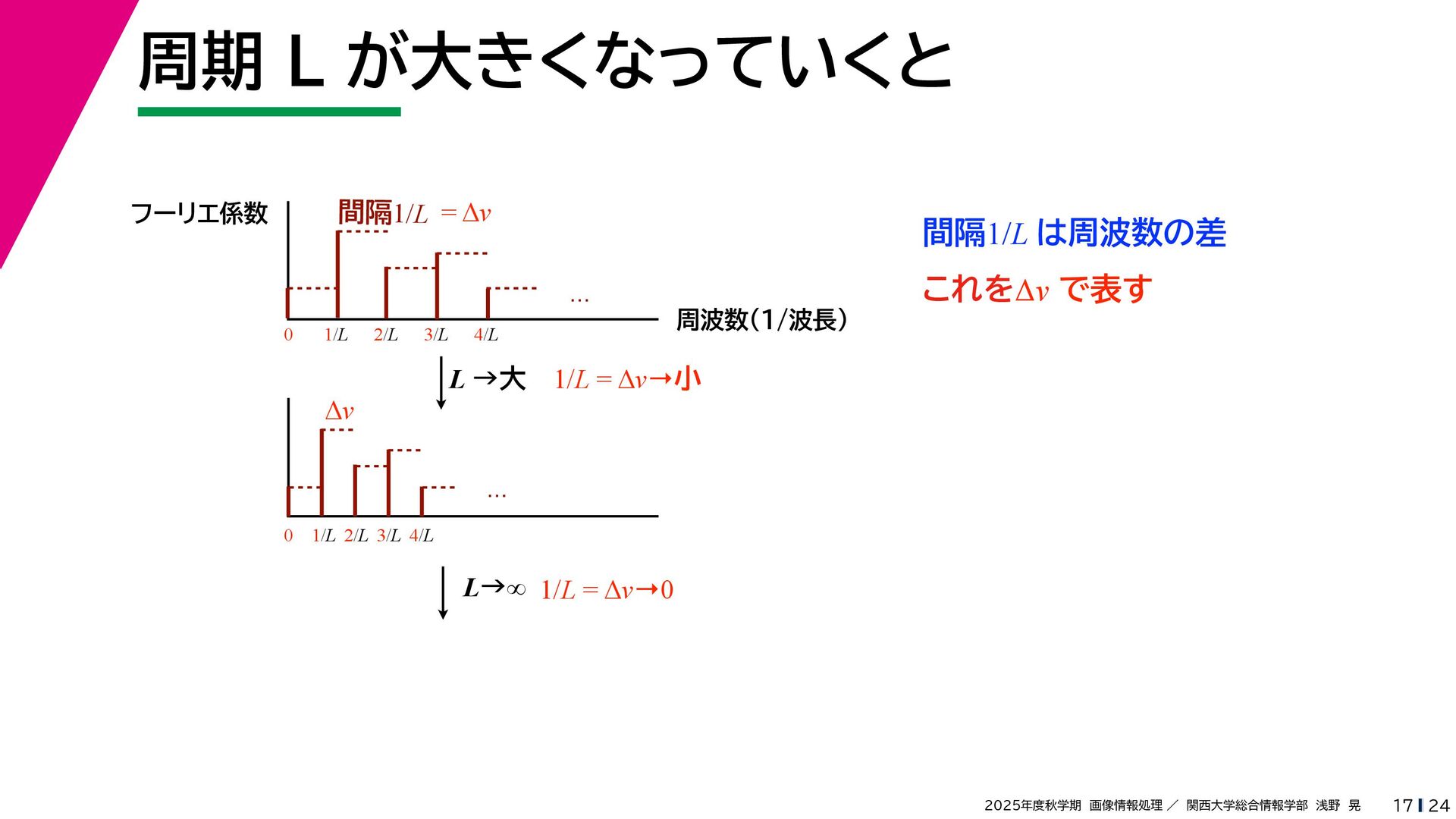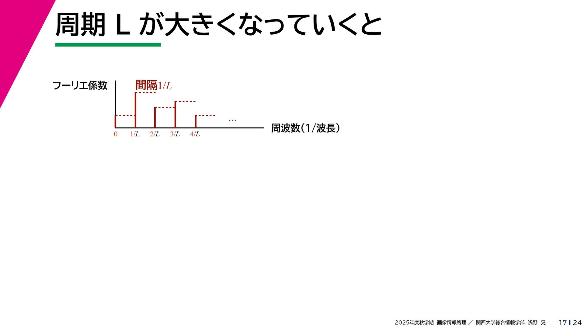 24. 24 2025年度秋学期 画像情報処理 / 関西大学総合情報学部 浅野 晃 周期 L が大きくなっていくと 17 フーリエ係数 周波数(1/波長) 1/L
