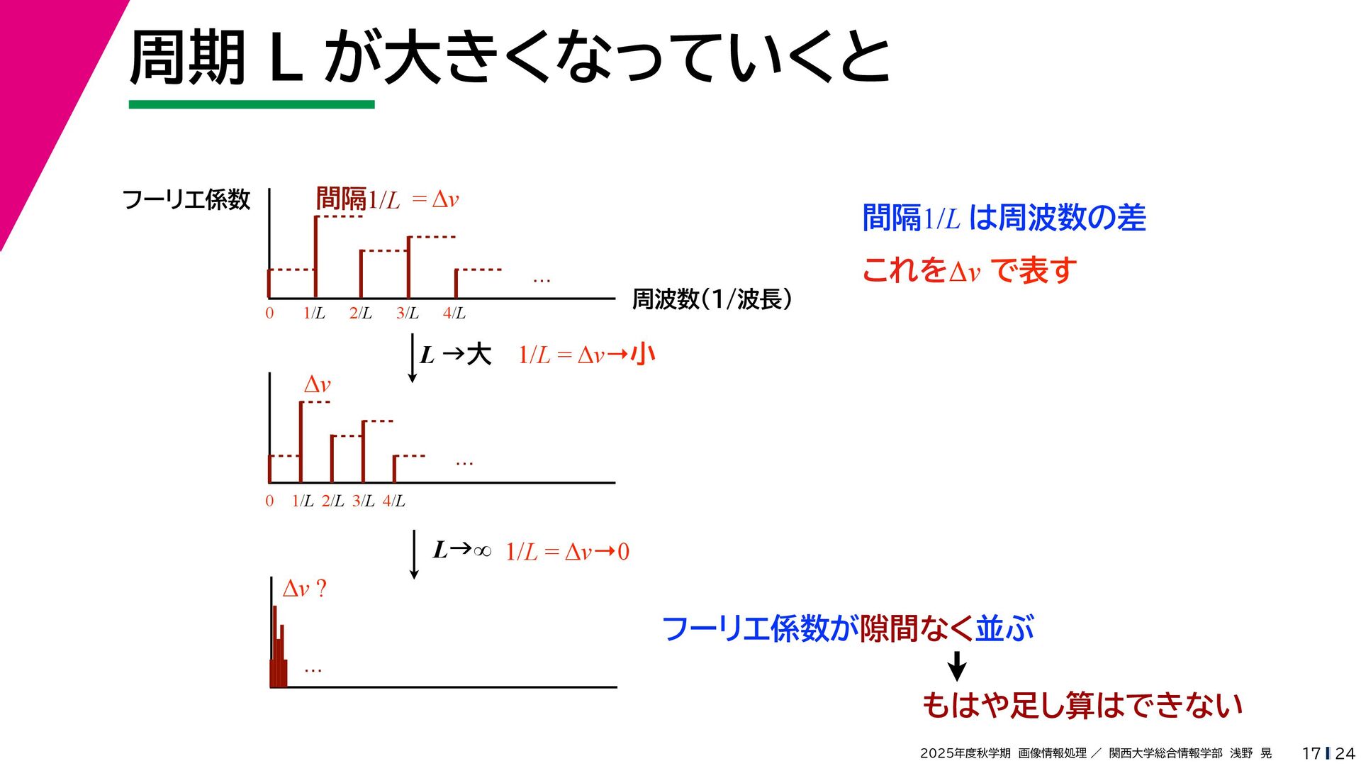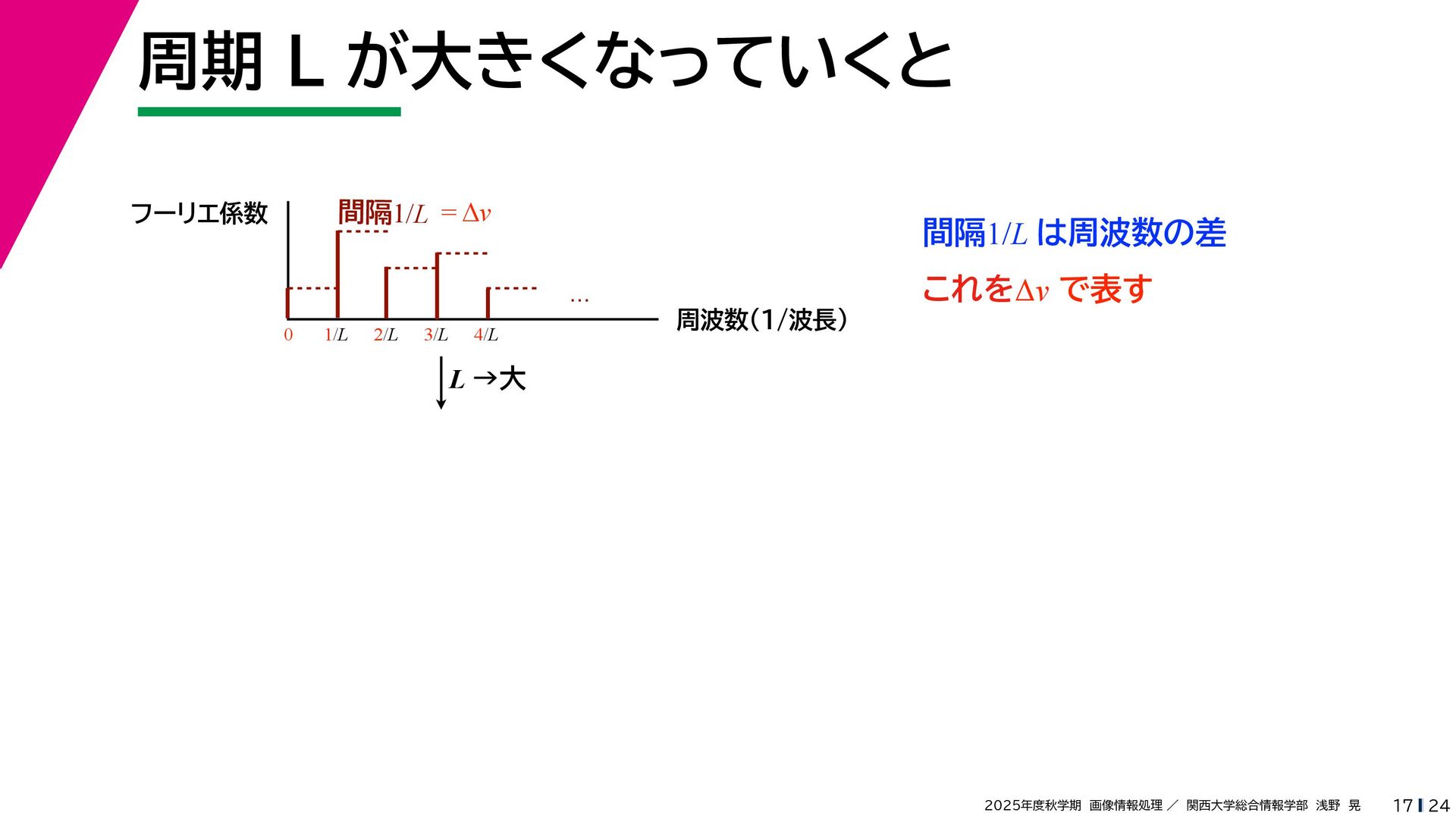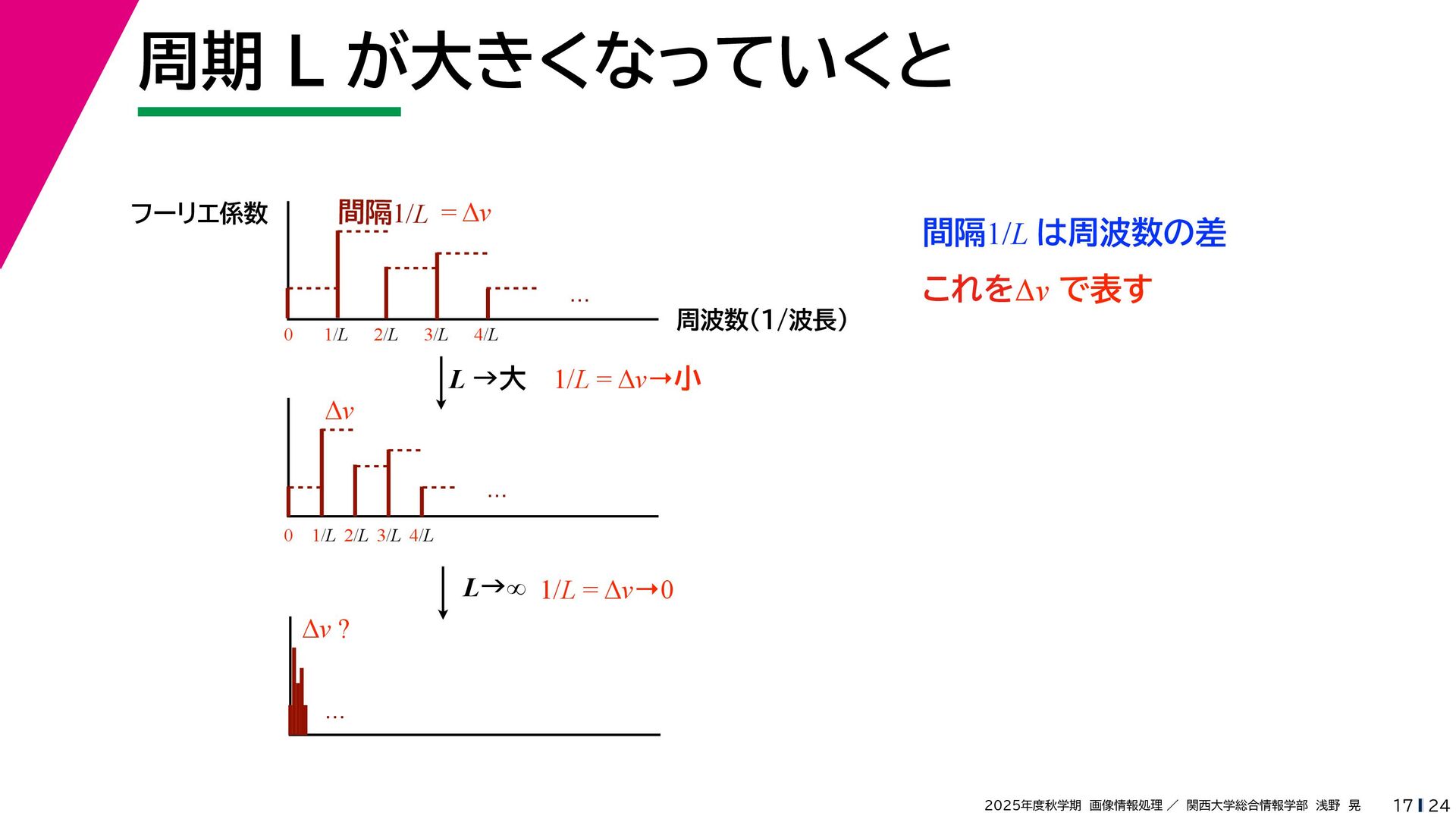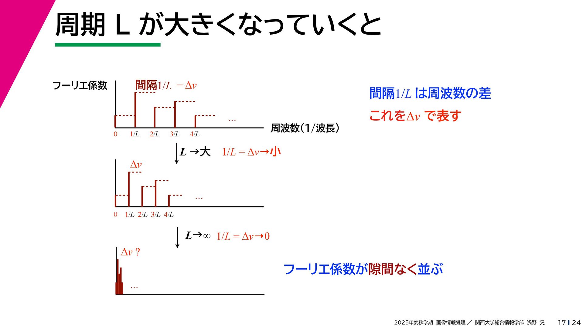 24. 24 2025年度秋学期 画像情報処理 / 関西大学総合情報学部 浅野 晃 周期 L が大きくなっていくと 17 フーリエ係数 周波数(1/波長) 1/L
