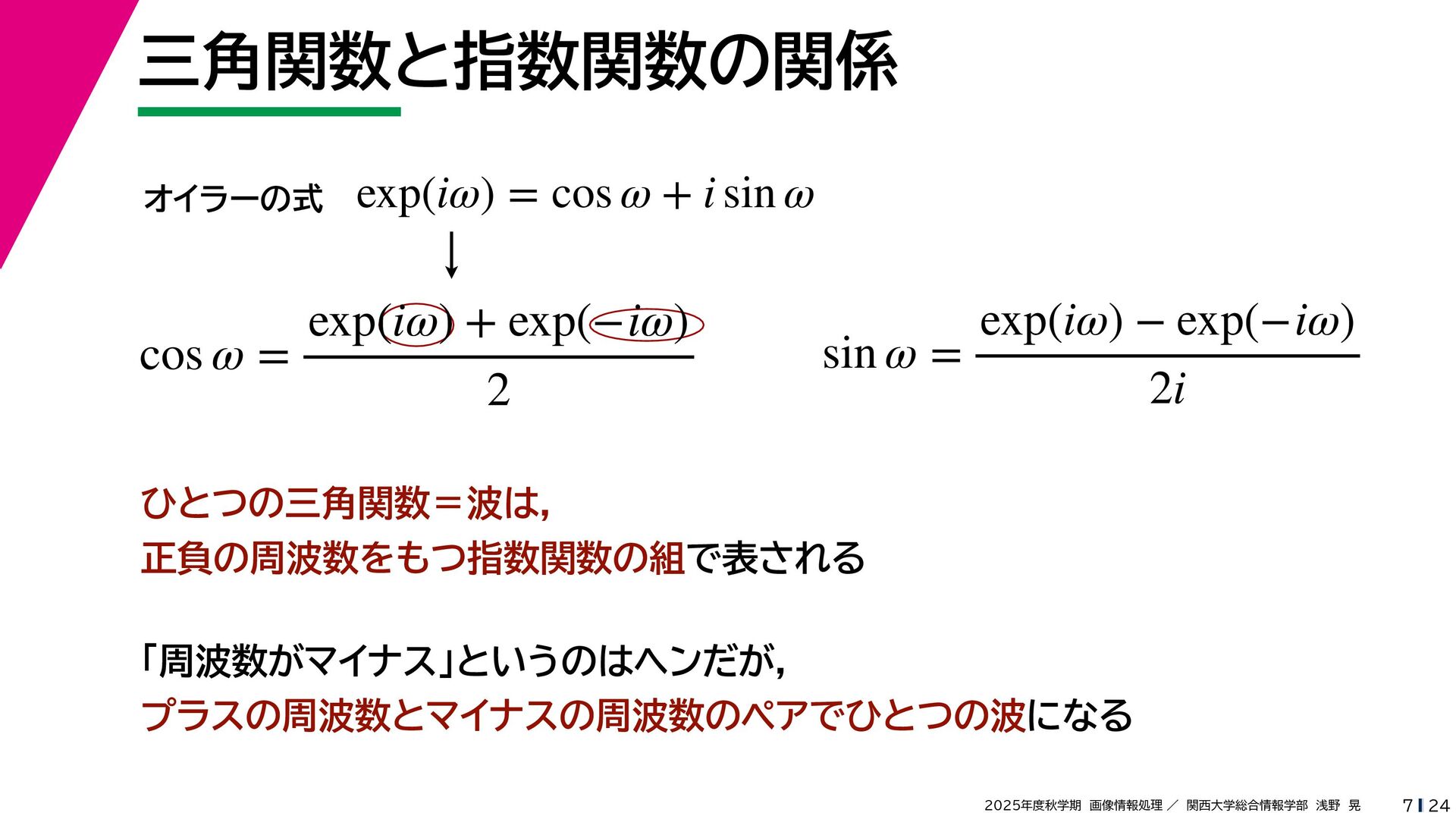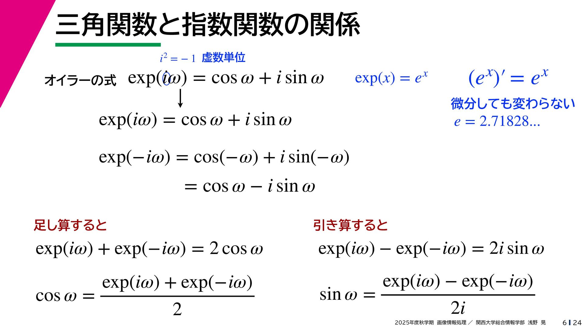 4. 24 2025年度秋学期 画像情報処理 / 関西大学総合情報学部 浅野 晃 三角関数と指数関数の関係 6 オイラーの式 i2 = − 1
