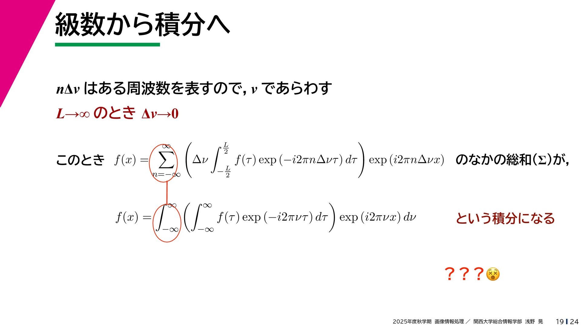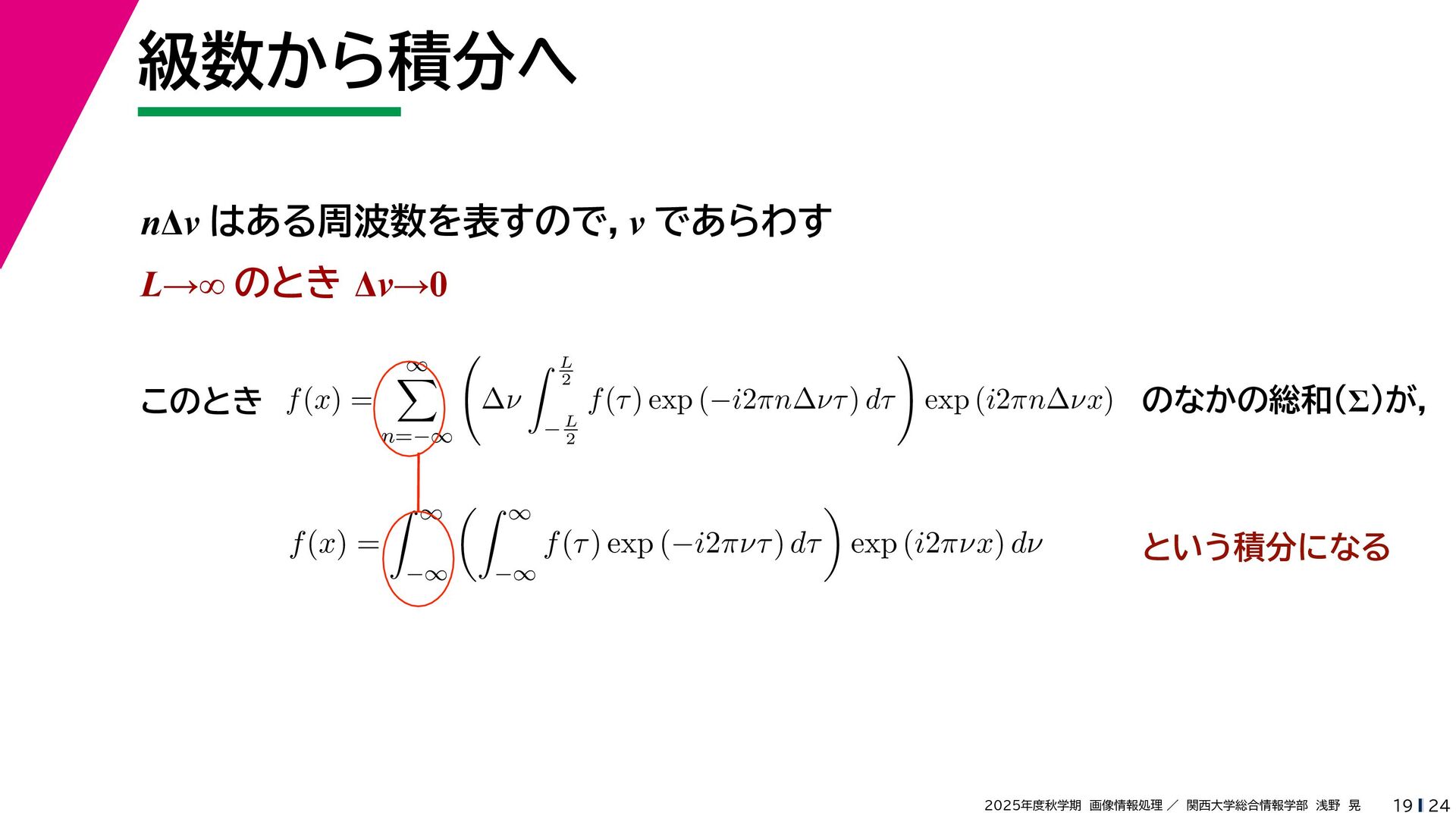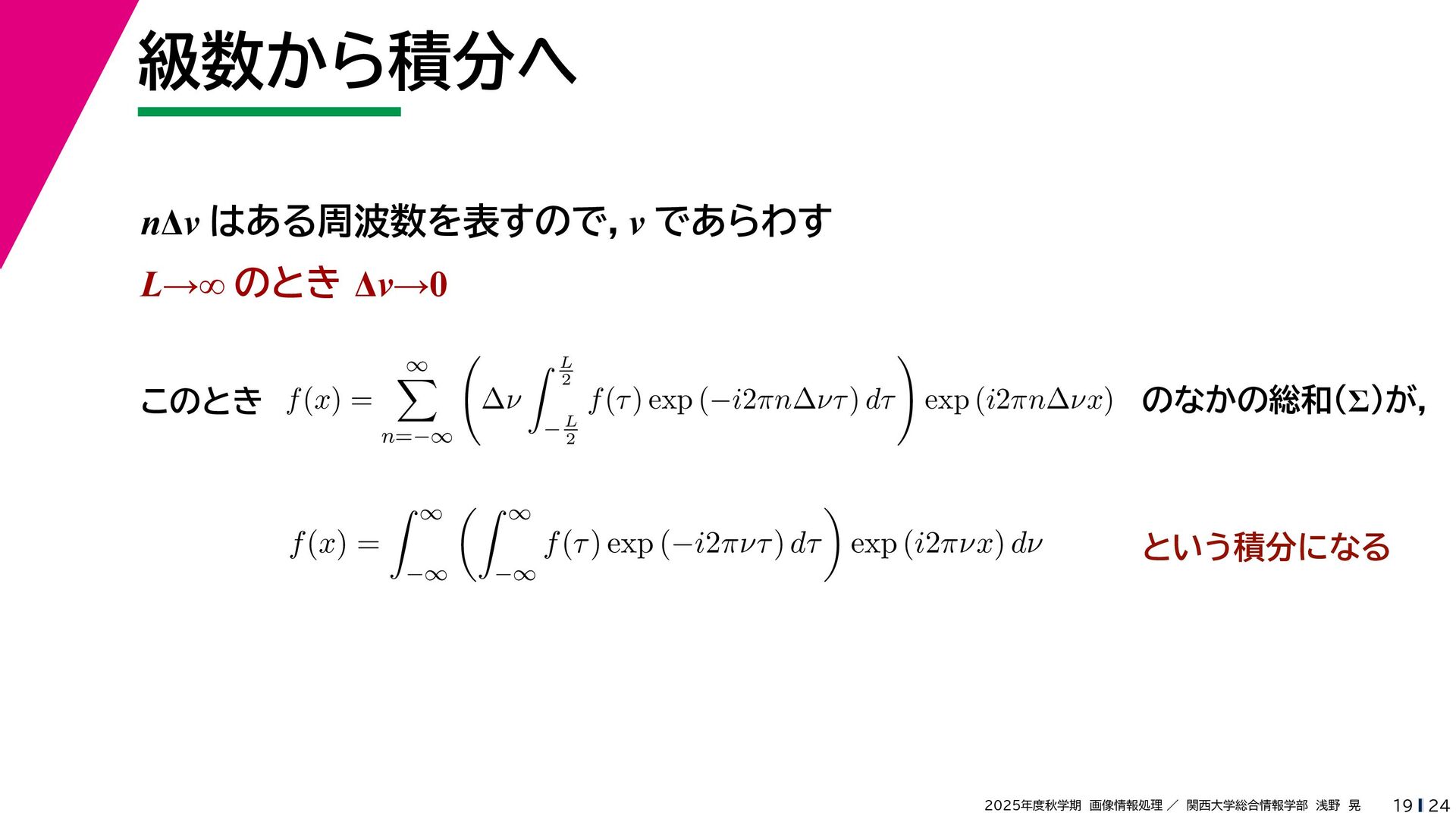 32. 24 2025年度秋学期 画像情報処理 / 関西大学総合情報学部 浅野 晃 級数から積分へ 19 nΔν はある周波数を表すので,ν であらわす L→∞ のとき