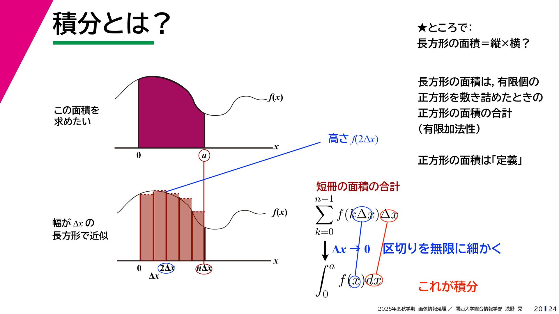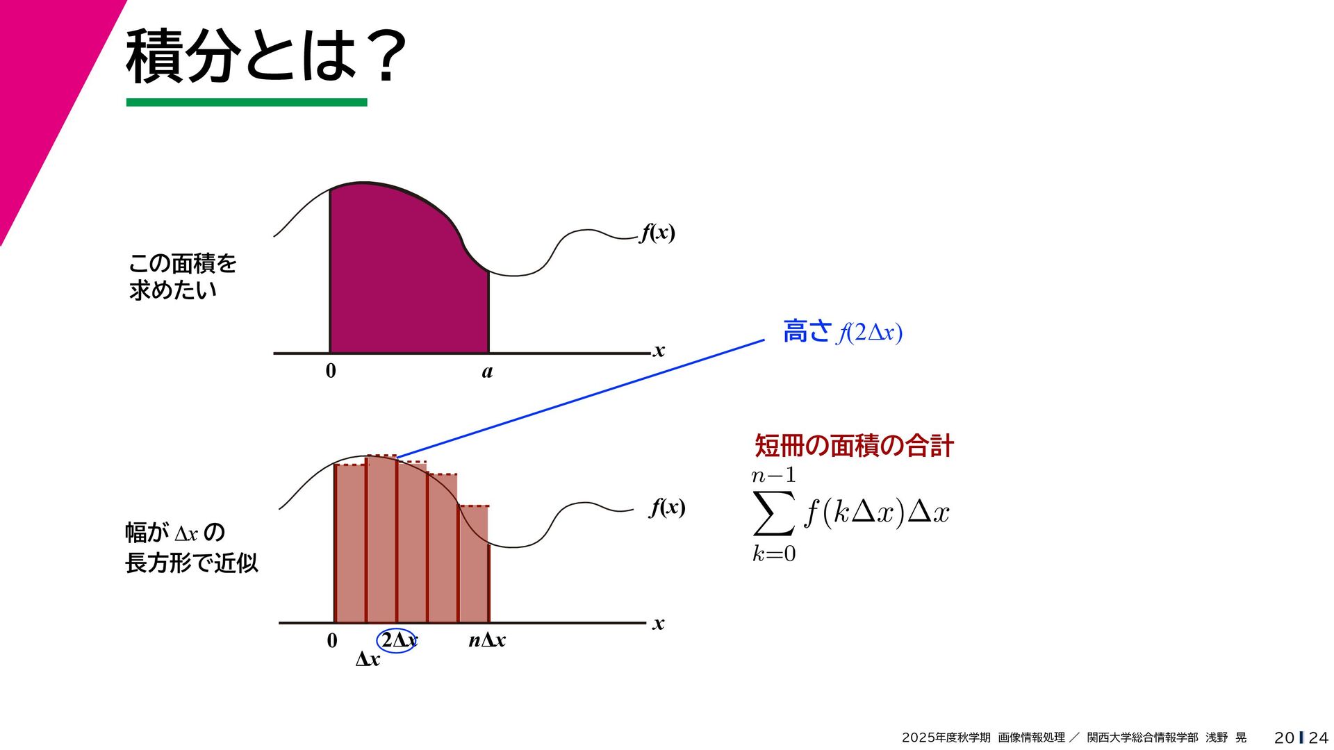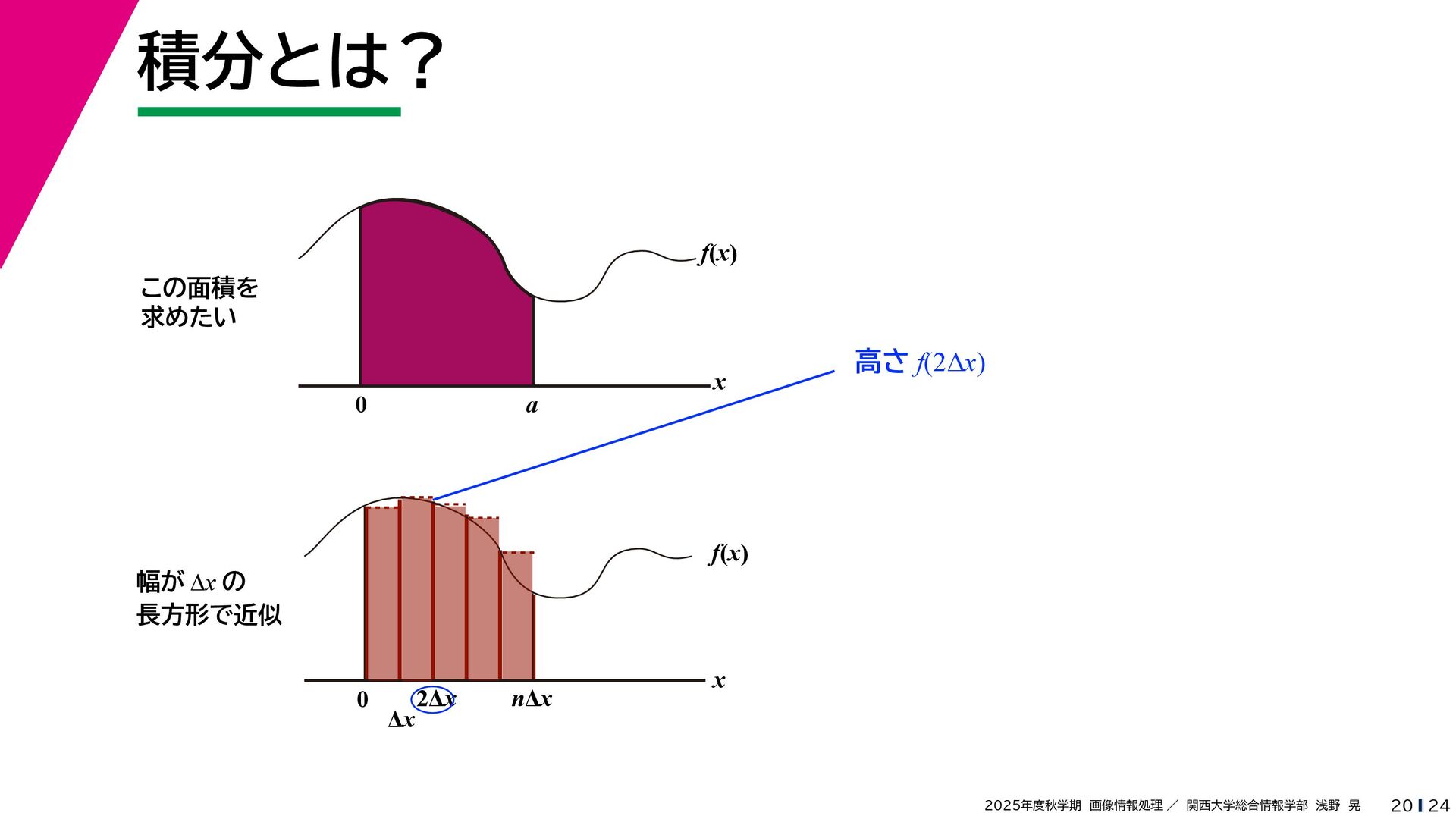 40. 24 2025年度秋学期 画像情報処理 / 関西大学総合情報学部 浅野 晃 積分とは? 20 この面積を 求めたい Δx → 0 区切りを無限に細かく