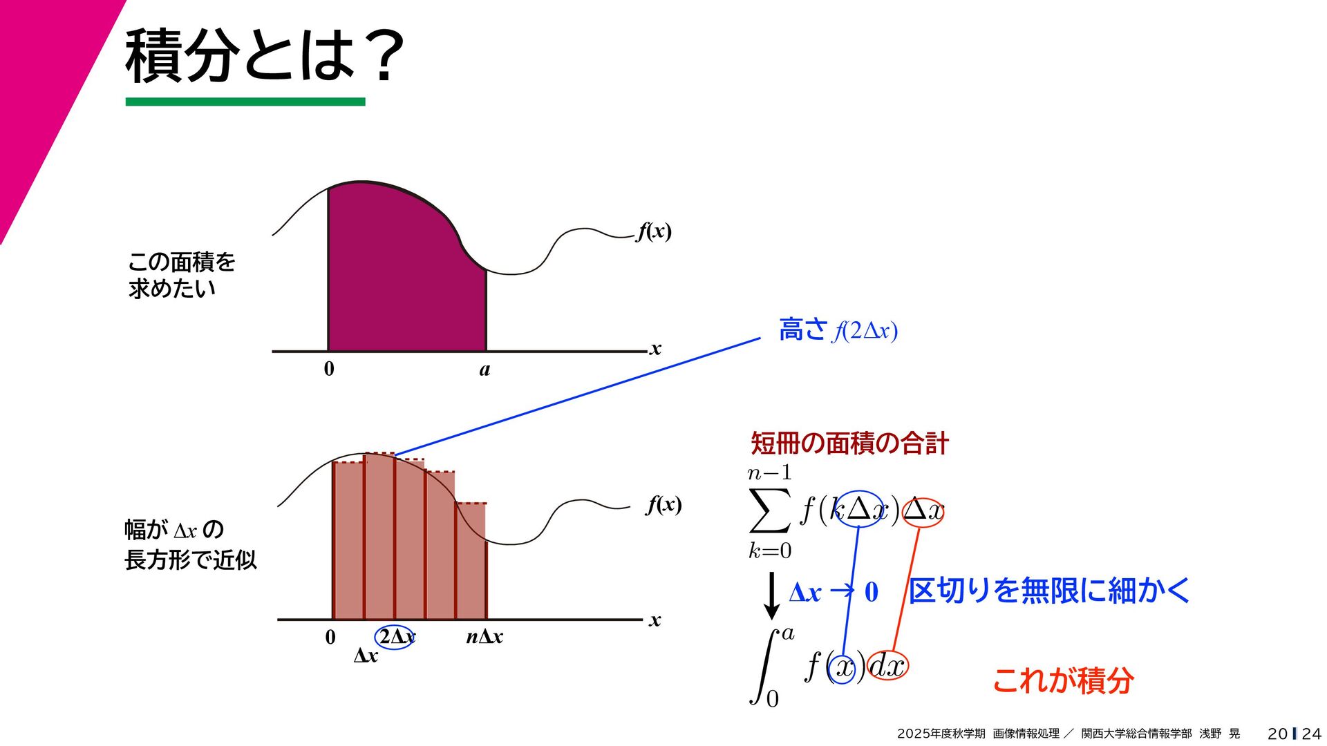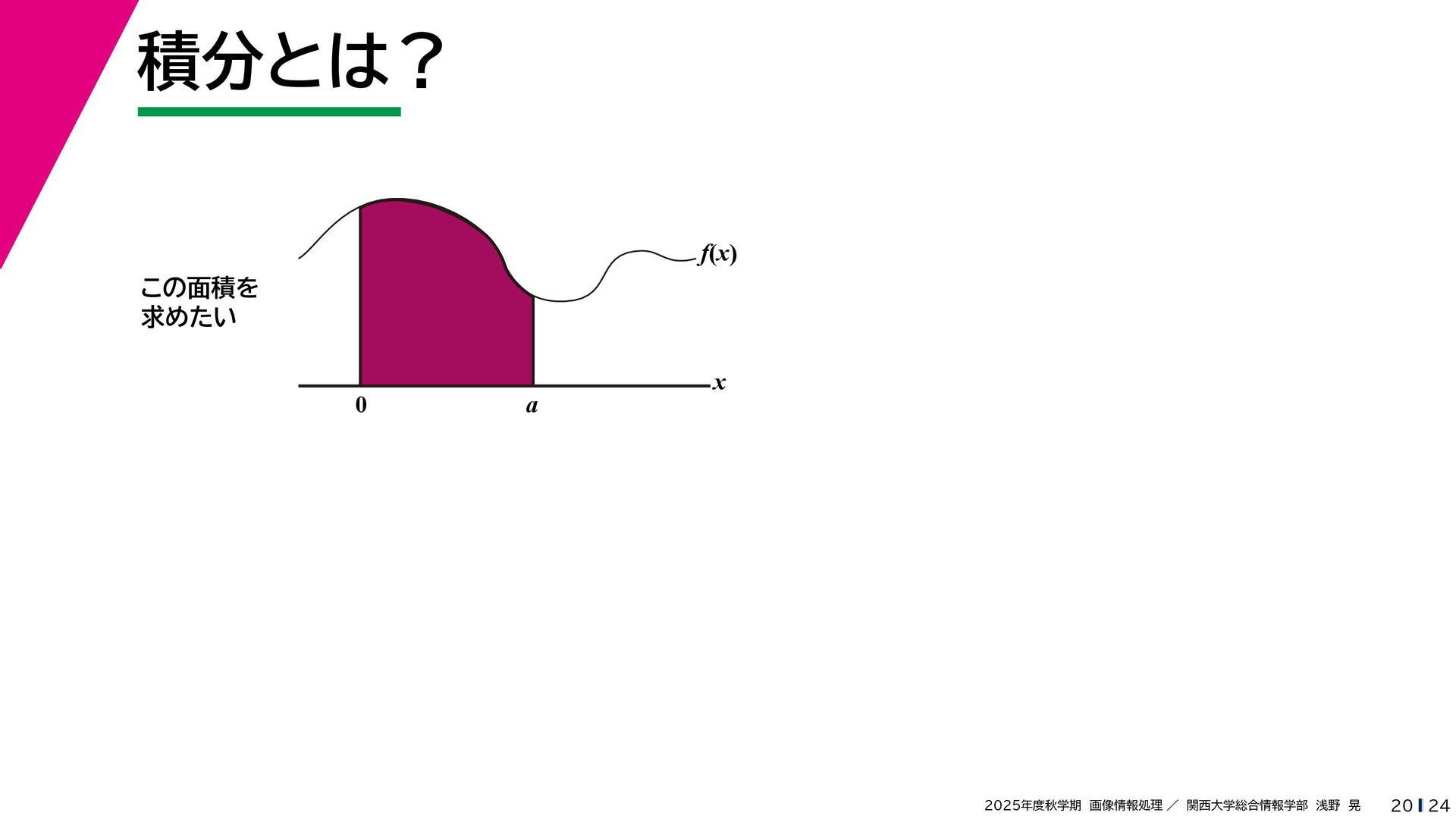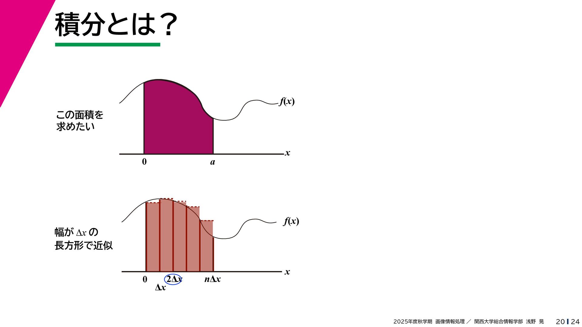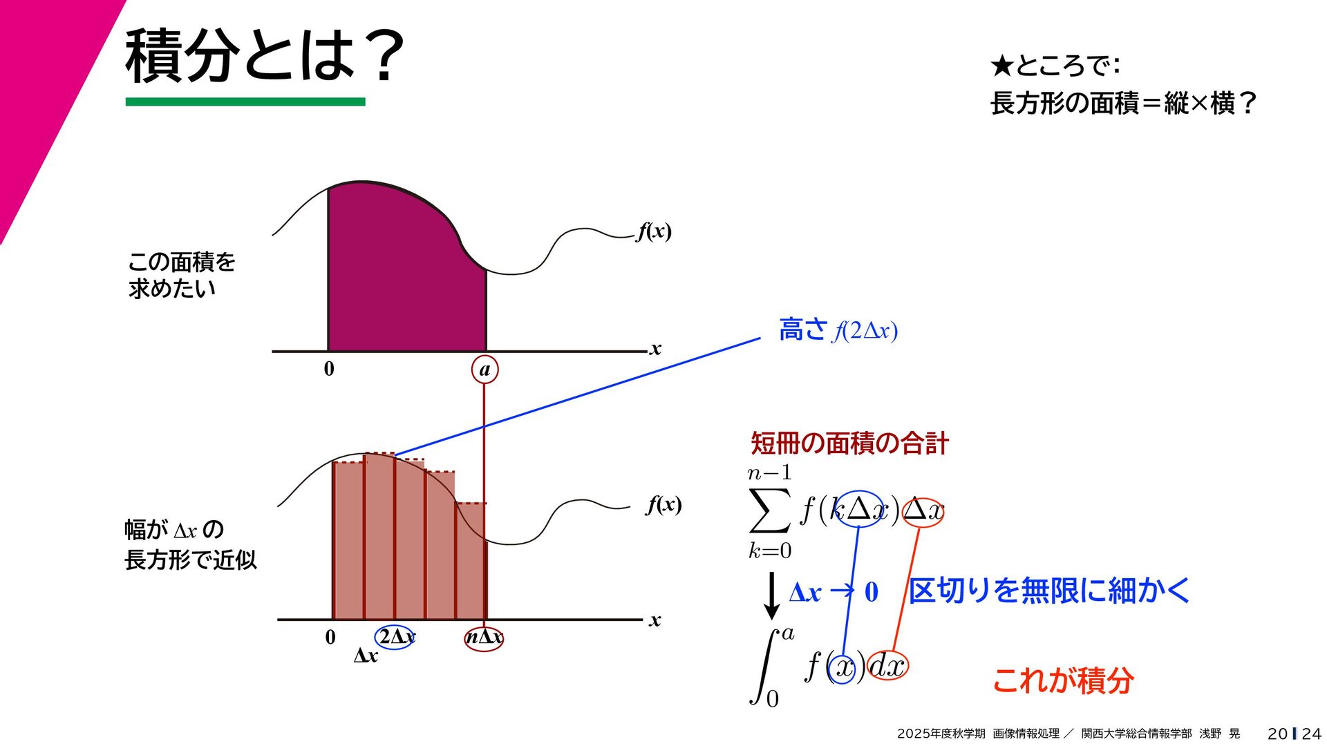 40. 24 2025年度秋学期 画像情報処理 / 関西大学総合情報学部 浅野 晃 積分とは? 20 この面積を 求めたい Δx → 0 区切りを無限に細かく