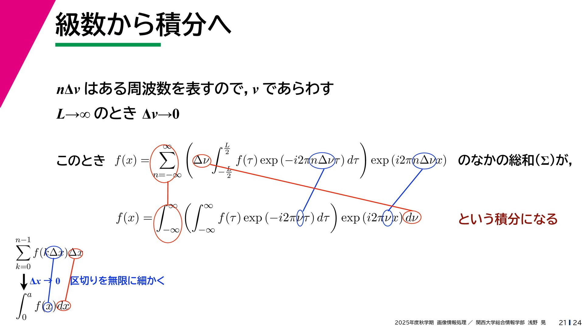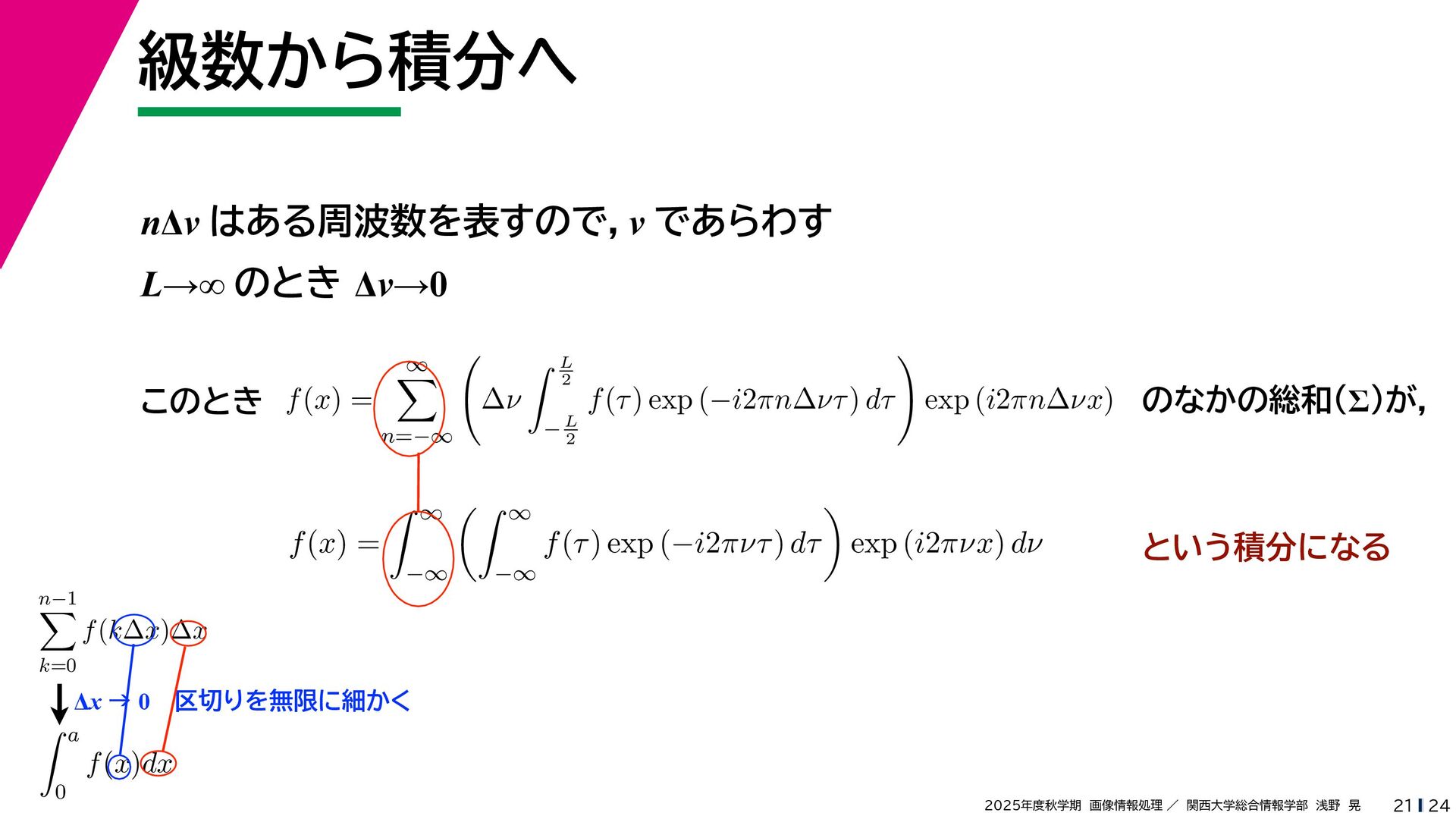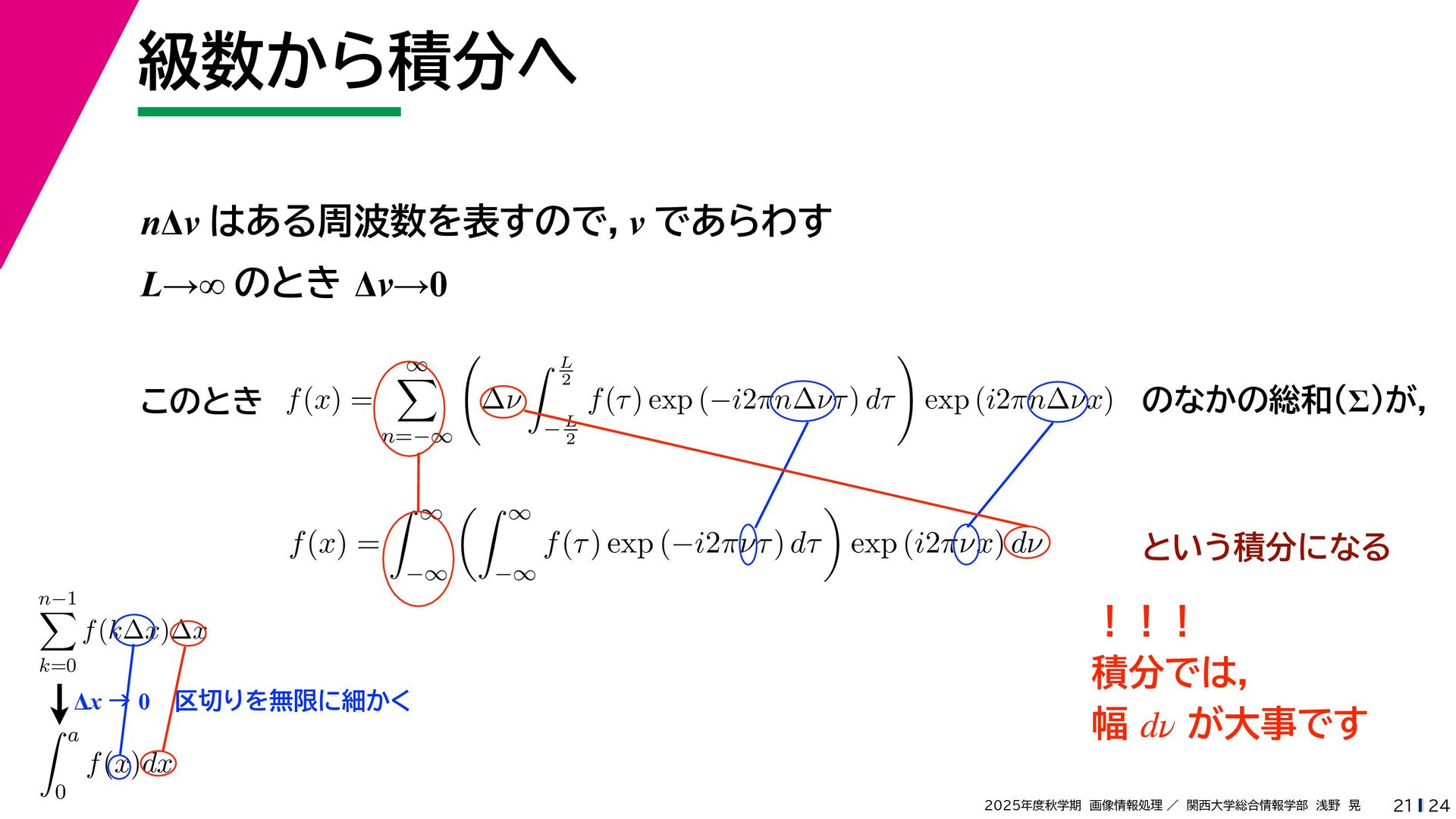 46. 24 2025年度秋学期 画像情報処理 / 関西大学総合情報学部 浅野 晃 級数から積分へ 21 nΔν はある周波数を表すので,ν であらわす L→∞ のとき