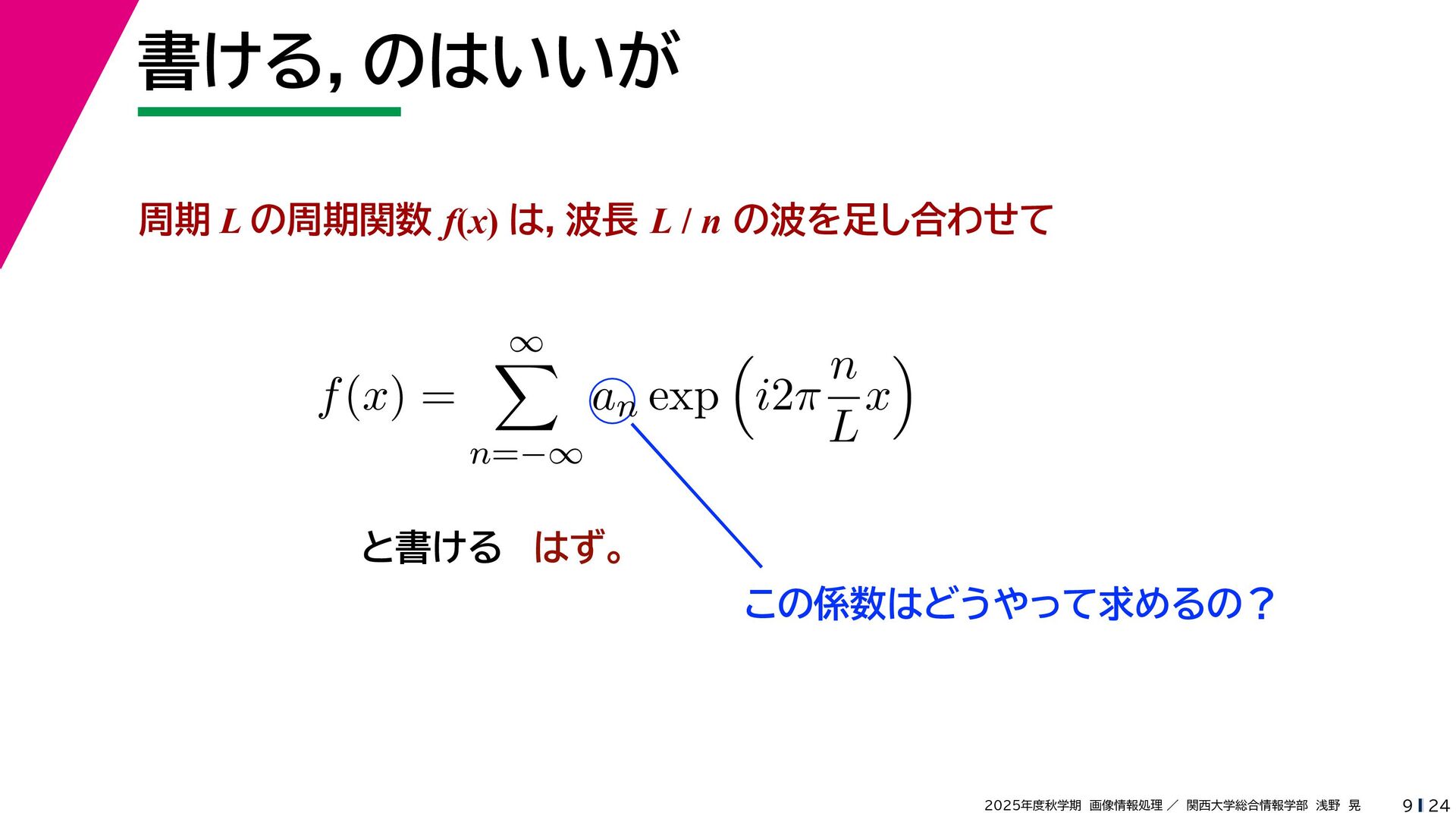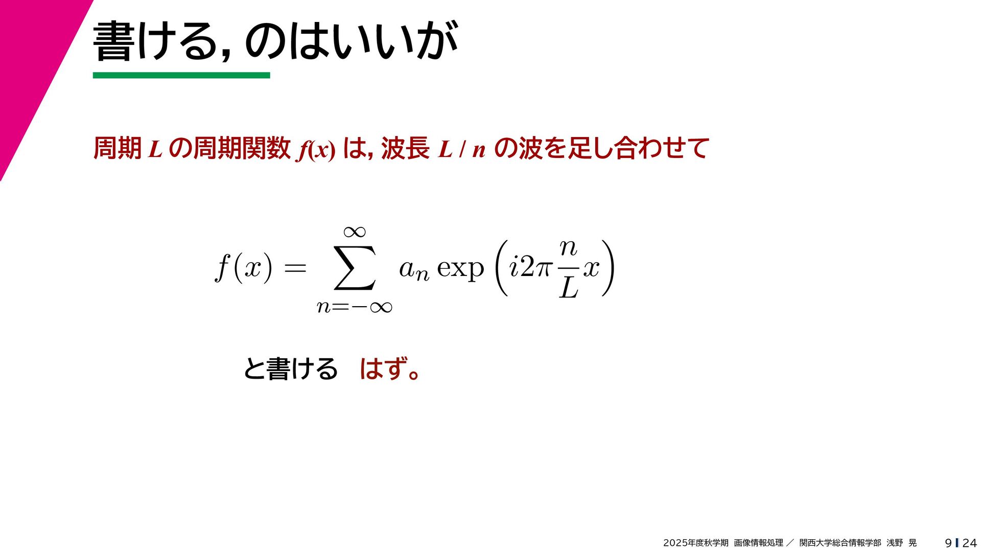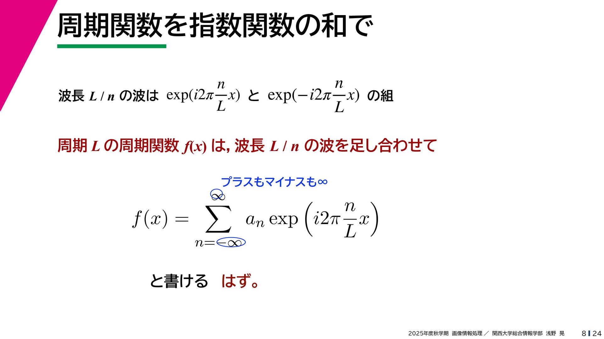 5. 24 2025年度秋学期 画像情報処理 / 関西大学総合情報学部 浅野 晃 周期関数を指数関数の和で 8 周期 L の周期関数 f(x) は,波長