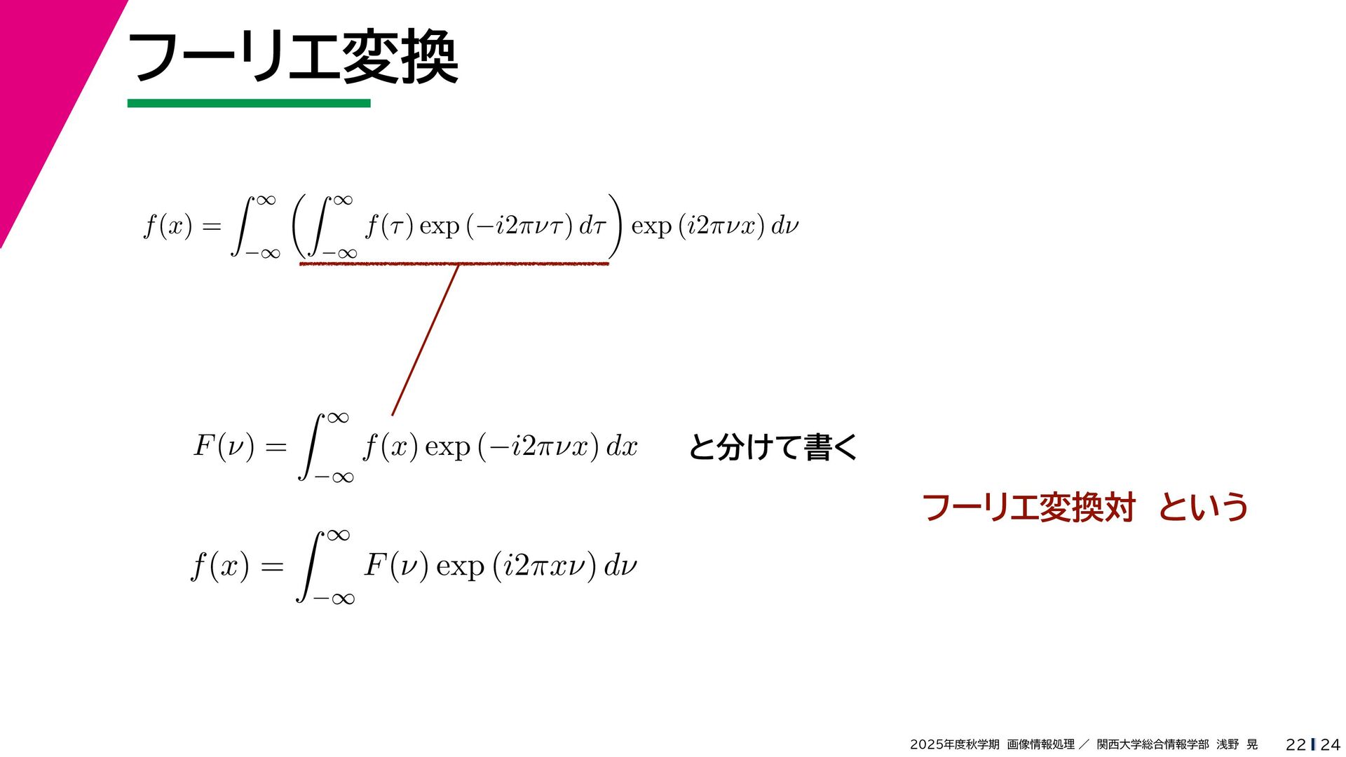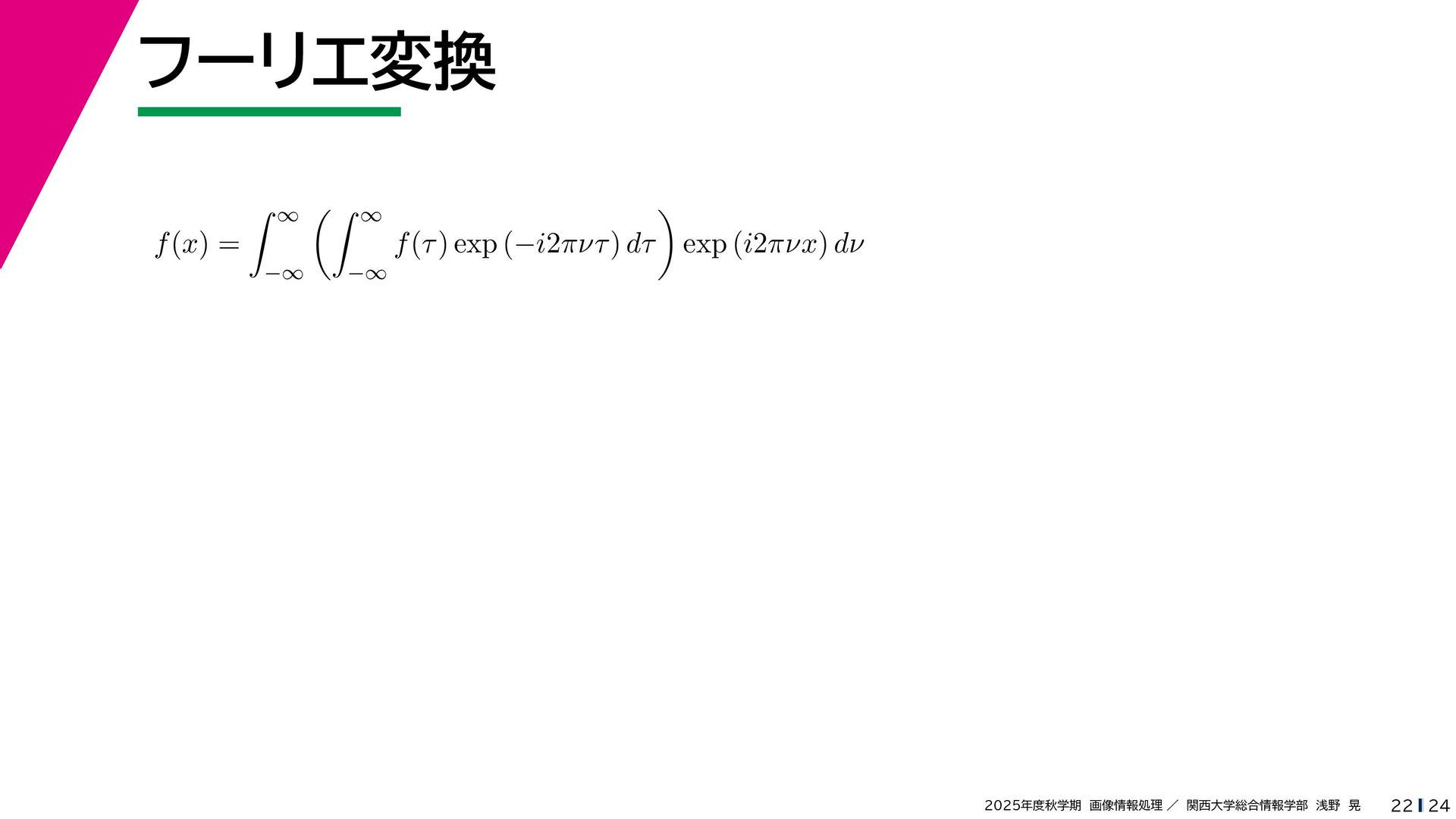 49. 24 2025年度秋学期 画像情報処理 / 関西大学総合情報学部 浅野 晃 フーリエ変換 22 f(x) = ∞ −∞ ∞