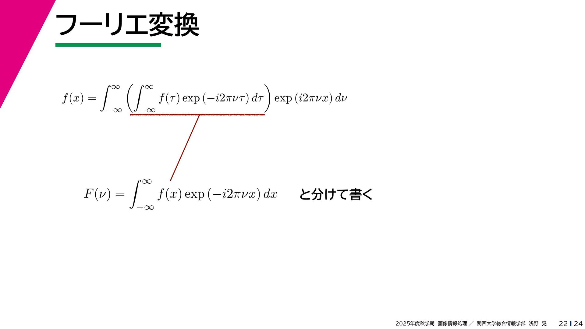 50. 24 2025年度秋学期 画像情報処理 / 関西大学総合情報学部 浅野 晃 フーリエ変換 22 f(x) = ∞ −∞ ∞