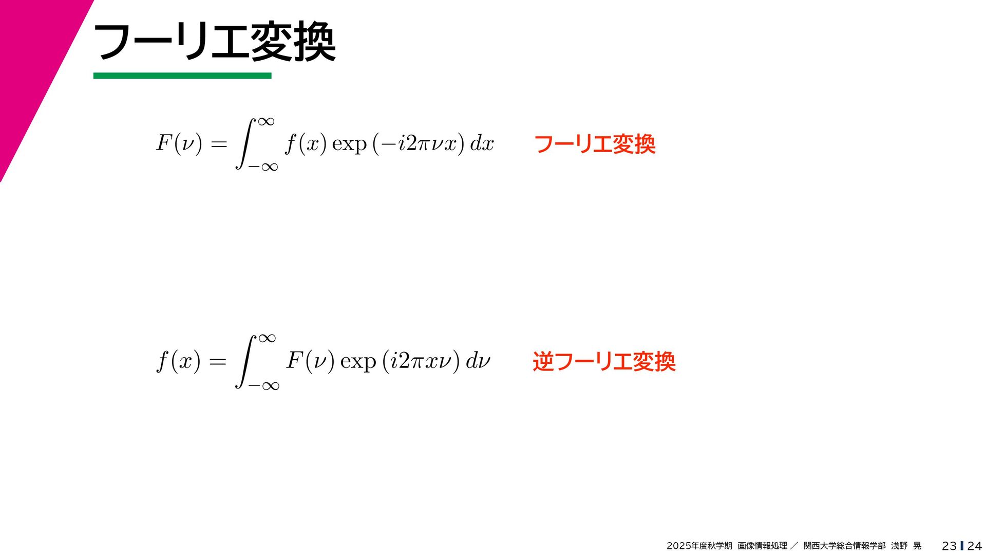 52. 24 2025年度秋学期 画像情報処理 / 関西大学総合情報学部 浅野 晃 フーリエ変換 23 F(ν) = ∞ −∞ f(x)