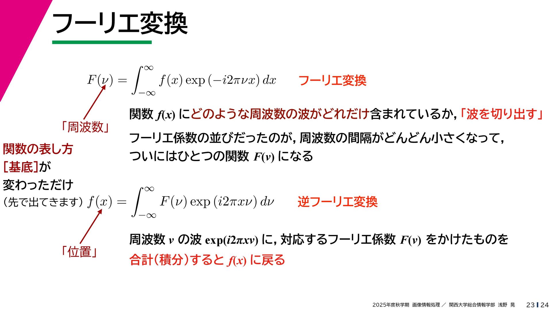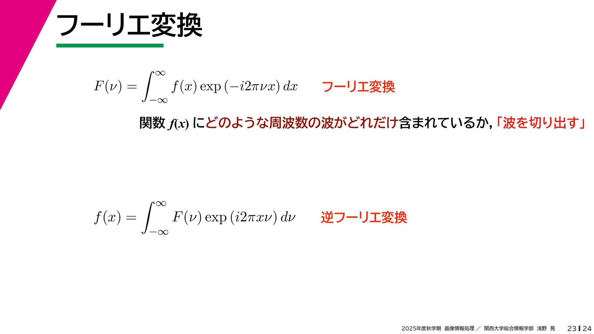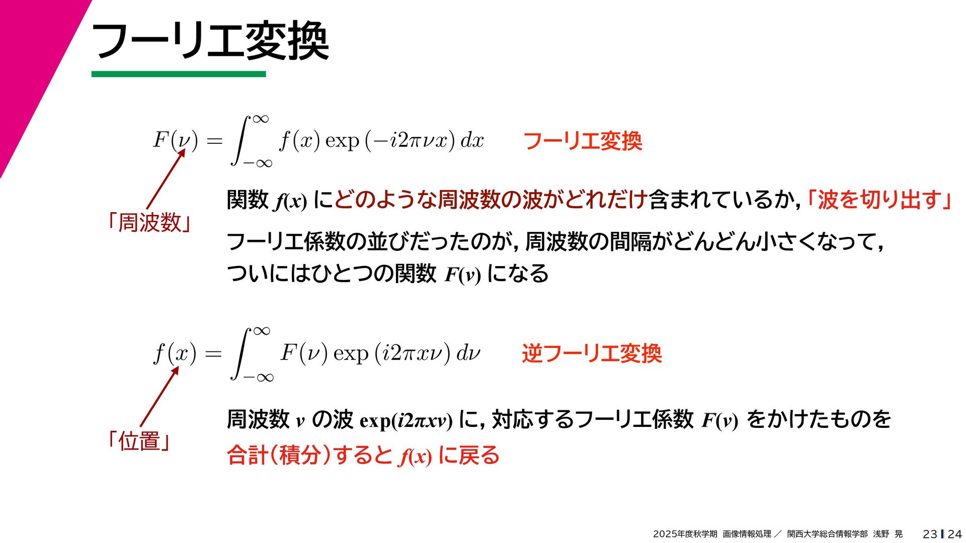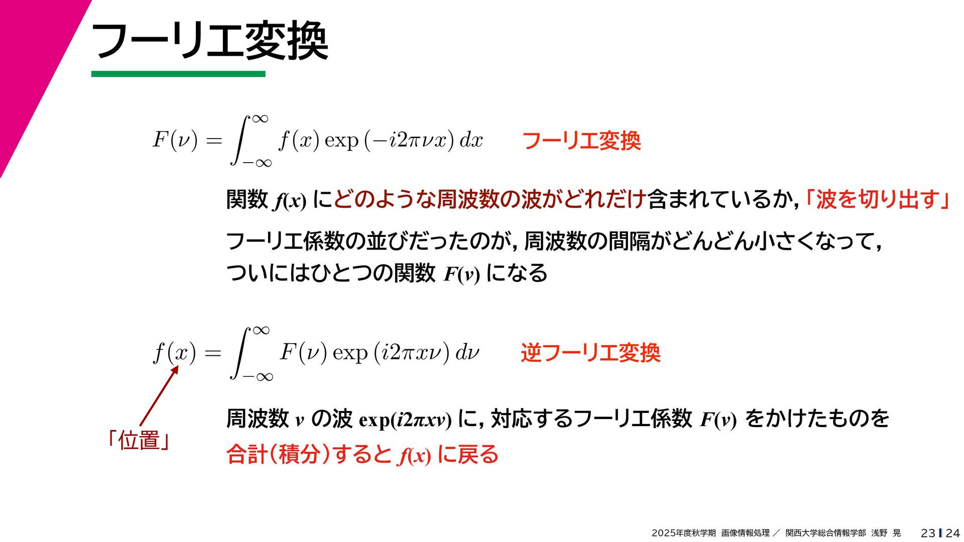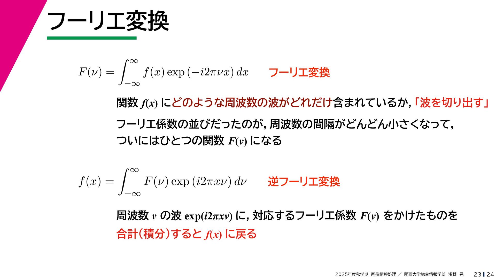 54. 24 2025年度秋学期 画像情報処理 / 関西大学総合情報学部 浅野 晃 フーリエ変換 23 F(ν) = ∞ −∞ f(x)