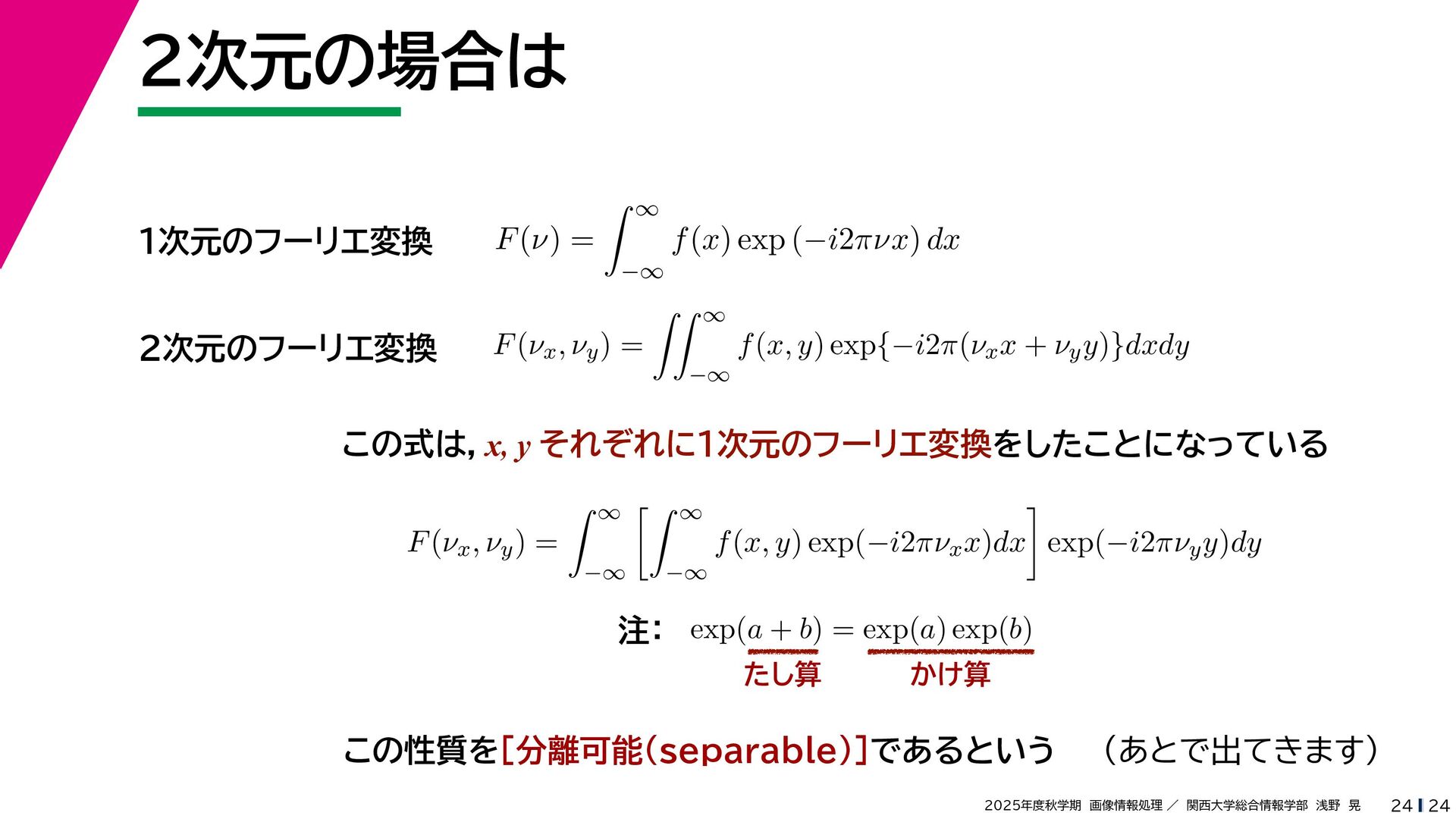 58. 24 2025年度秋学期 画像情報処理 / 関西大学総合情報学部 浅野 晃 2次元の場合は 24 F(ν) = ∞ −∞ f(x)