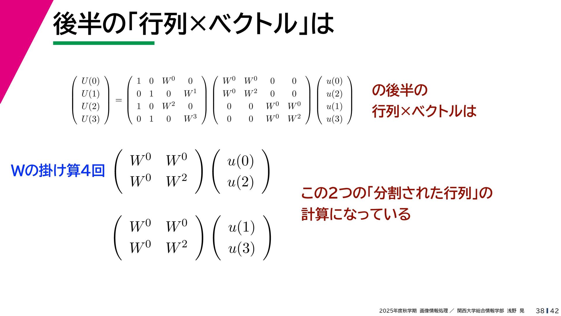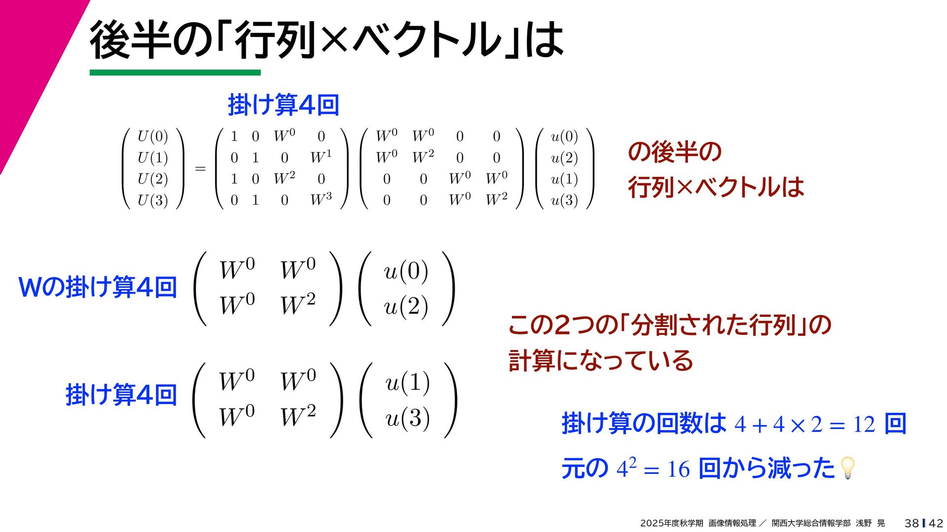 U(0) U(1) U(2) U(3) = 1 0 W0 0 0 1 0 W1 1 0 W2 0 0 1 0 W3 W0 W0 0 0 W0 W2 0 0 0 0 W0 W0 0 0 W0 W2 u(0) u(2) u(1) u(3) W0 W0 W0 W2 u(0) u(2) W0 W0 W0 W2 u(1) u(3) この2つの「分割された行列」の 計算になっている Wの掛け算4回 掛け算4回 掛け算4回 掛け算の回数は 回 4 + 4 × 2 = 12 元の 回から減った💡💡 42 = 16