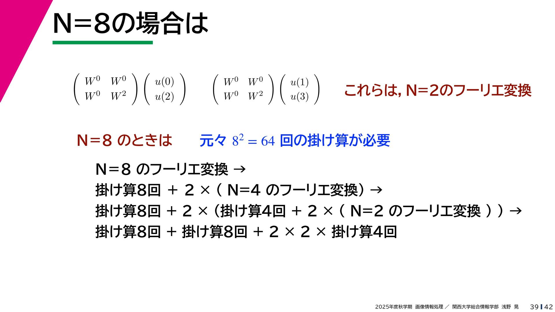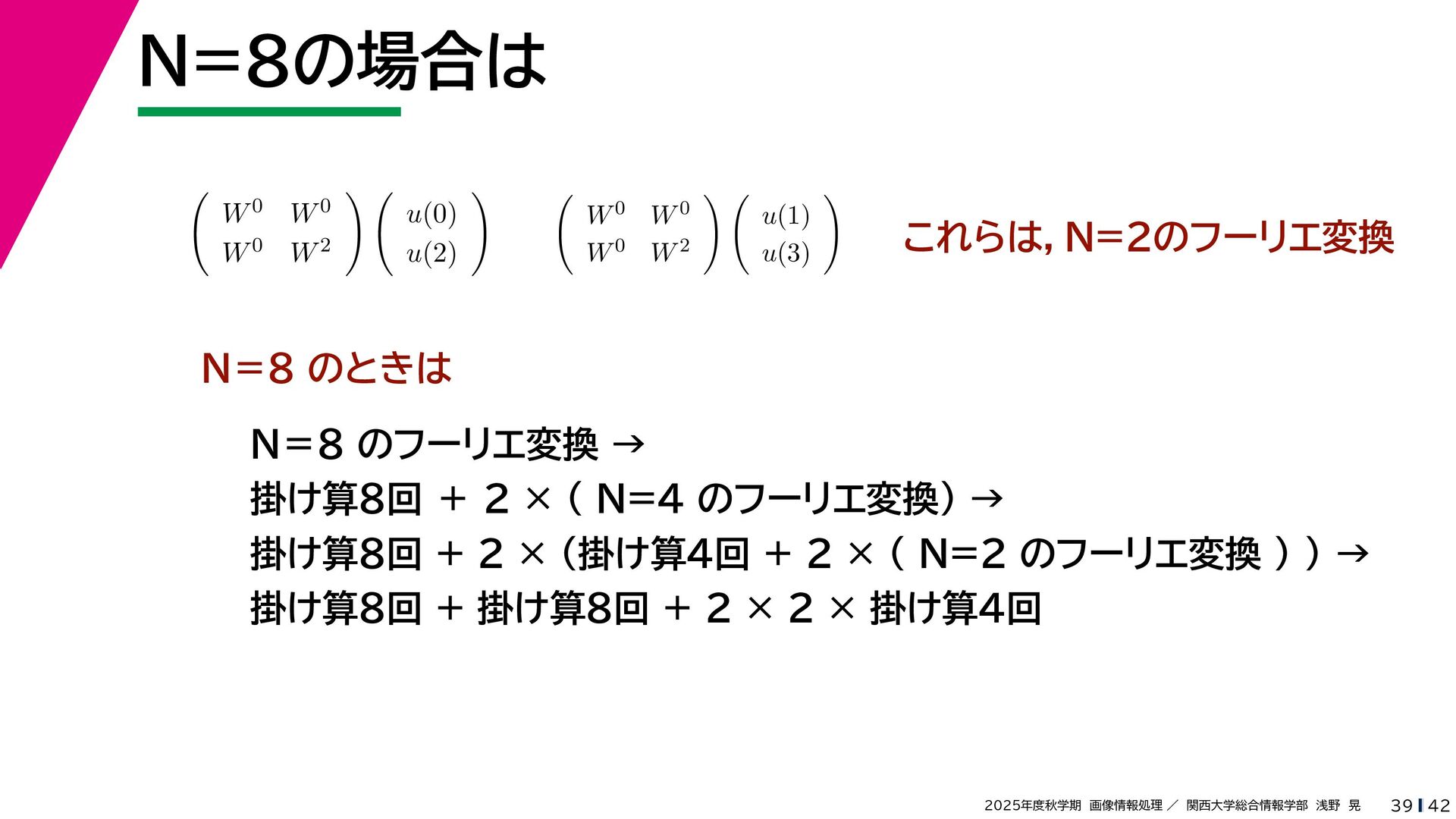 42 2025年度秋学期 画像情報処理 / 関西大学総合情報学部 浅野 晃 N=8の場合は 39 これらは,N=2のフーリエ変換 W0 W0 W0 W2