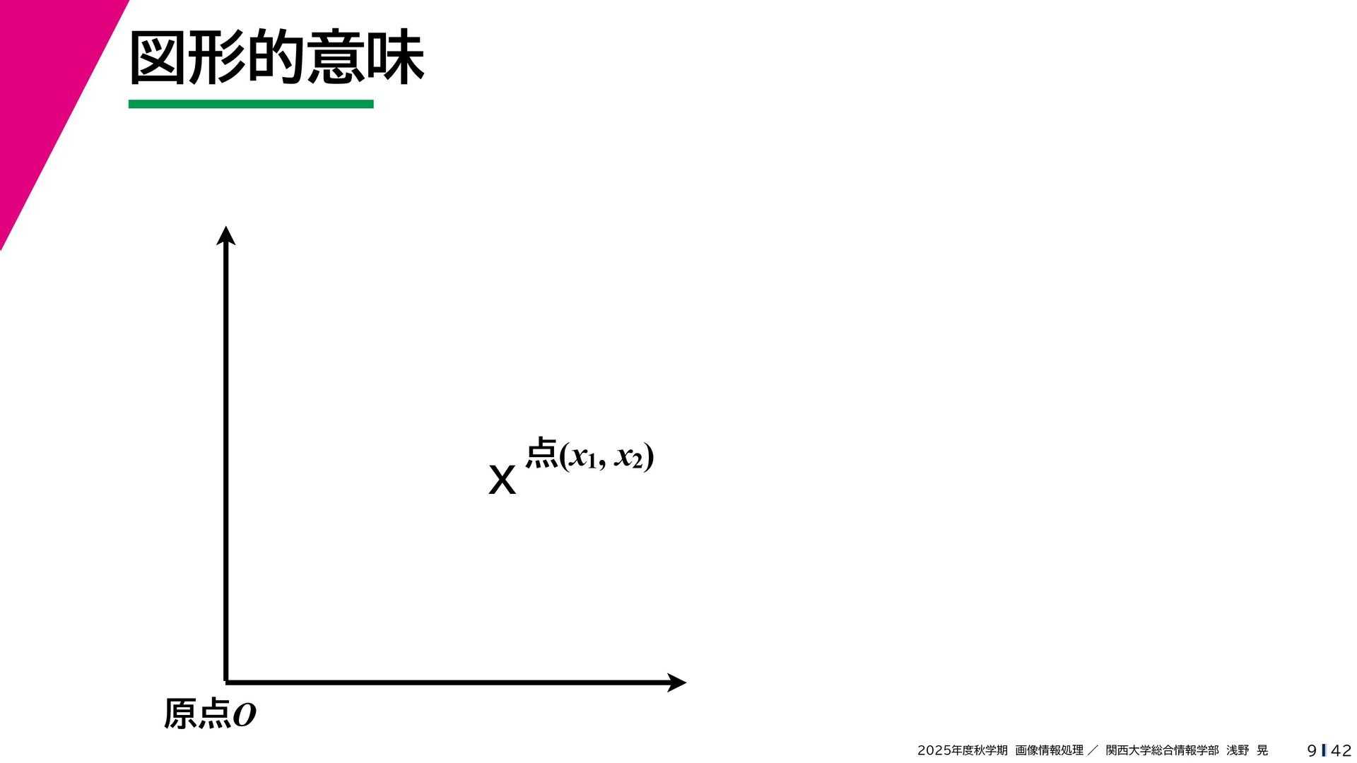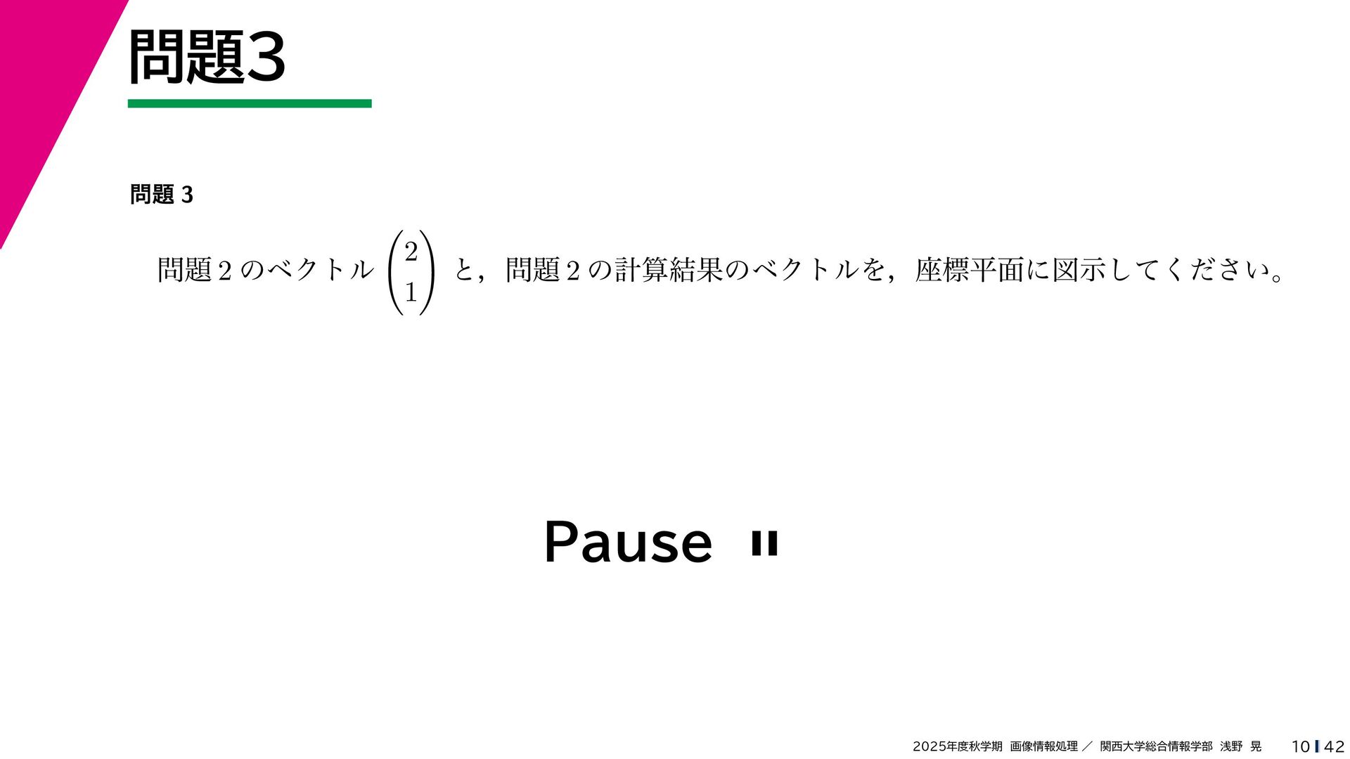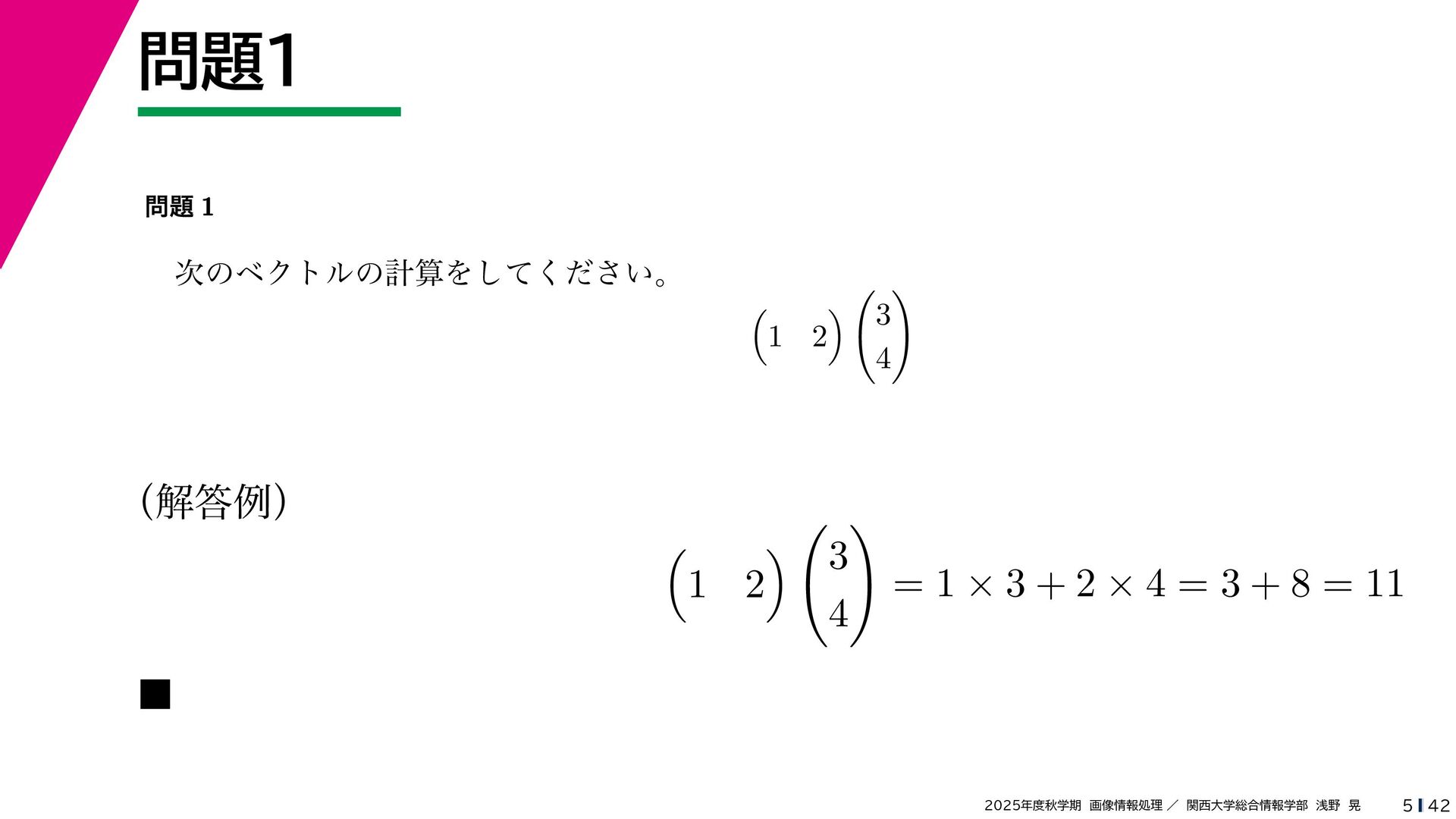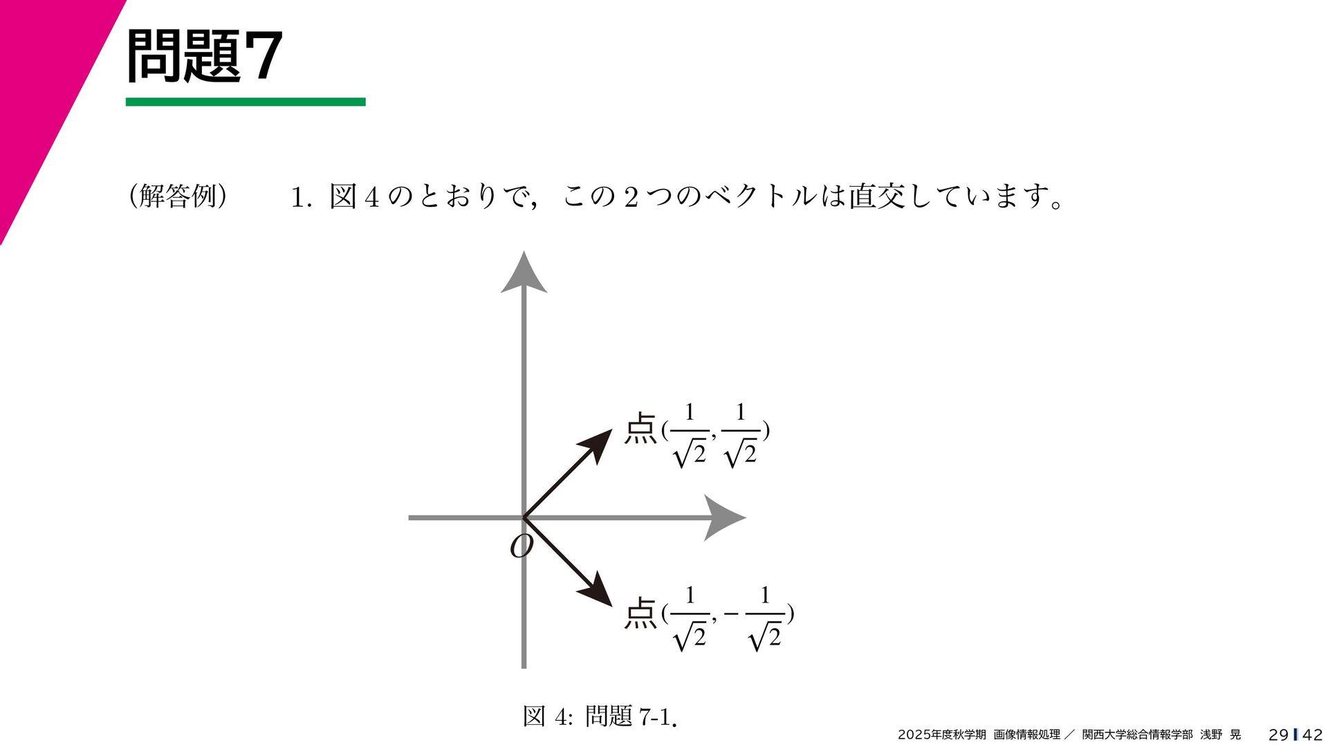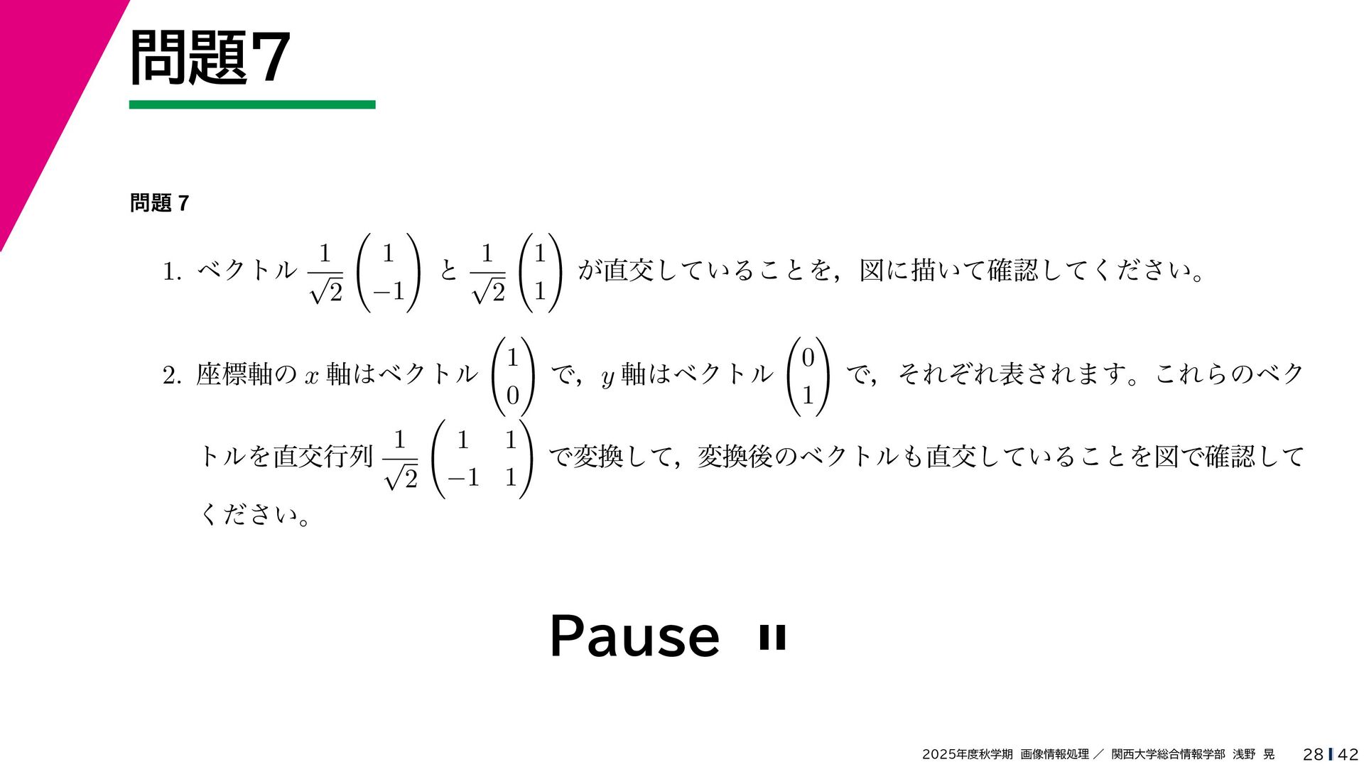 42 2025年度秋学期 画像情報処理 / 関西大学総合情報学部 浅野 晃 問題7 28 Pause ⏸ 問題 7 1. ベクトル