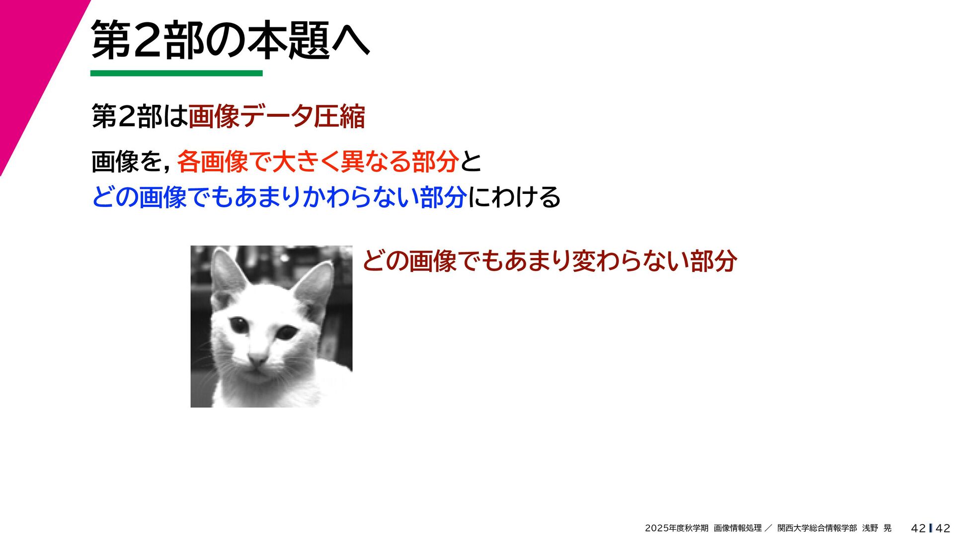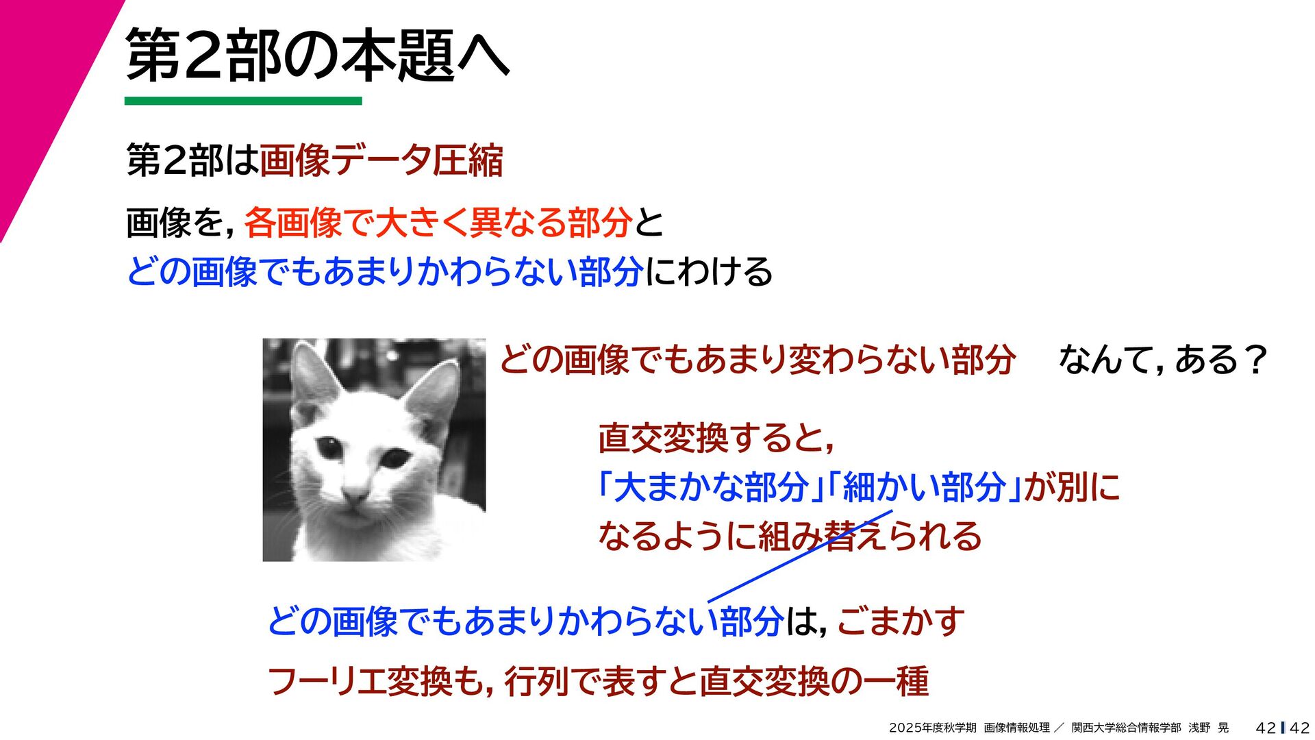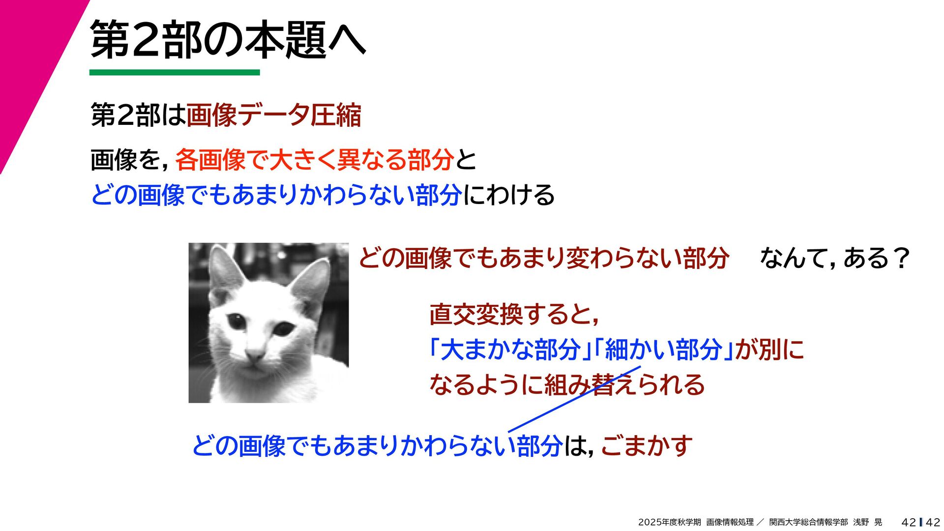 42 2025年度秋学期 画像情報処理 / 関西大学総合情報学部 浅野 晃 第2部の本題へ 42 第2部は画像データ圧縮