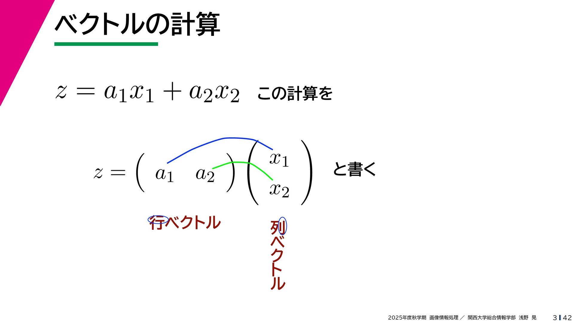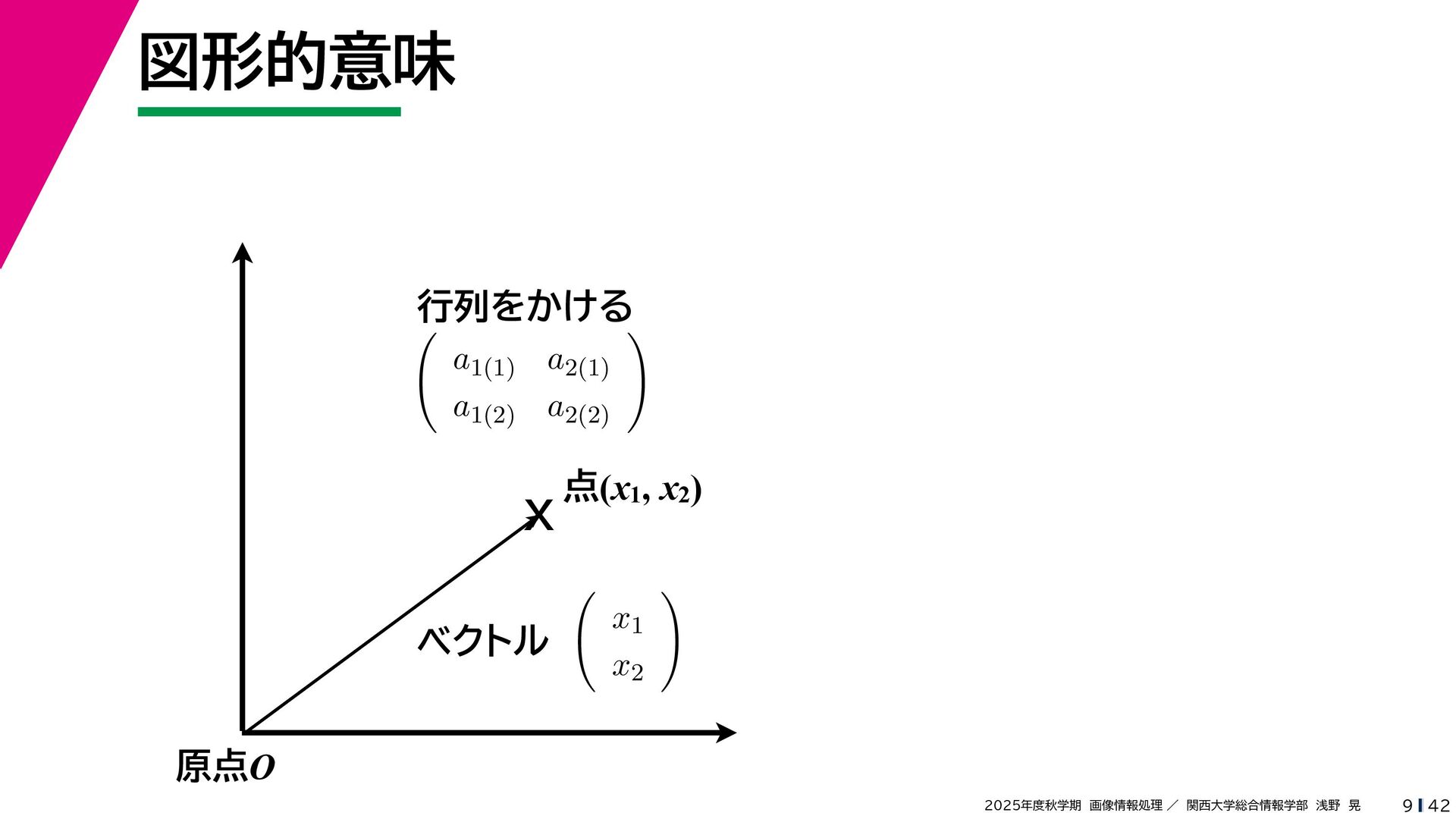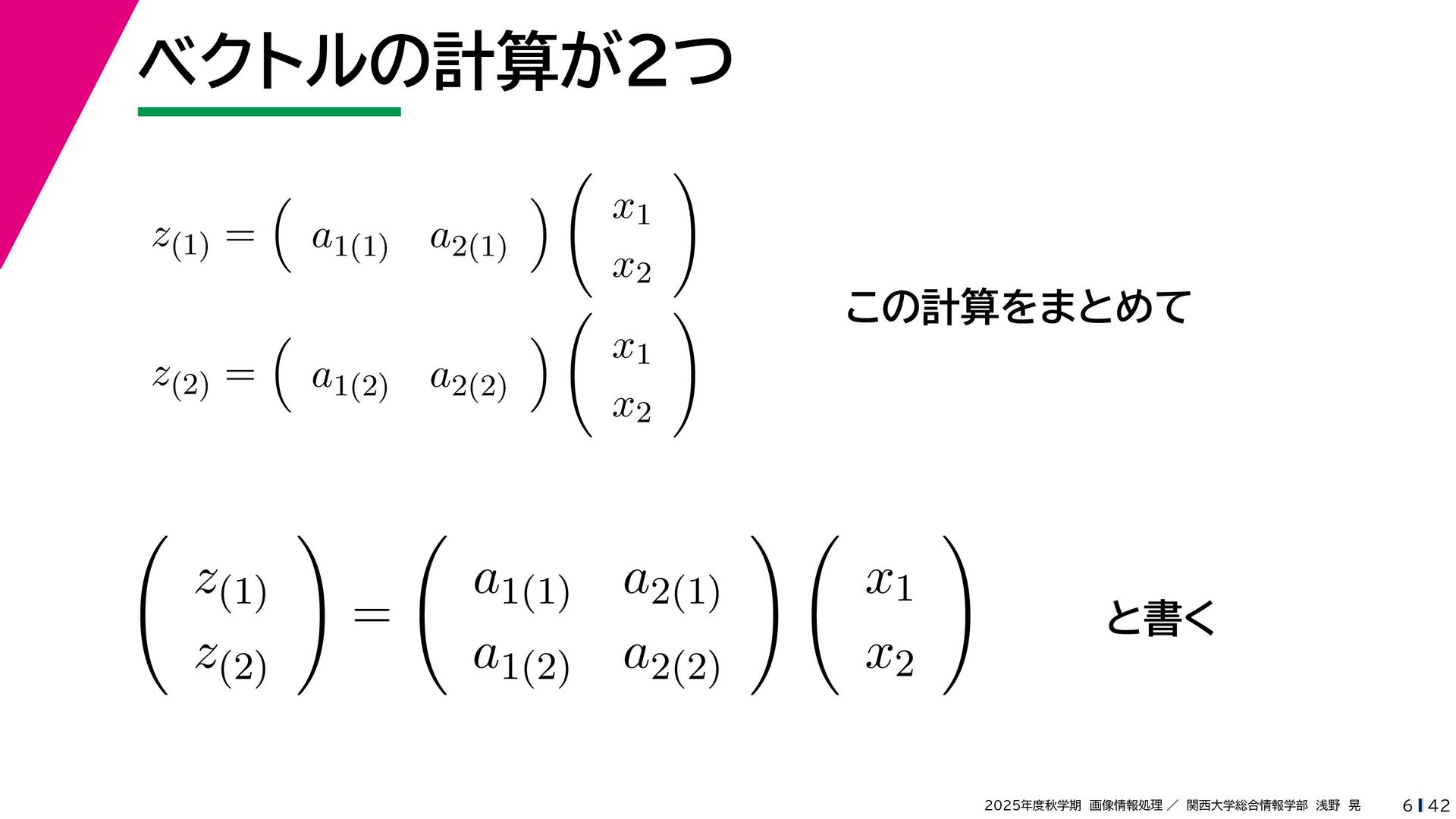 42 2025年度秋学期 画像情報処理 / 関西大学総合情報学部 浅野 晃 後半の「行列×ベクトル」は 38 の後半の 行列×ベクトルは