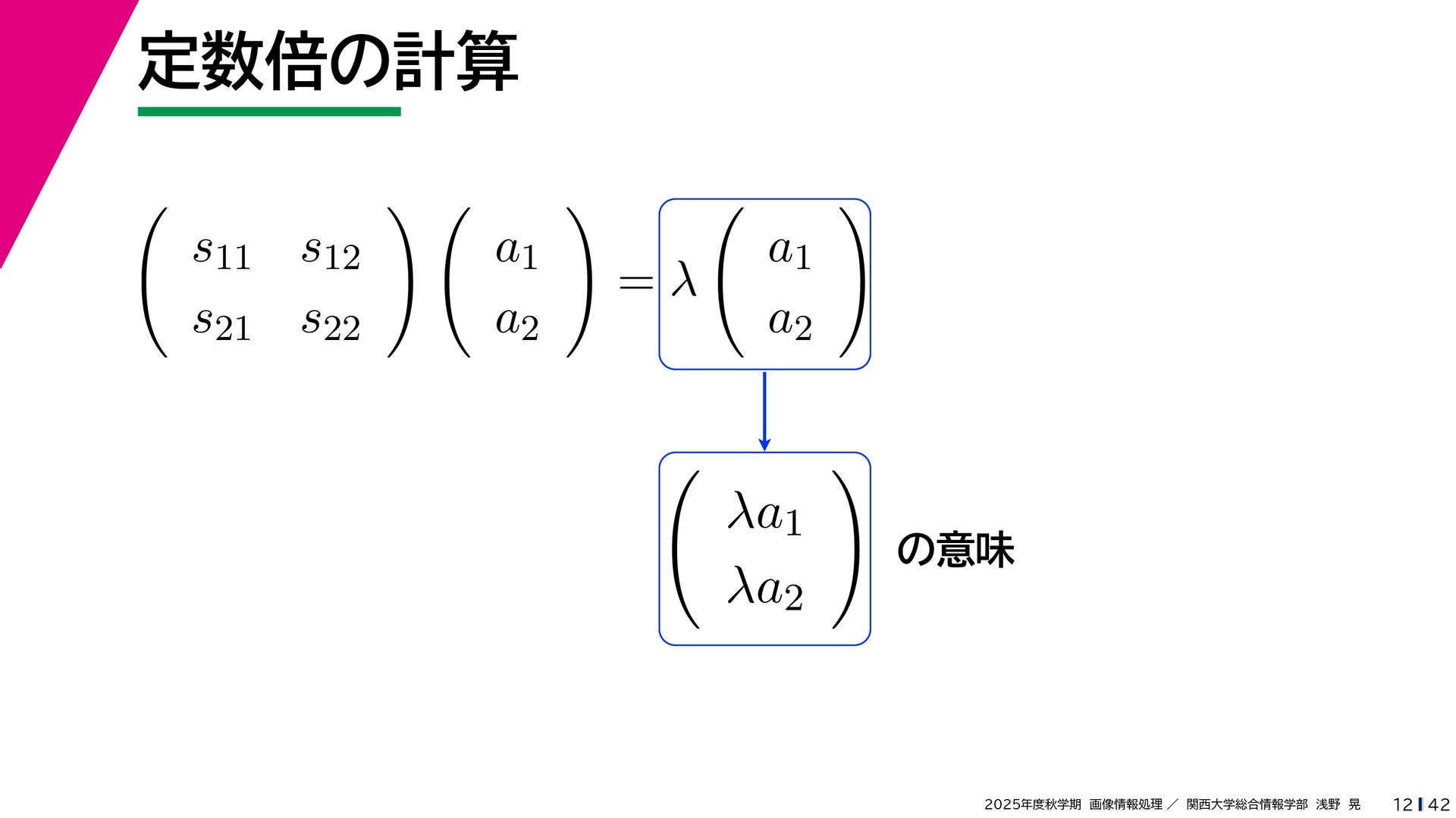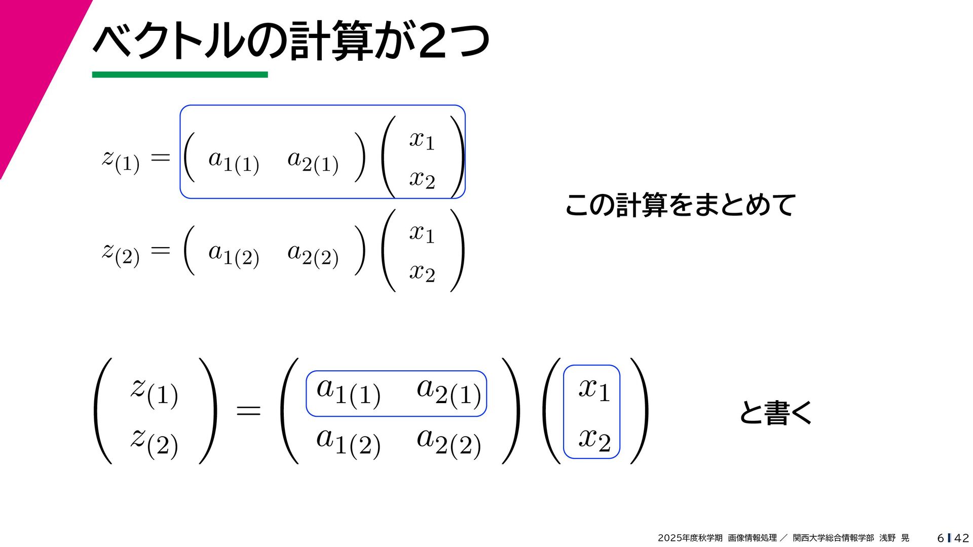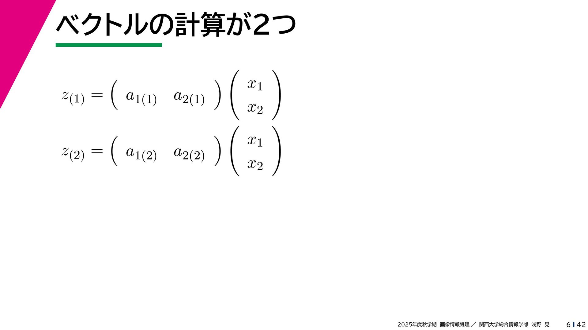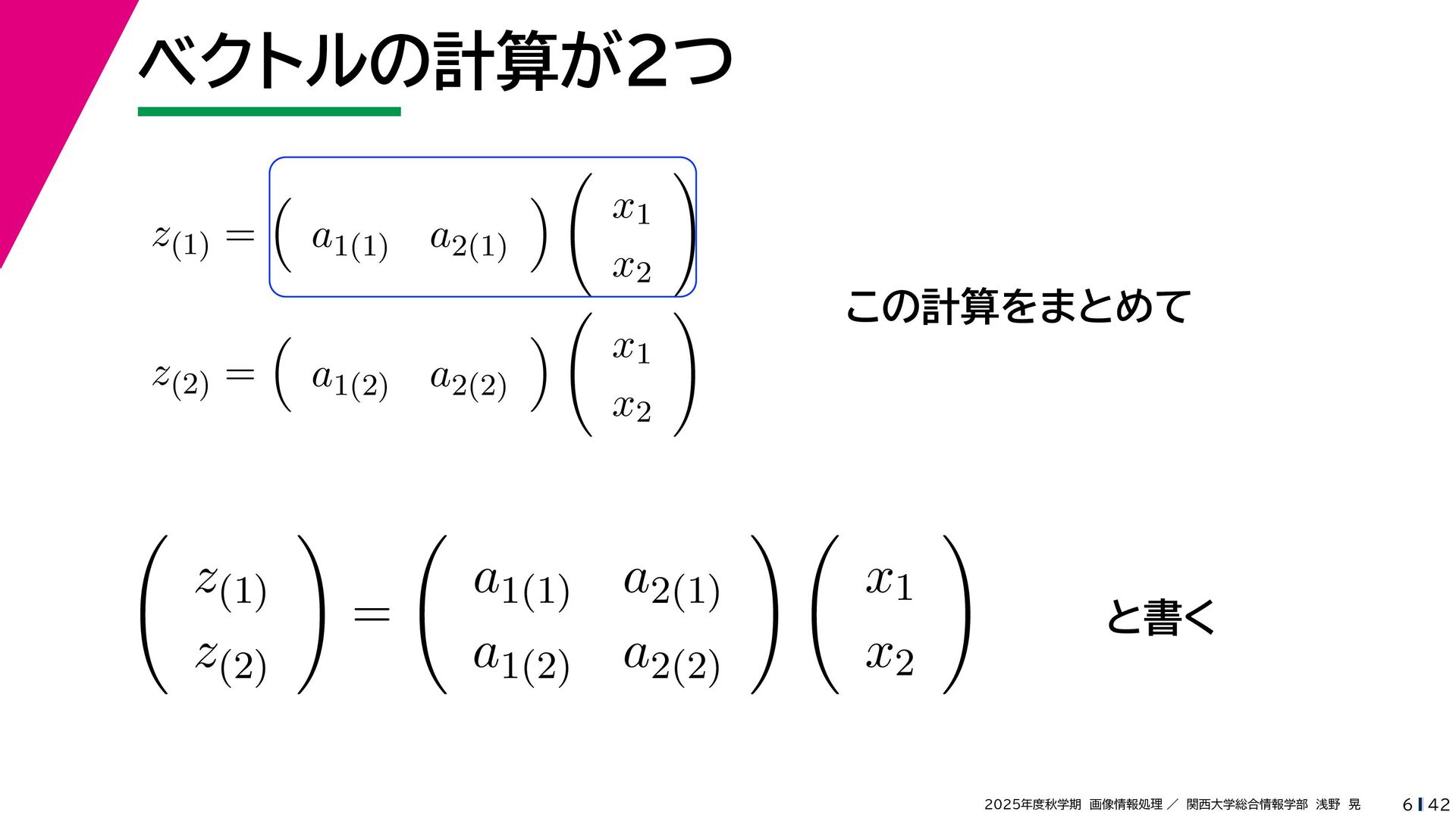 42 2025年度秋学期 画像情報処理 / 関西大学総合情報学部 浅野 晃 後半の「行列×ベクトル」は 38 の後半の 行列×ベクトルは
