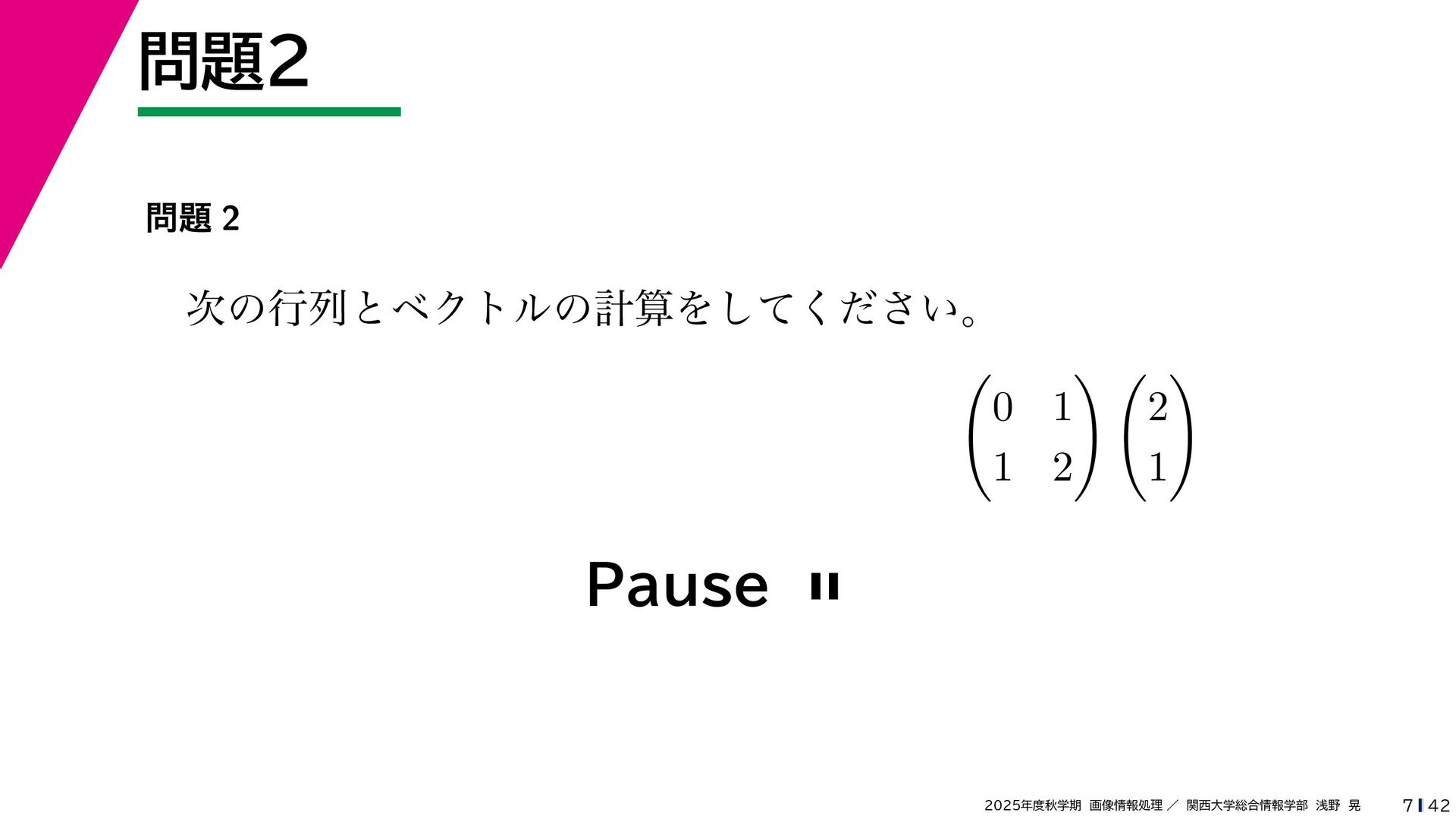 42 2025年度秋学期 画像情報処理 / 関西大学総合情報学部 浅野 晃 問題4 14 Pause ⏸ 問題 4 次の行列と行列の計算をしてください。 0