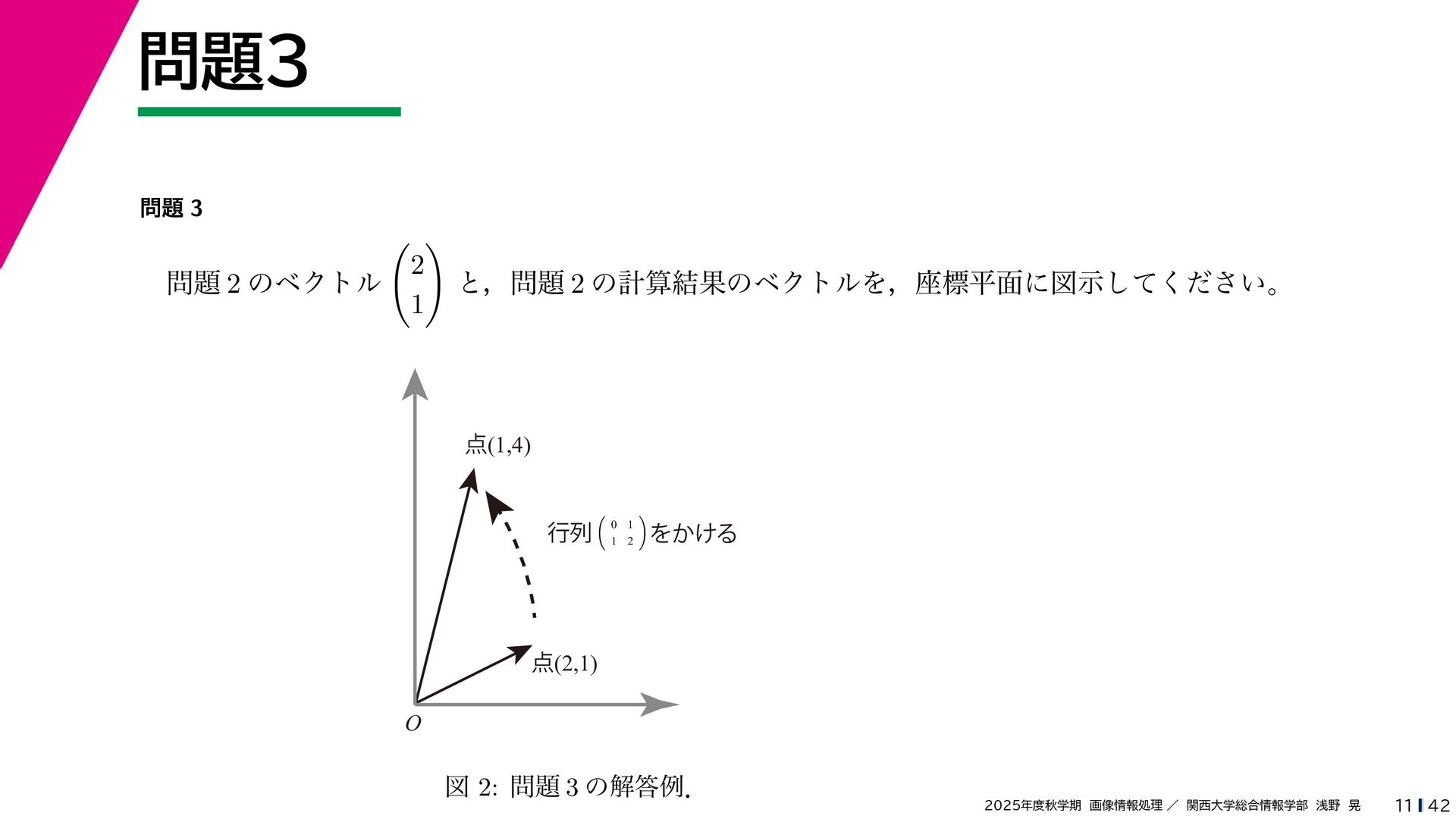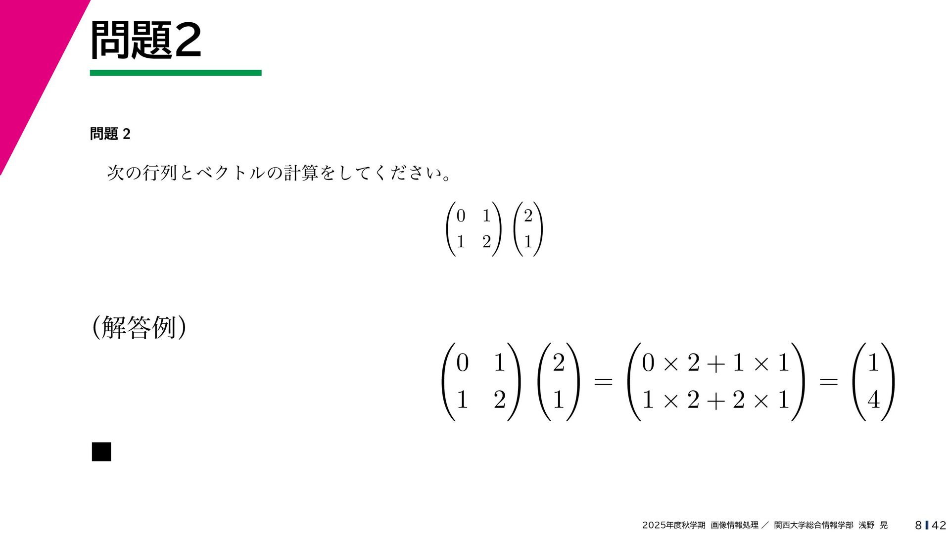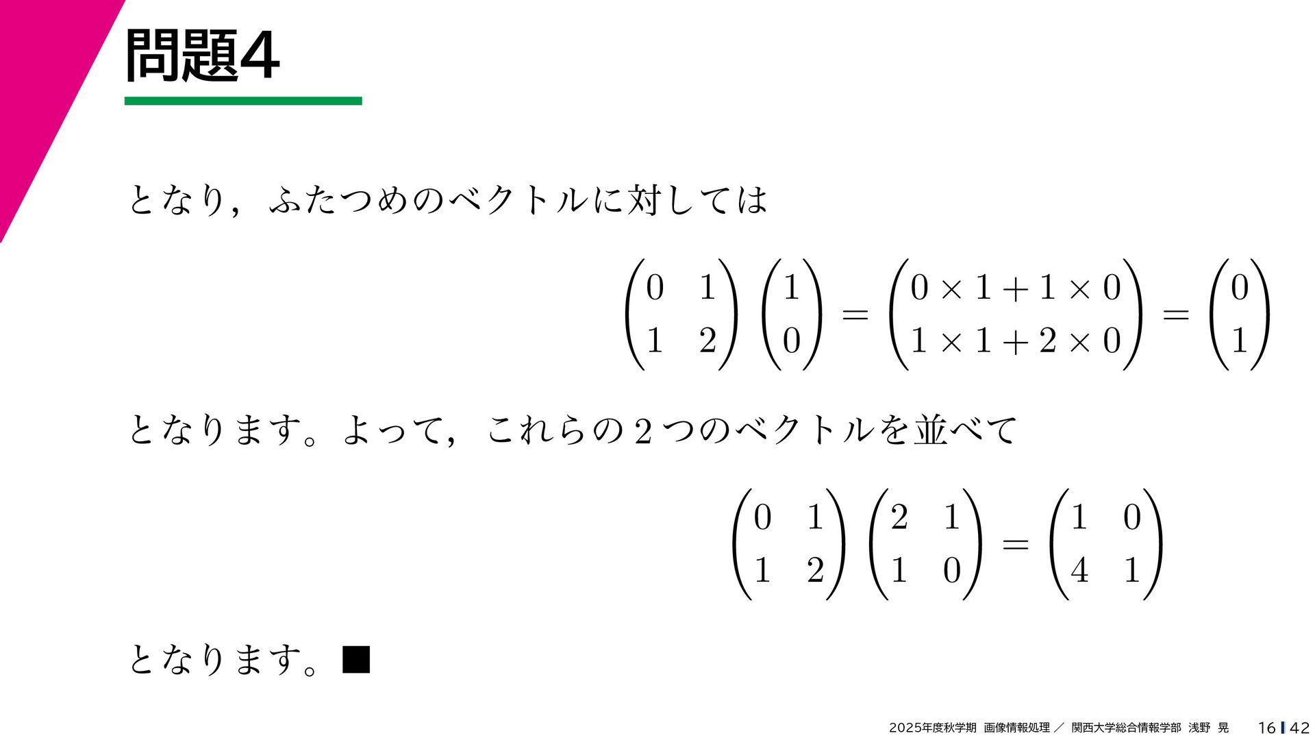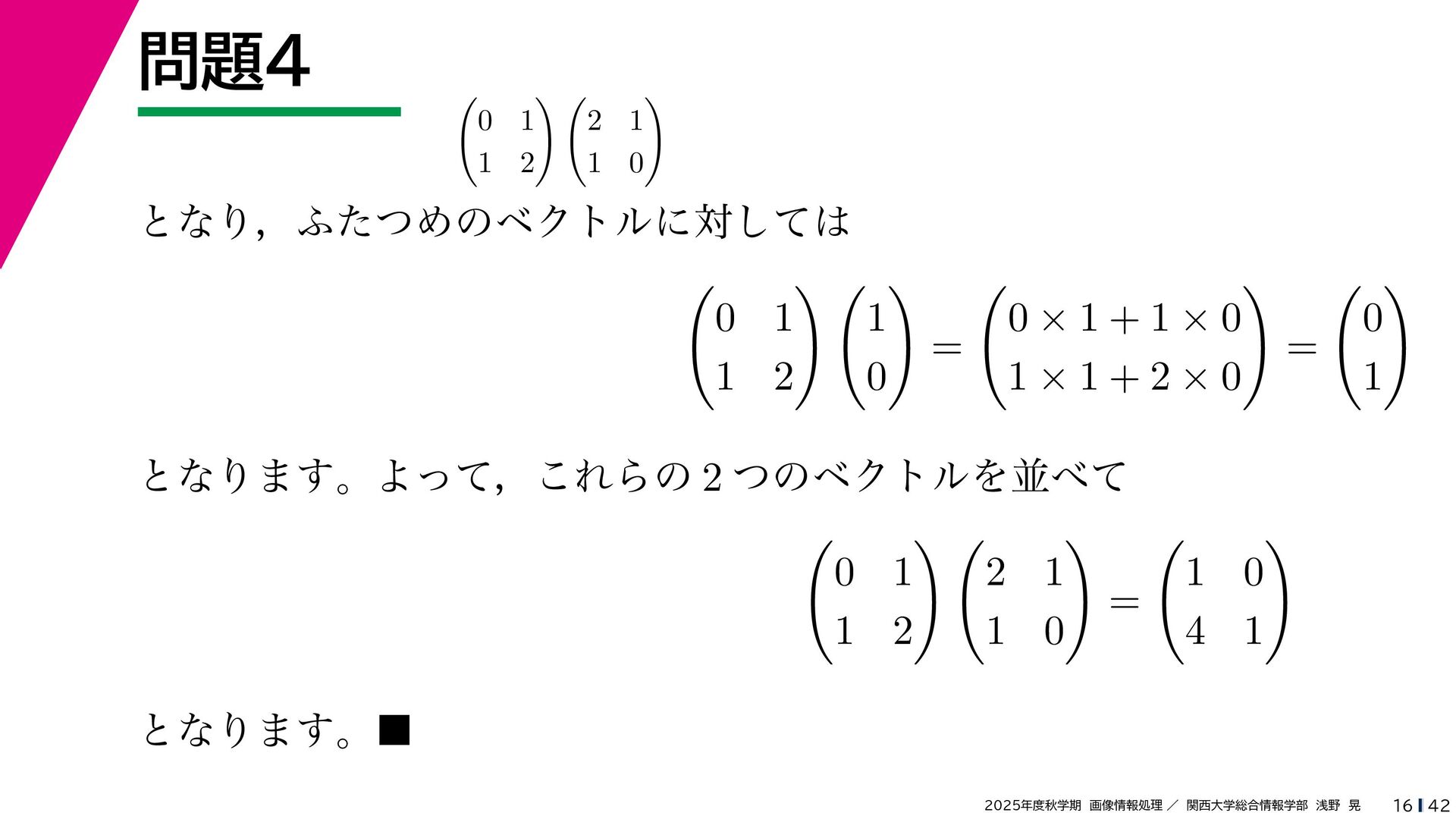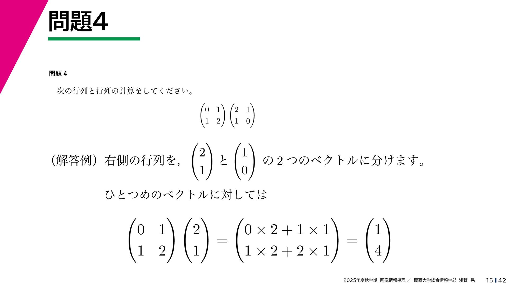 42 2025年度秋学期 画像情報処理 / 関西大学総合情報学部 浅野 晃 問題4 15 問題 4 次の行列と行列の計算をしてください。 0 1