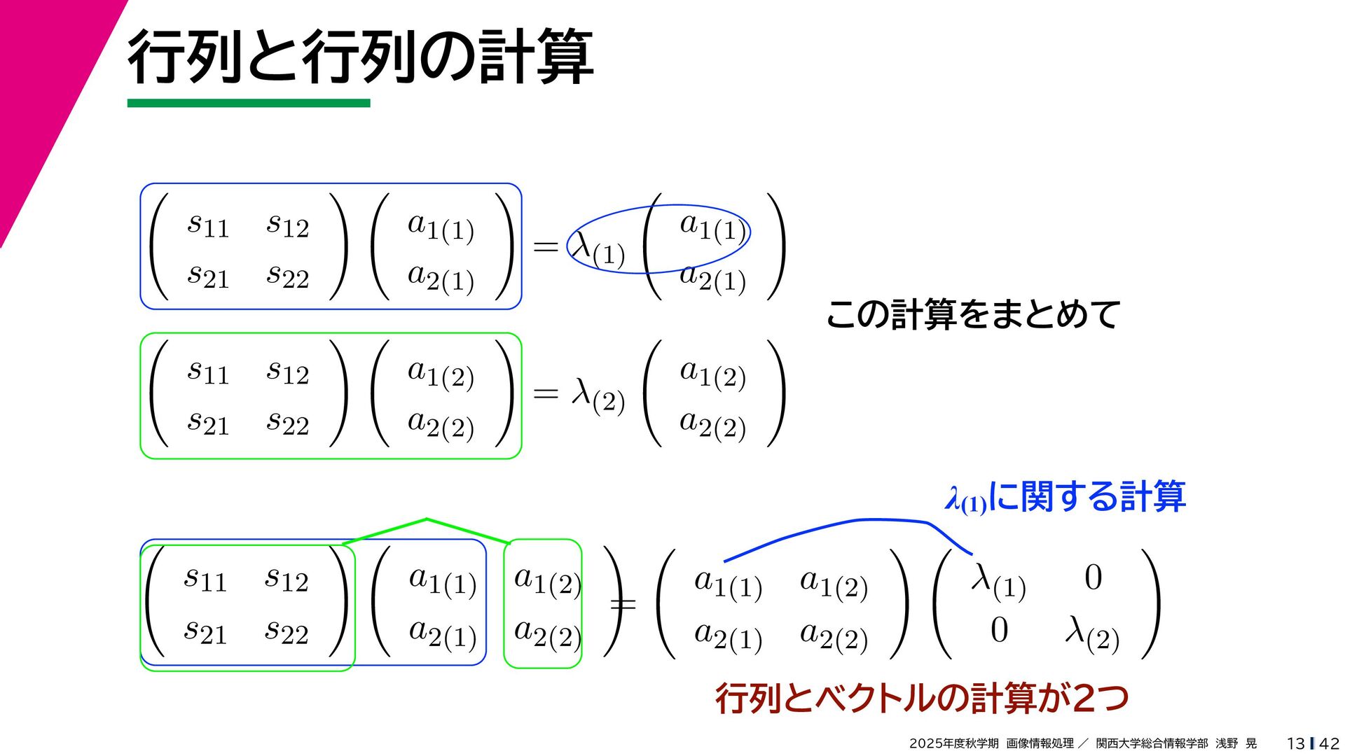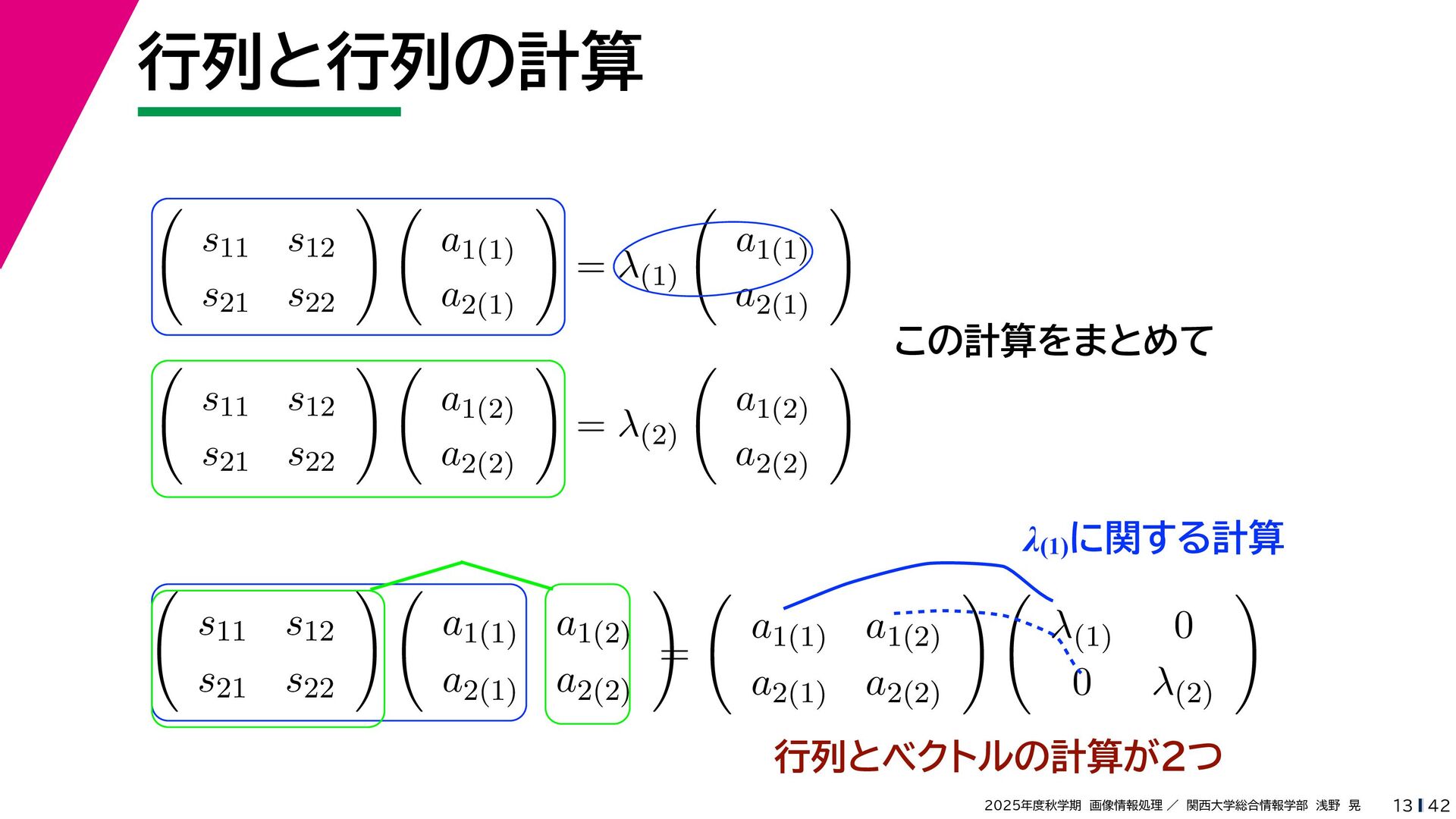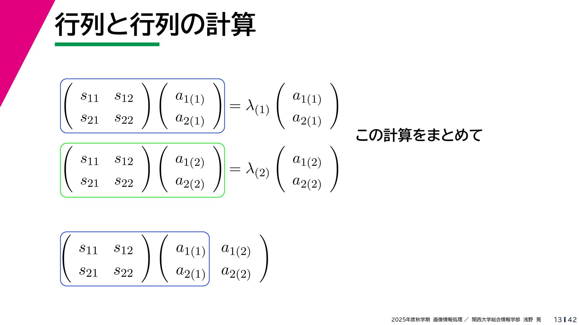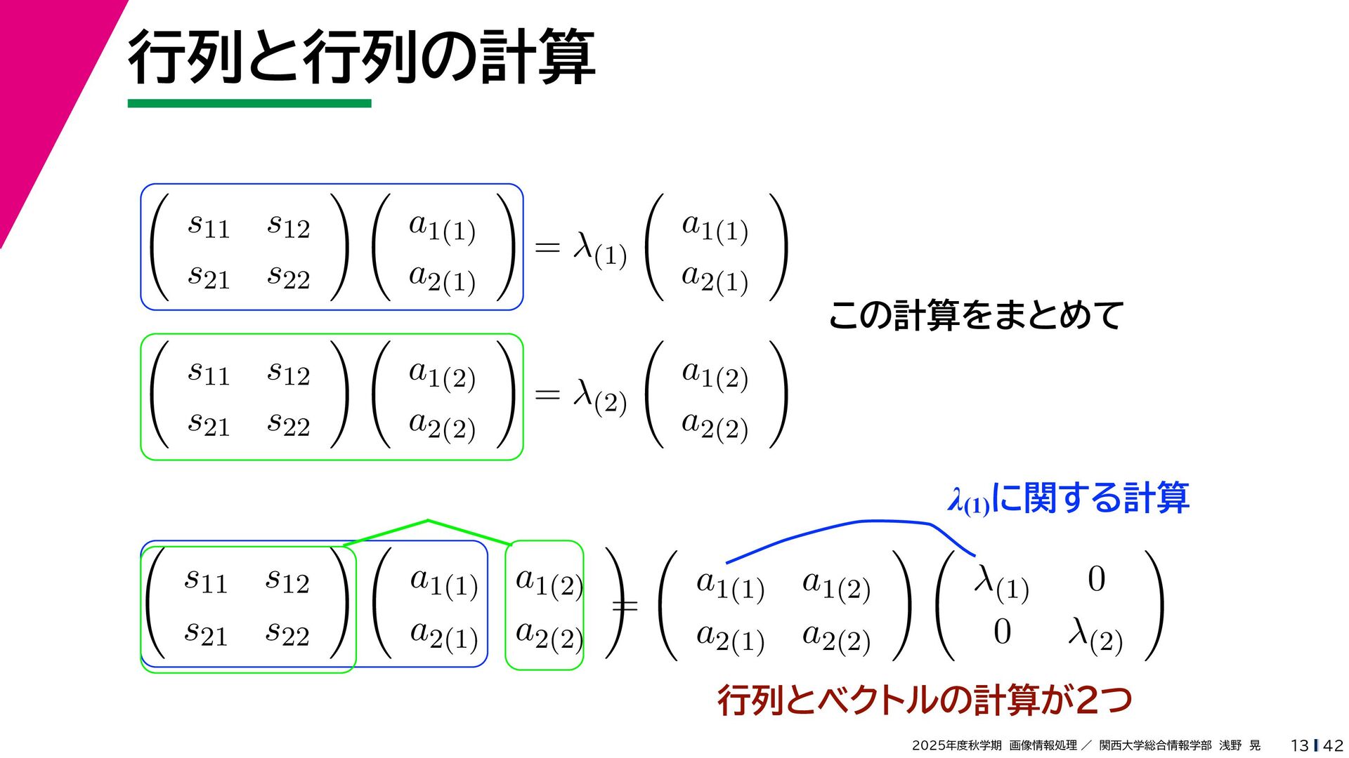 42 2025年度秋学期 画像情報処理 / 関西大学総合情報学部 浅野 晃 要素がp個の場合 18 s11 s12 s21 s22 a1(1)