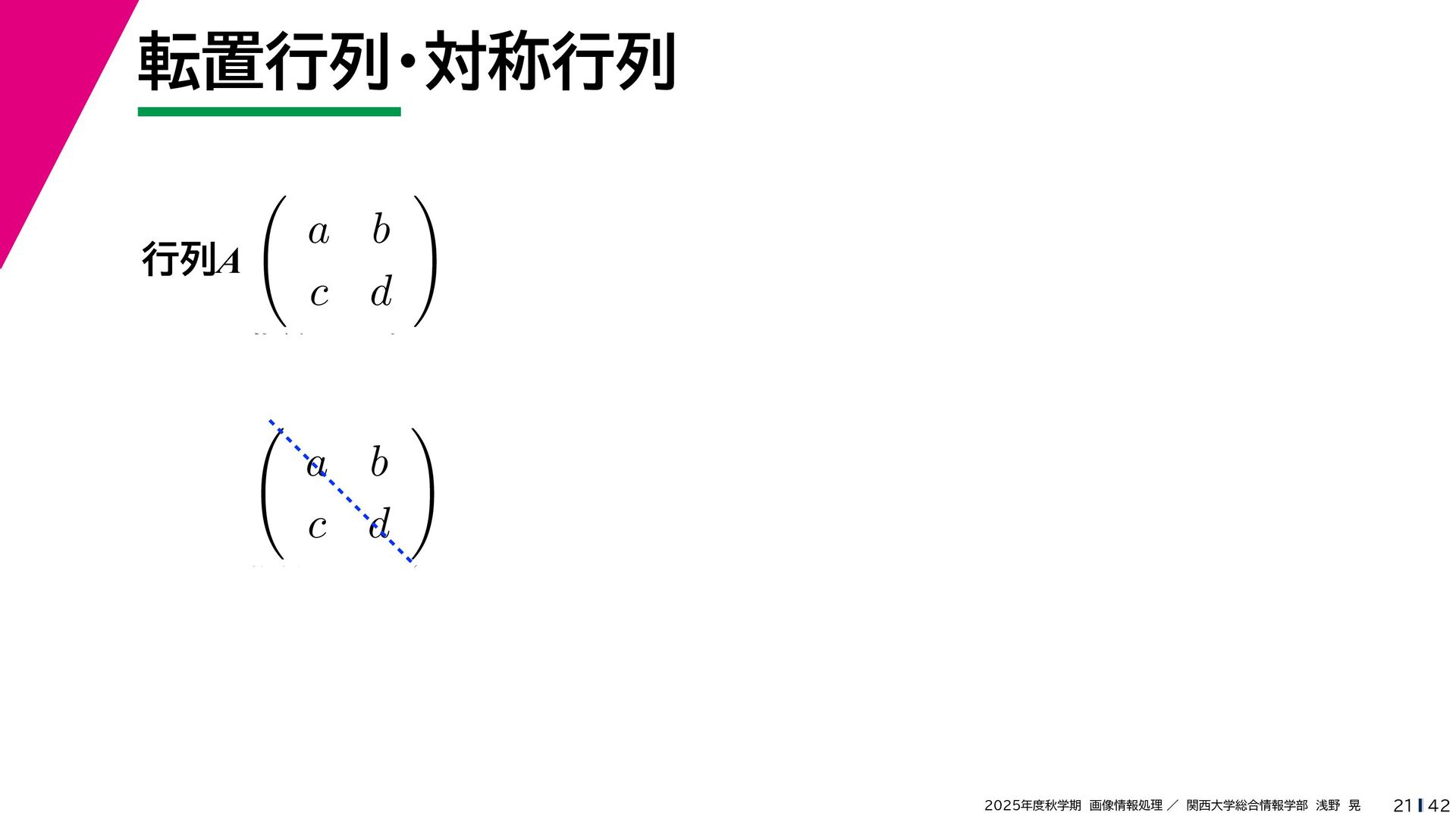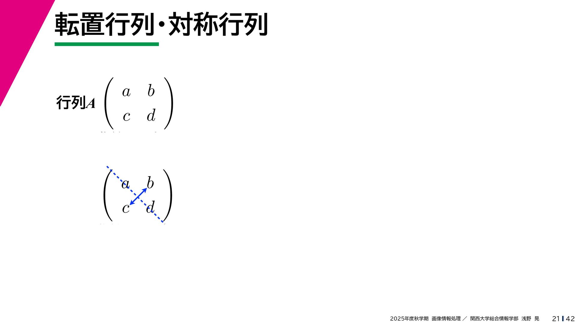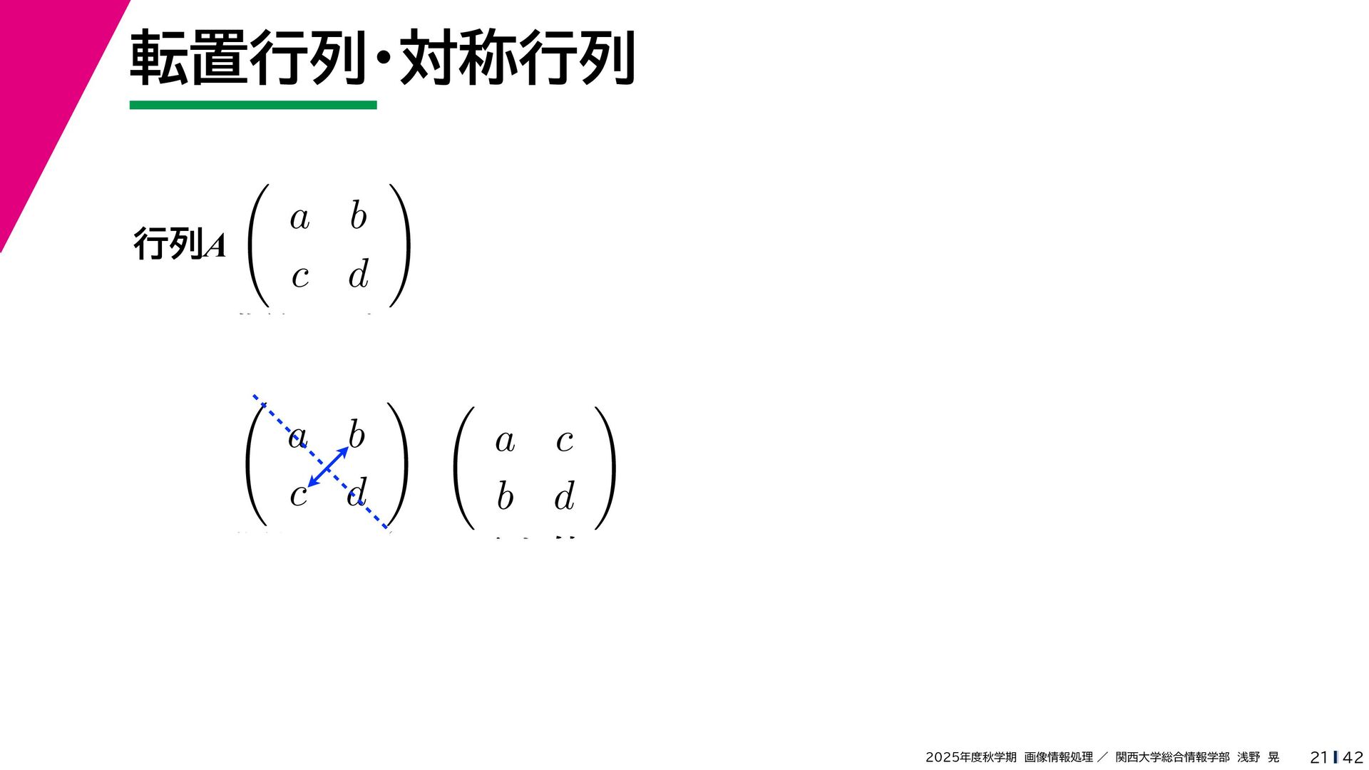 42 2025年度秋学期 画像情報処理 / 関西大学総合情報学部 浅野 晃 転置行列・対称行列 21 a b c d 講義