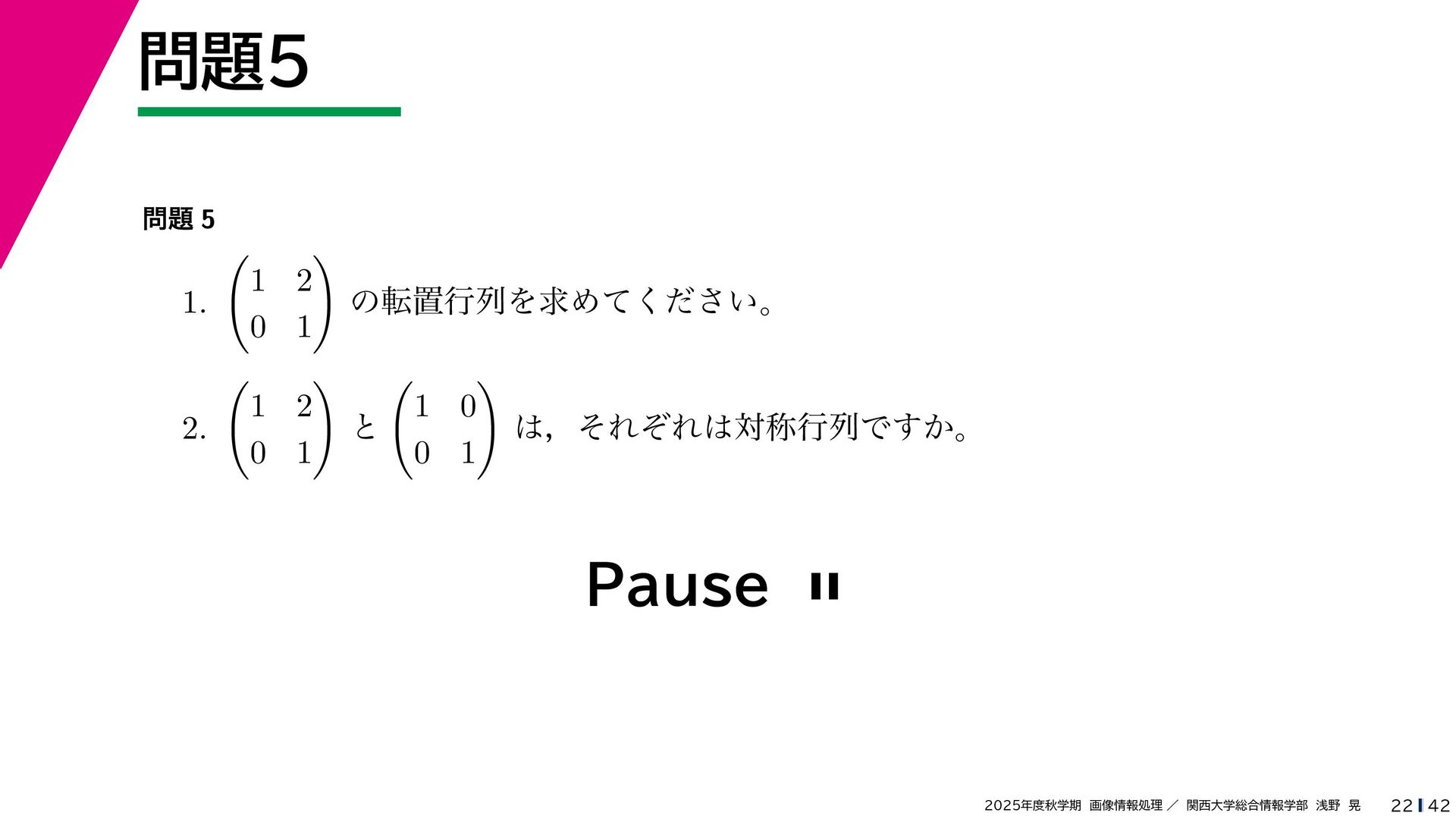 42 2025年度秋学期 画像情報処理 / 関西大学総合情報学部 浅野 晃 問題5 22 Pause ⏸ 問題 5 1. 1