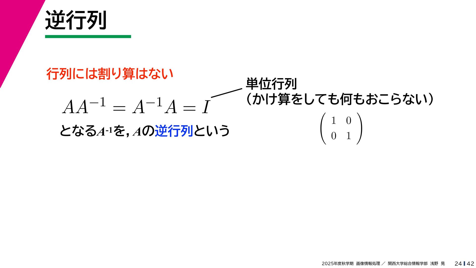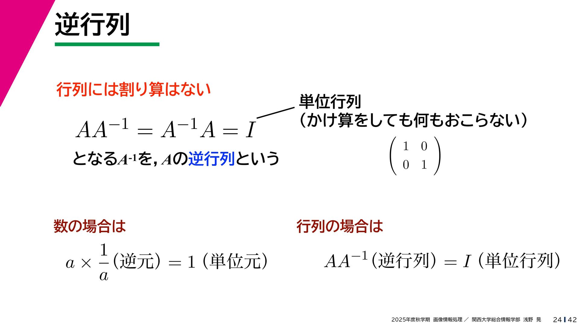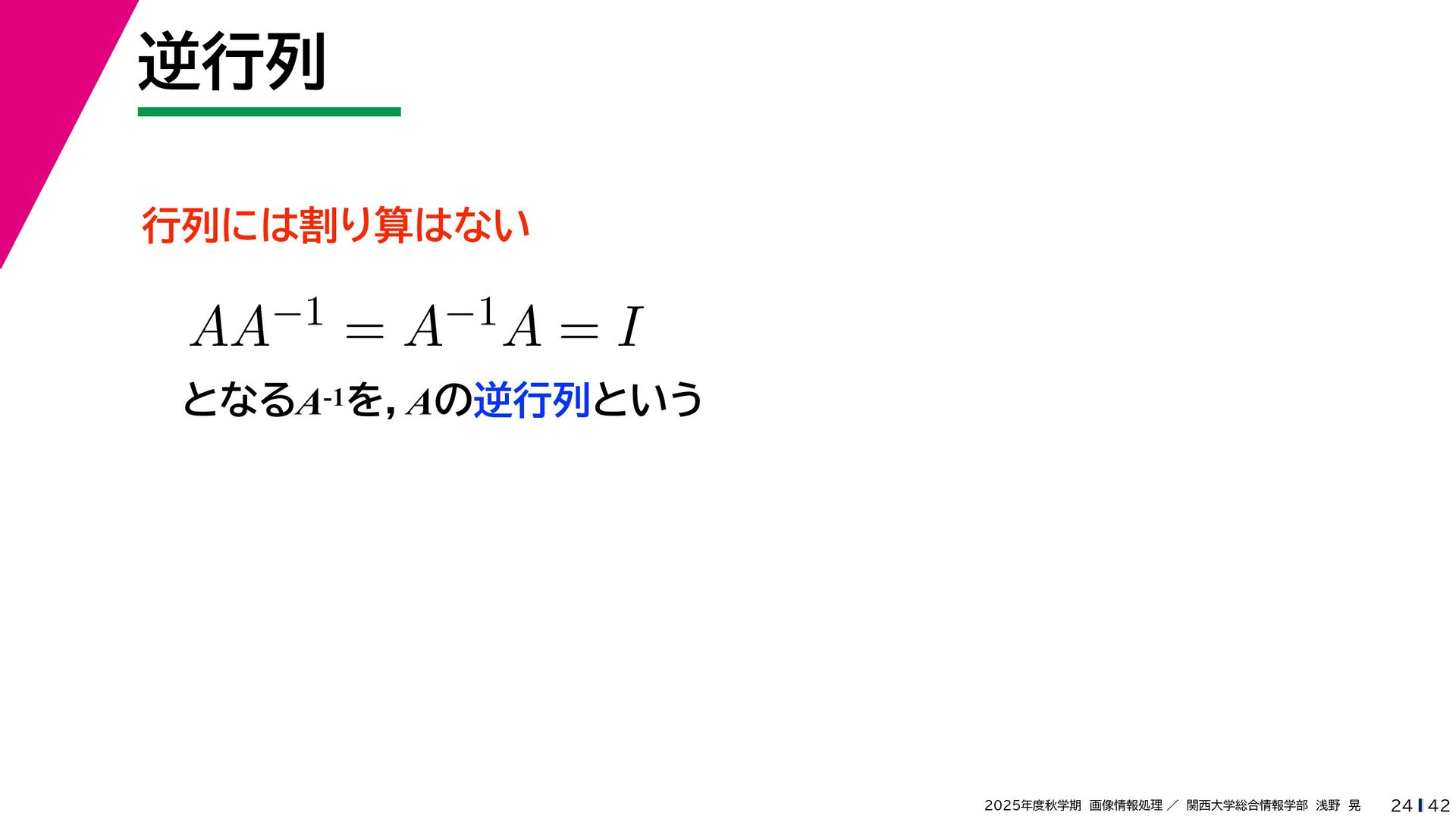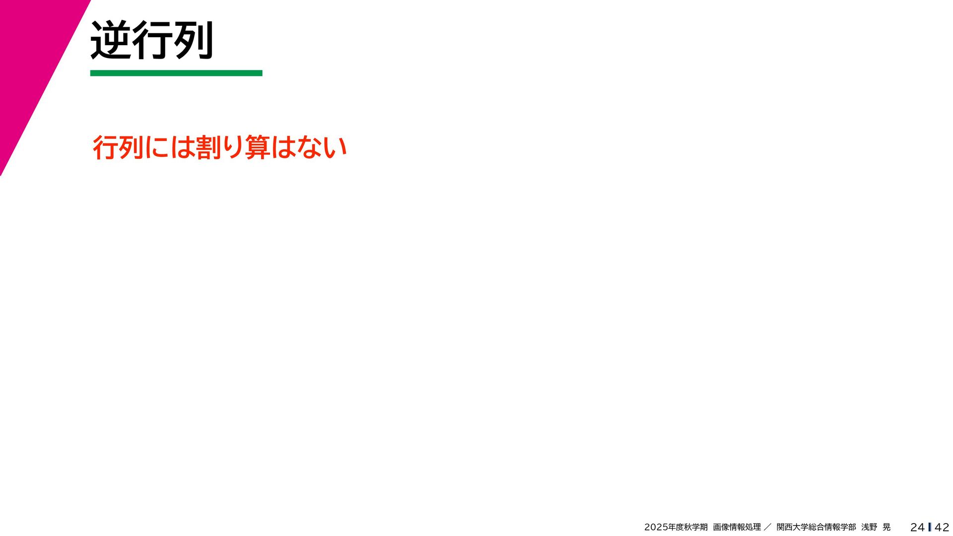 42 2025年度秋学期 画像情報処理 / 関西大学総合情報学部 浅野 晃 逆行列 24 行列には割り算はない