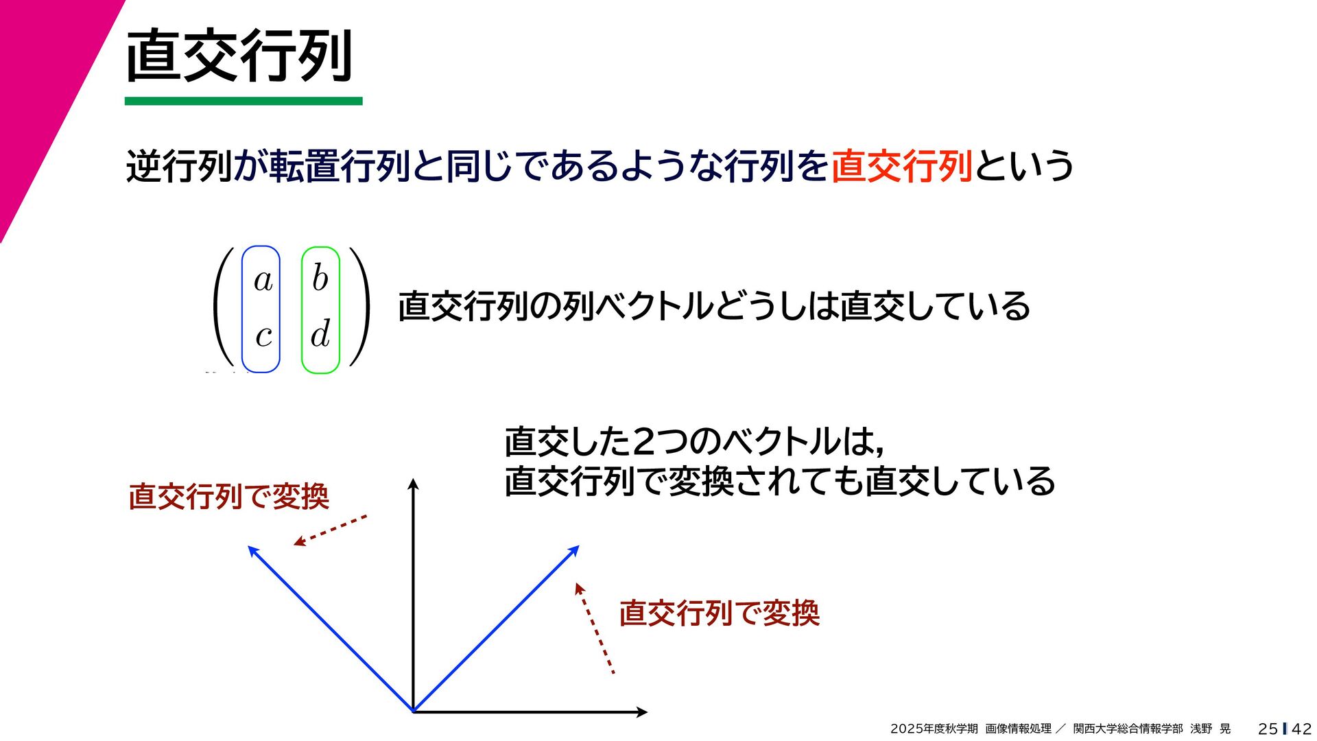 42 2025年度秋学期 画像情報処理 / 関西大学総合情報学部 浅野 晃 直交行列 25 a b c d 講義