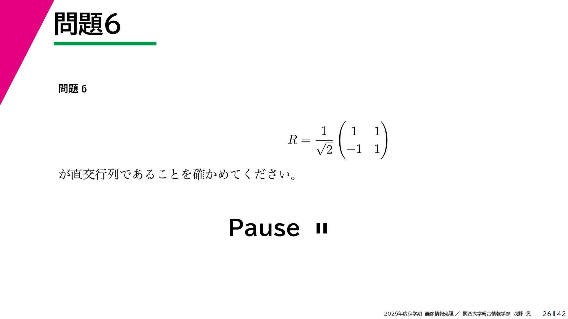 42 2025年度秋学期 画像情報処理 / 関西大学総合情報学部 浅野 晃 問題6 26 Pause ⏸ 問題 6 R =