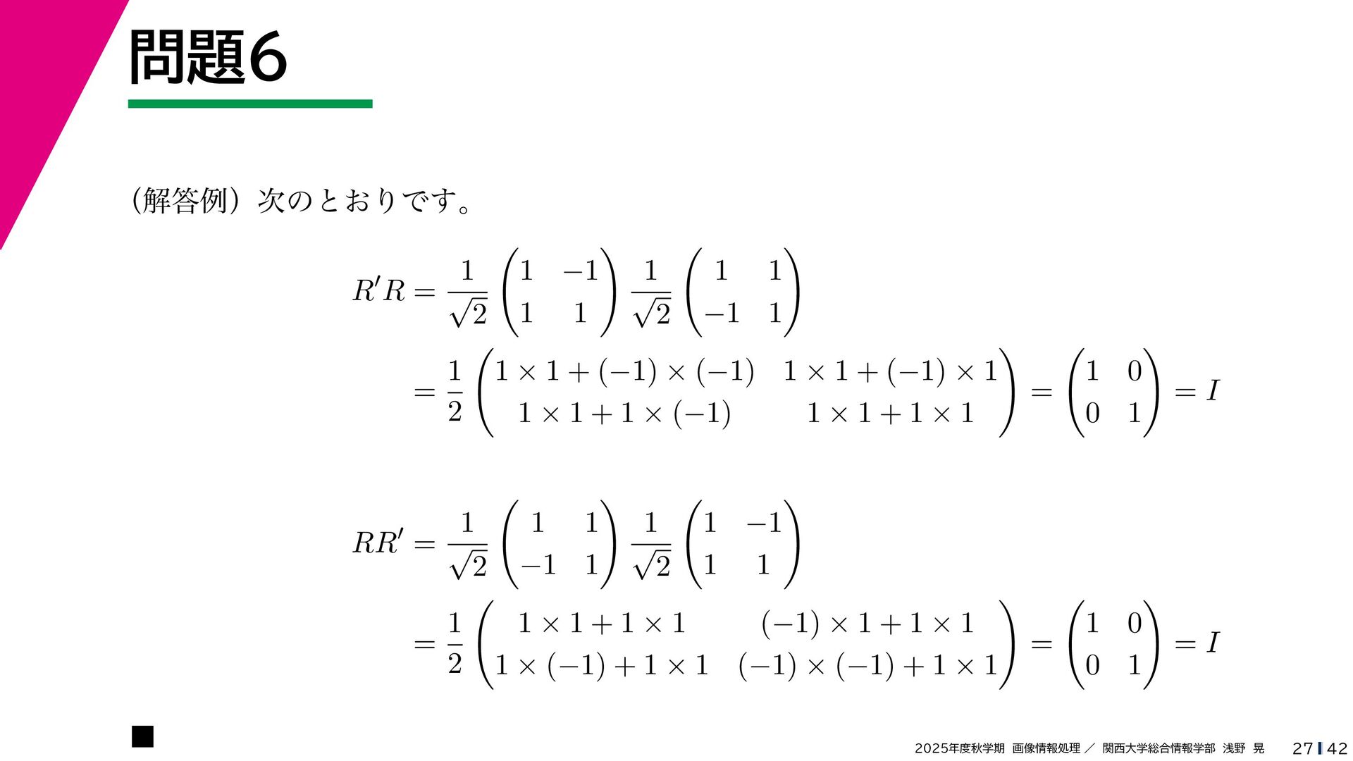 42 2025年度秋学期 画像情報処理 / 関西大学総合情報学部 浅野 晃 問題6 27 (解答例)次のとおりです。 R R = 1