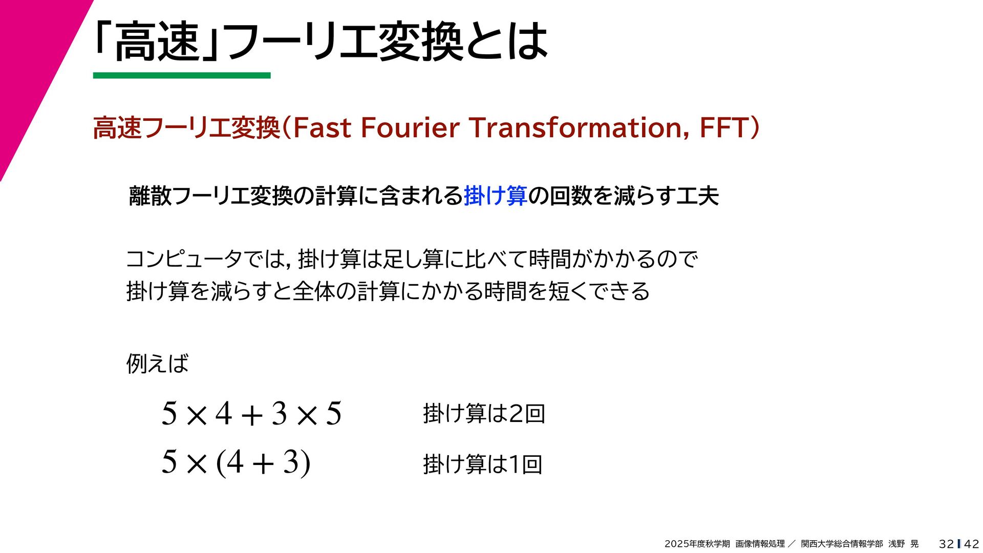 42 2025年度秋学期 画像情報処理 / 関西大学総合情報学部 浅野 晃 「高速」フーリエ変換とは 32 高速フーリエ変換(Fast Fourier Transformation, FFT) 離散フーリエ変換の計算に含まれる掛け算の回数を減らす工夫