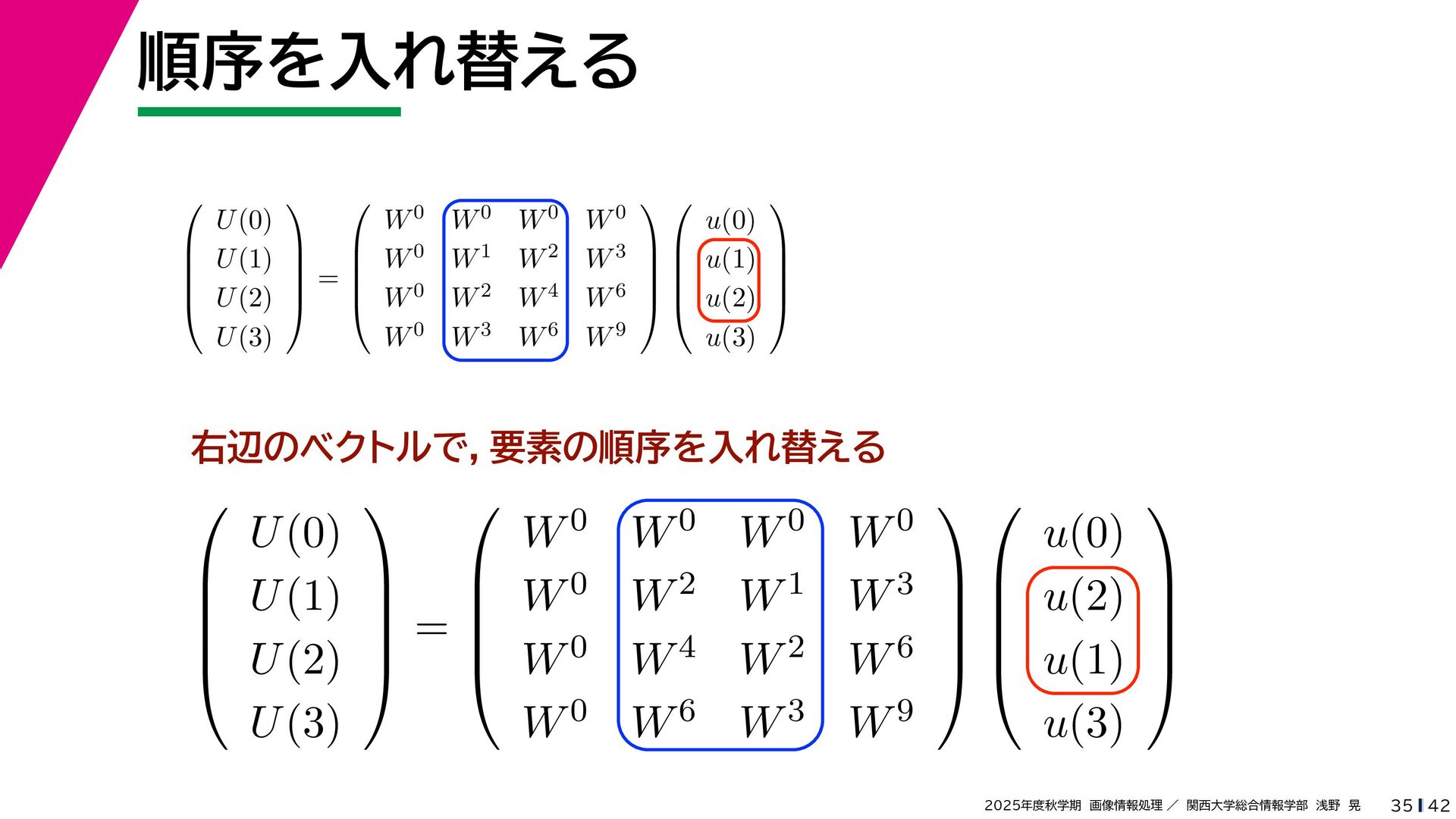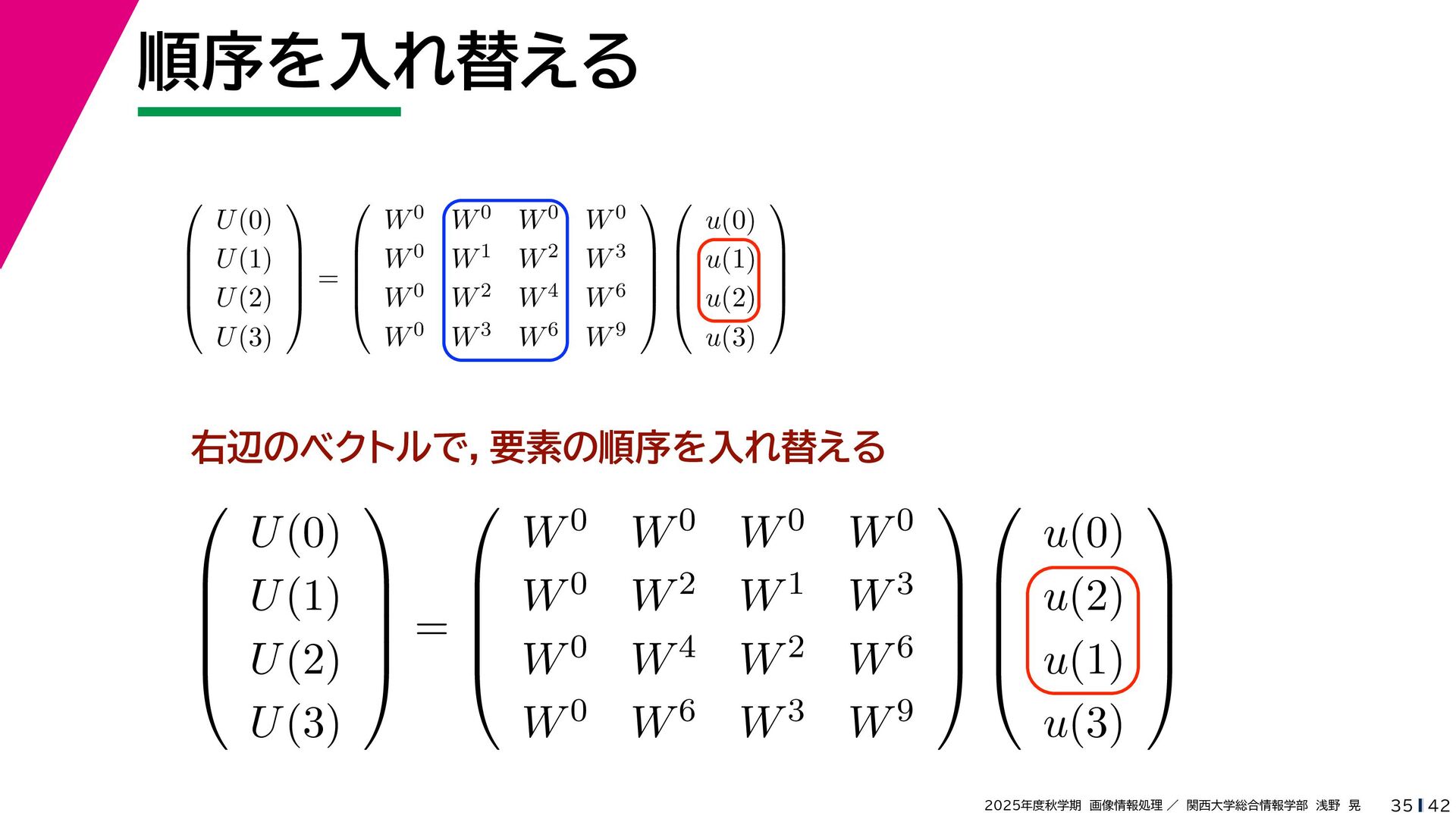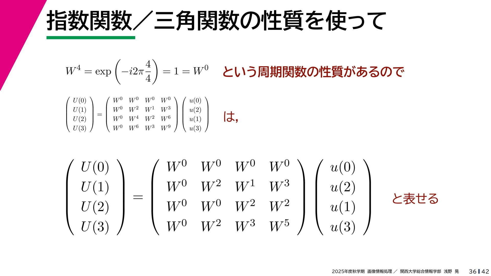 42 2025年度秋学期 画像情報処理 / 関西大学総合情報学部 浅野 晃 指数関数/三角関数の性質を使って 36 という周期関数の性質があるので W4 = exp −i2π