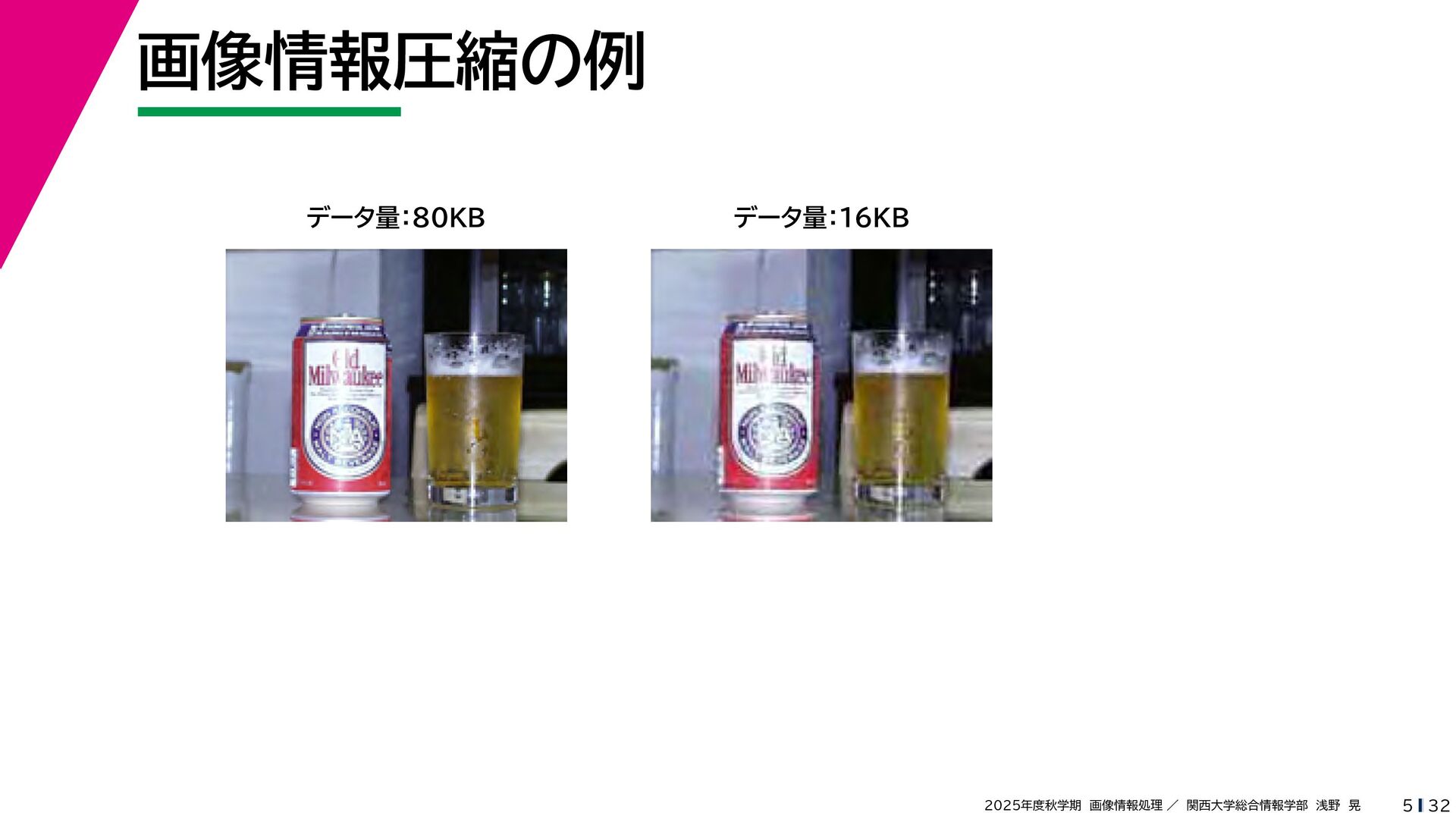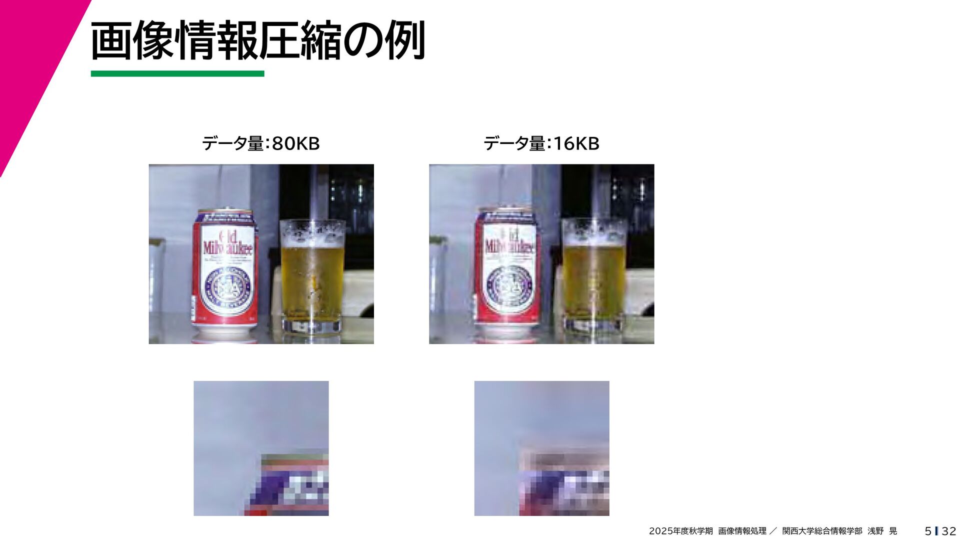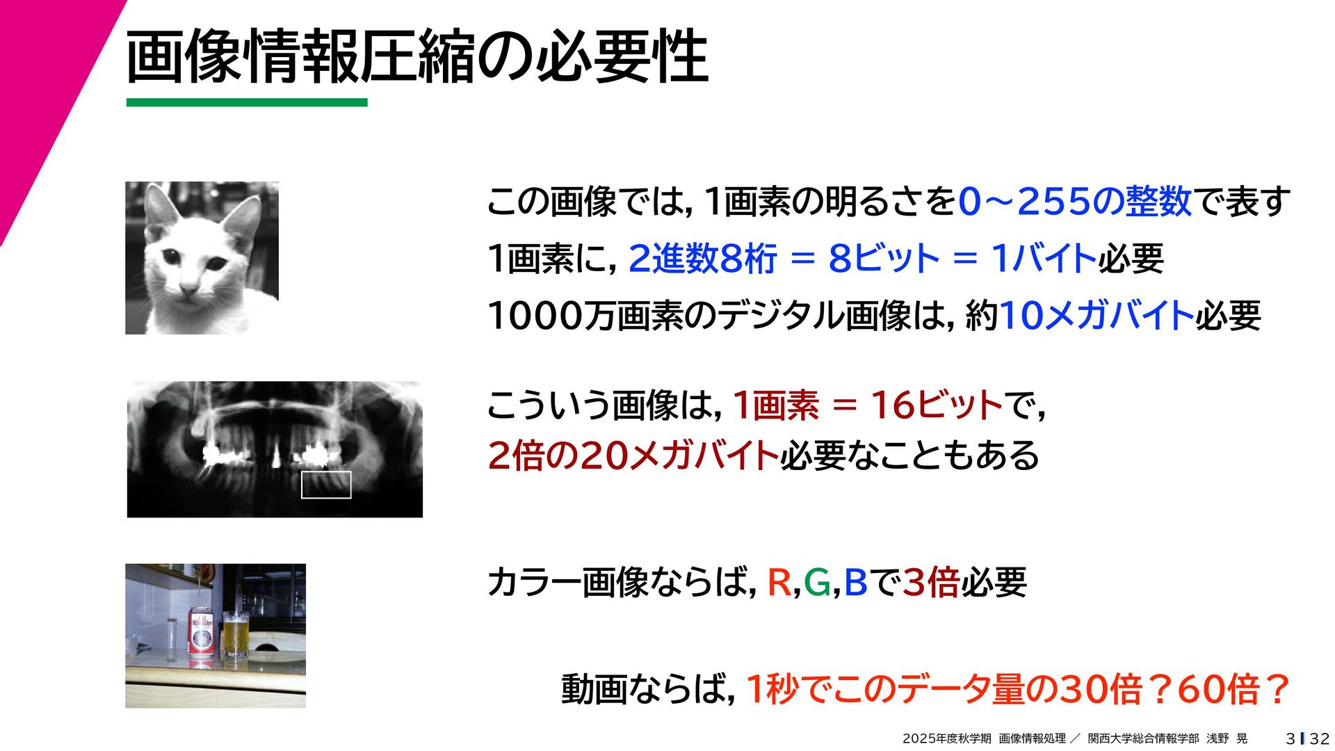 1. 32 2025年度秋学期 画像情報処理 / 関西大学総合情報学部 浅野 晃 画像情報圧縮の必要性 3 この画像では,1画素の明るさを0〜255の整数で表す カラー画像ならば,R,G,Bで3倍必要 1画素に,2進数8桁 = 8ビット