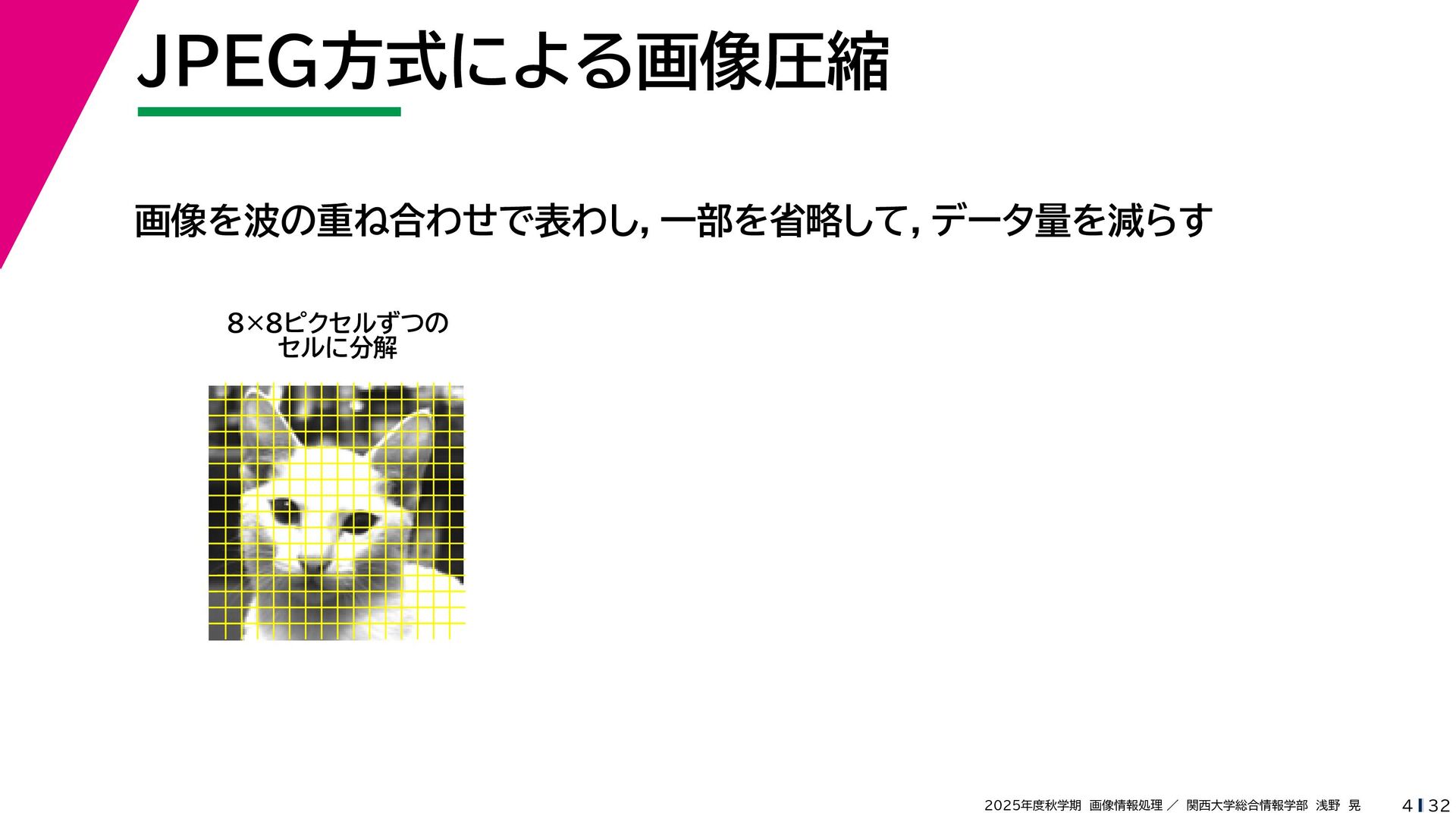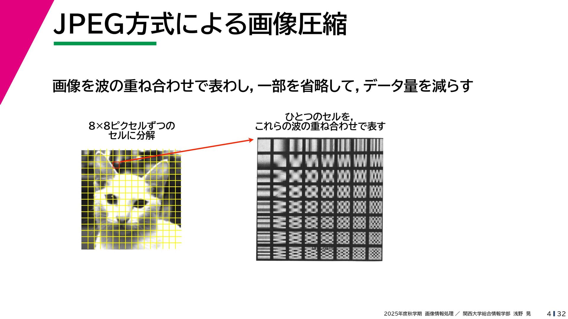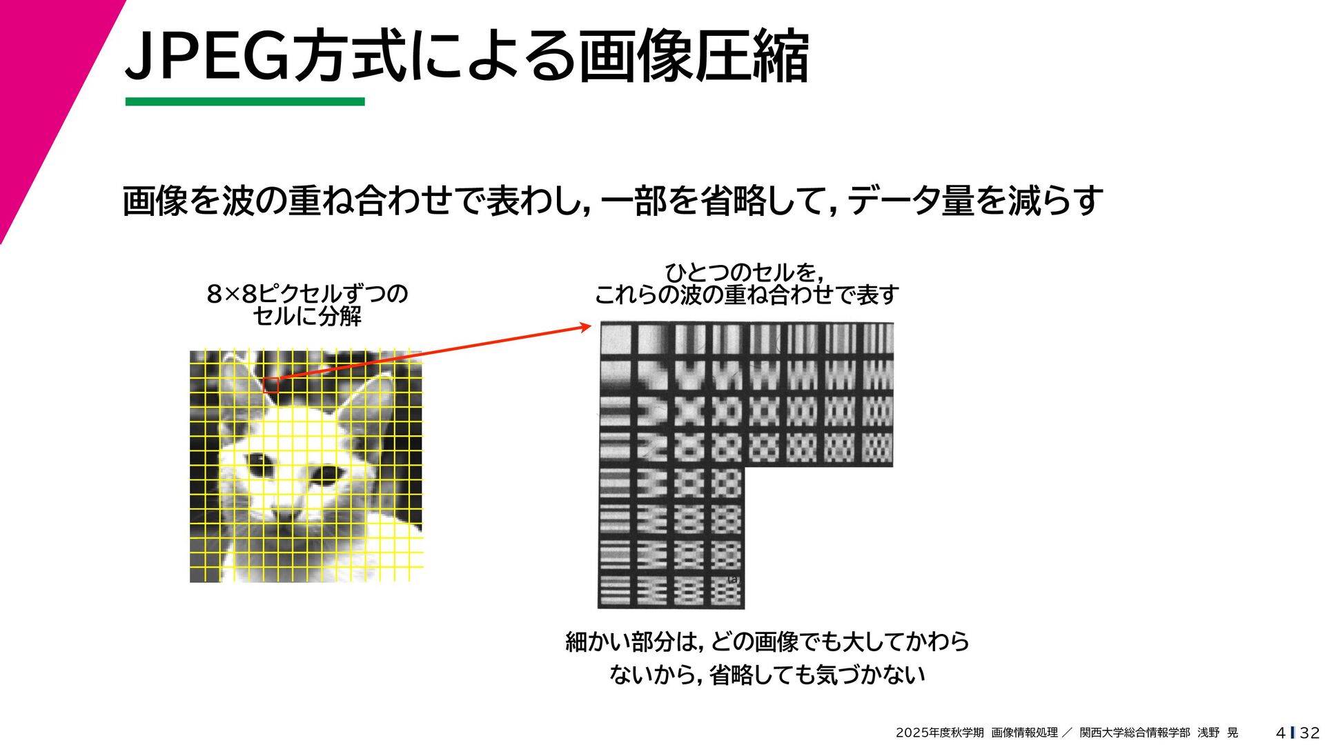 2. 32 2025年度秋学期 画像情報処理 / 関西大学総合情報学部 浅野 晃 JPEG方式による画像圧縮 4 画像を波の重ね合わせで表わし,一部を省略して,データ量を減らす ひとつのセルを, これらの波の重ね合わせで表す 8×8ピクセルずつの セルに分解
