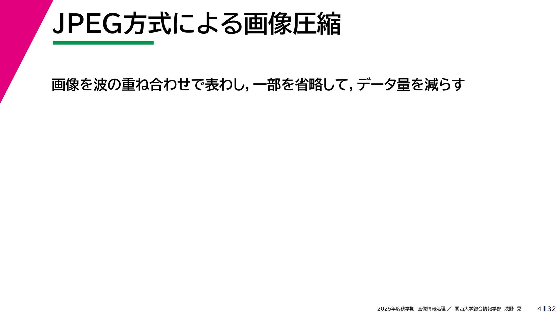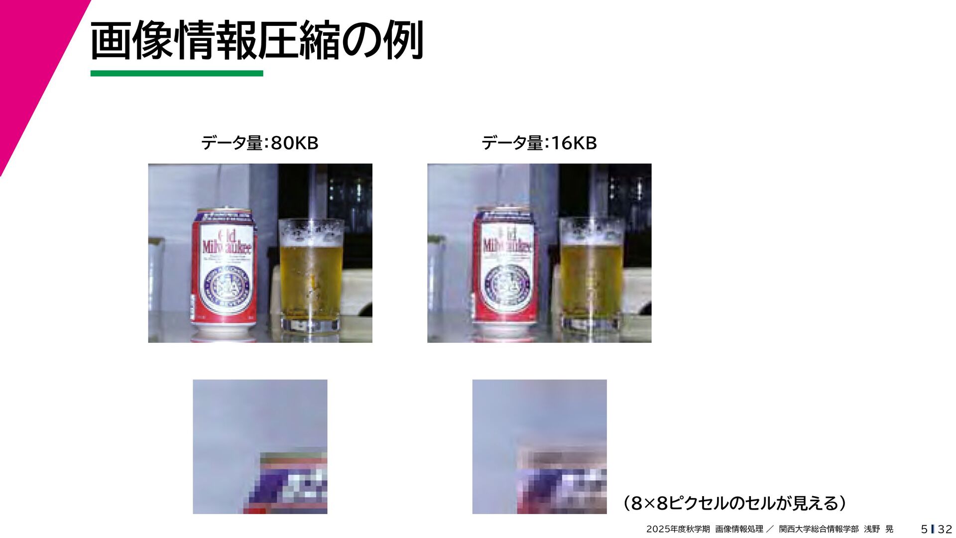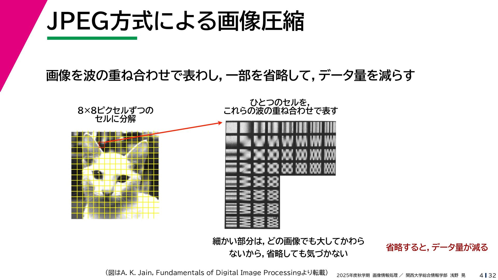 2. 32 2025年度秋学期 画像情報処理 / 関西大学総合情報学部 浅野 晃 JPEG方式による画像圧縮 4 画像を波の重ね合わせで表わし,一部を省略して,データ量を減らす ひとつのセルを, これらの波の重ね合わせで表す 8×8ピクセルずつの セルに分解