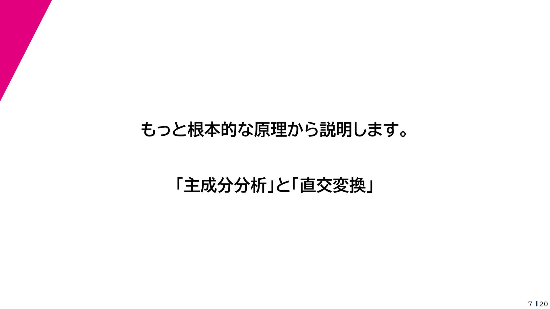  z(1) z(2) . . . z(p)       =       a1(1) a2(1) · · · ap(1) a1(2) a2(2) · · · ap(2) . . . ... a1(p) a2(p) · · · ap(p)             x1 x2 . . . xp       = P       x1 x2 . . . xp         xからzへの,P′による直交変換 Pは固有値問題の解       s11 s12 · · · s1p s12 s22 · · · s2p . . . ... sp1 sp2 · · · spp             a1 a2 . . . ap       = λ       a1 a2 . . . ap       S       a1(1) a1(2) · · · a1(p) a2(1) a2(2) · · · a2(p) . . . ... ap(1) ap(2) · · · ap(p)       =       a1(1) a1(2) · · · a1(p) a2(1) a2(2) · · · a2(p) . . . ... ap(1) ap(2) · · · ap(p)             λ(1) 0 λ(2) ... 0 λ(p)       分散共分散行列S