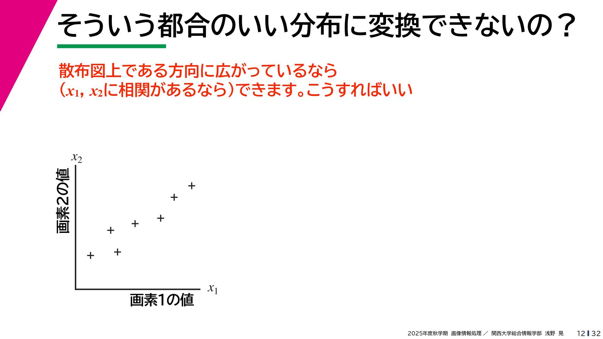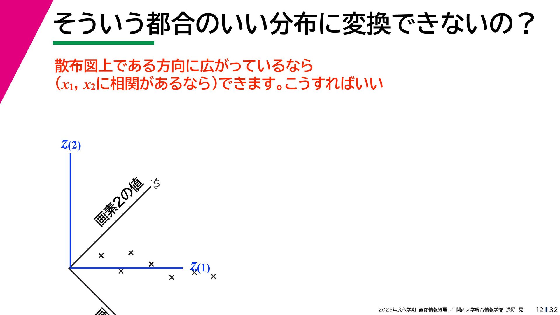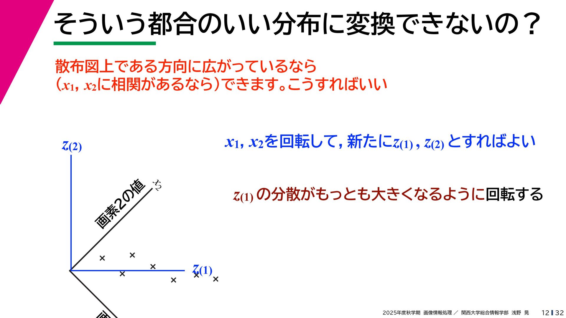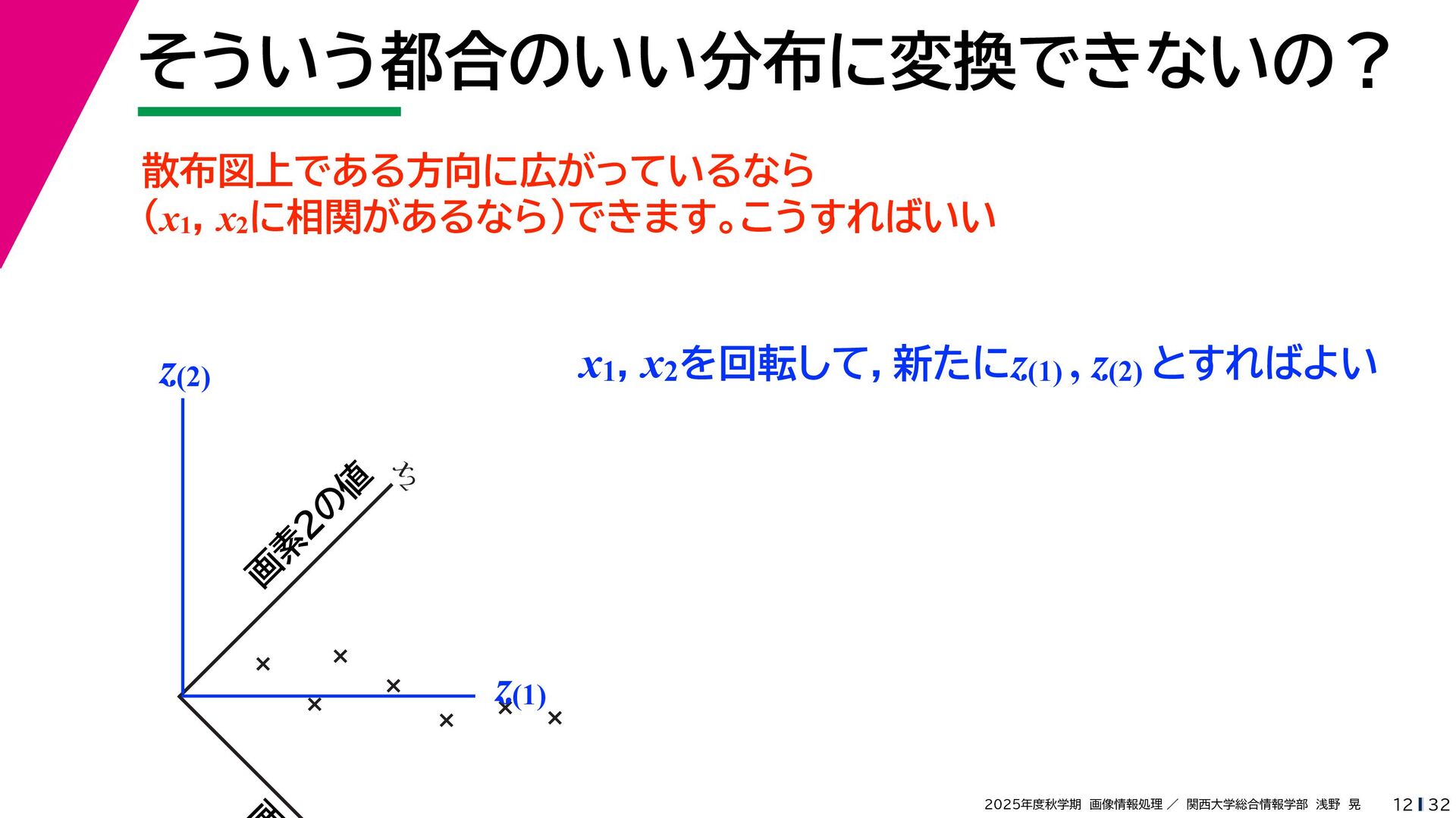 3. 32 2025年度秋学期 画像情報処理 / 関西大学総合情報学部 浅野 晃 そういう都合のいい分布に変換できないの? 12 散布図上である方向に広がっているなら (x1 , x2 に相関があるなら)できます。こうすればいい