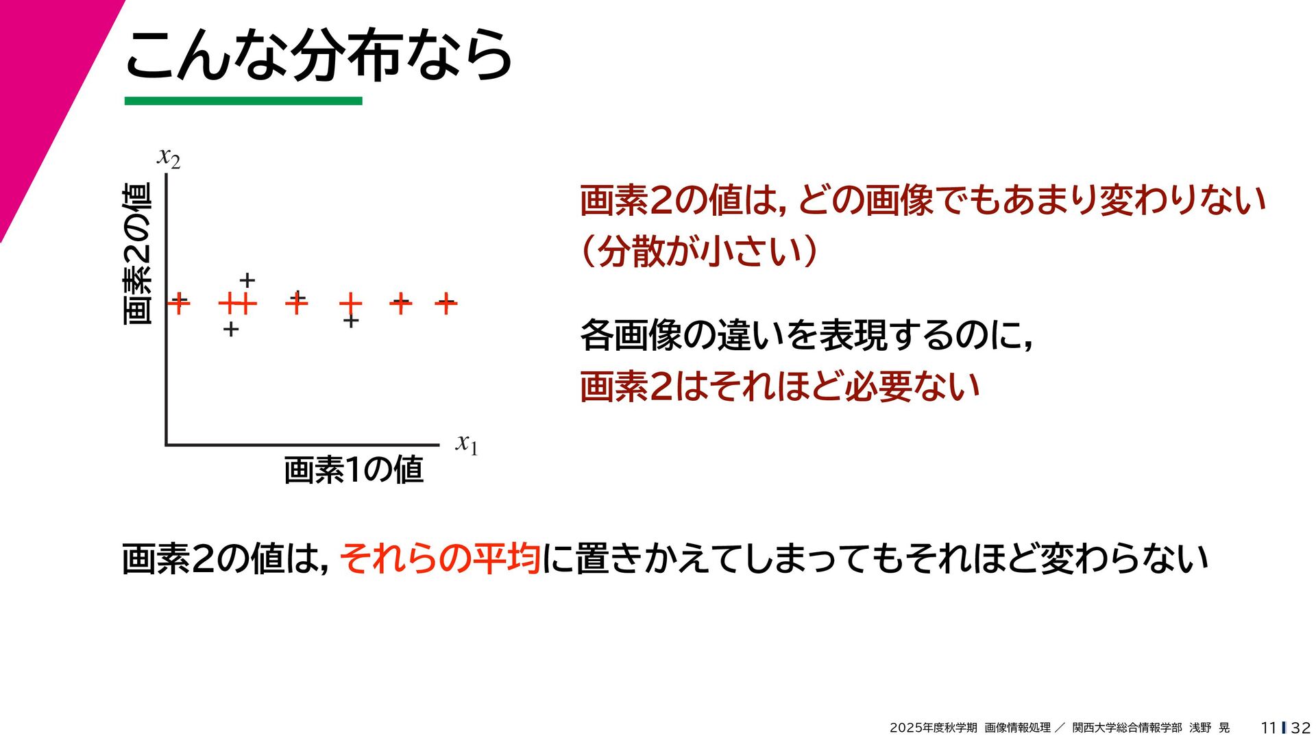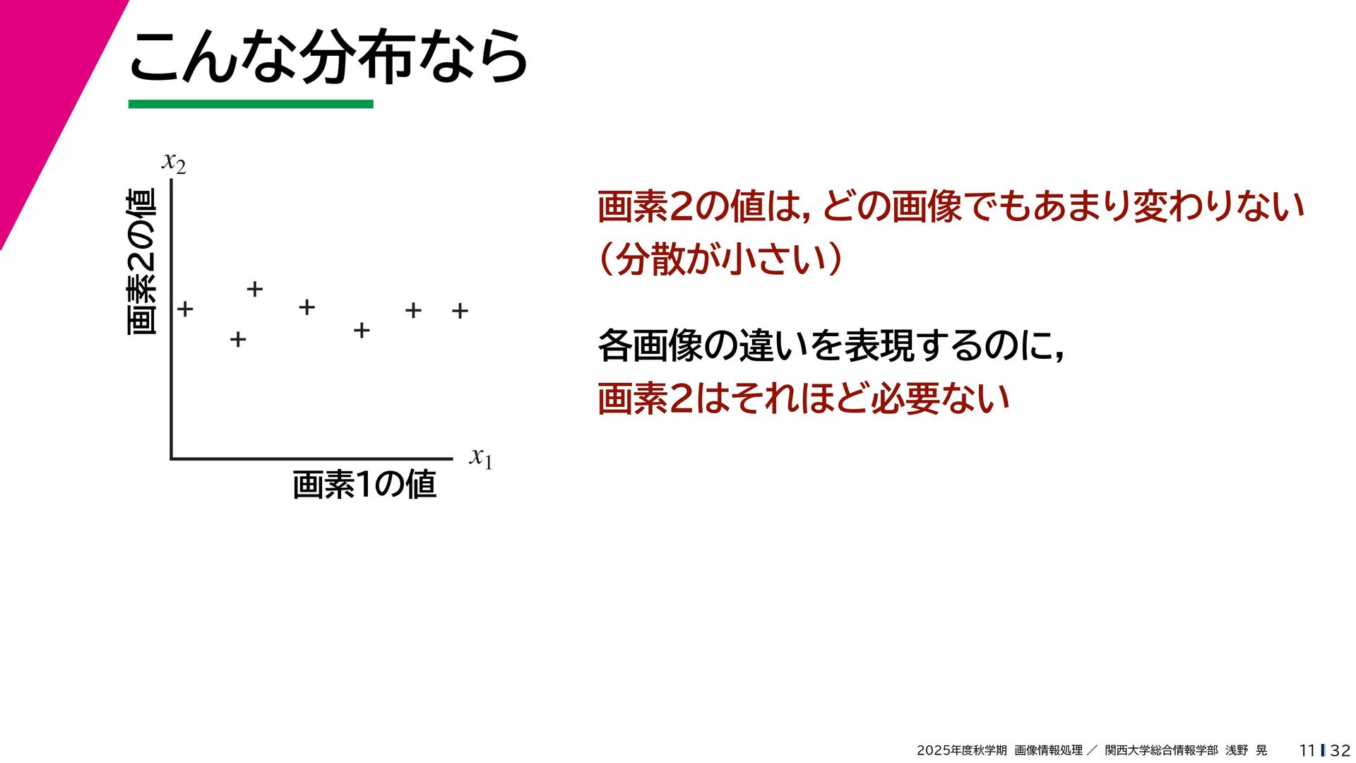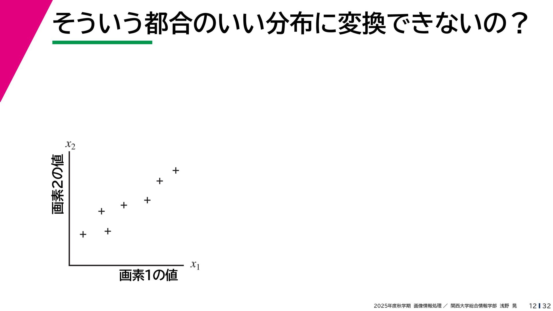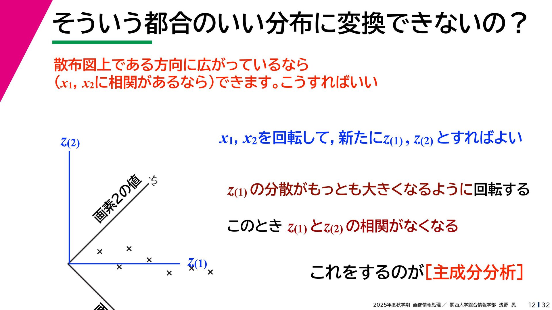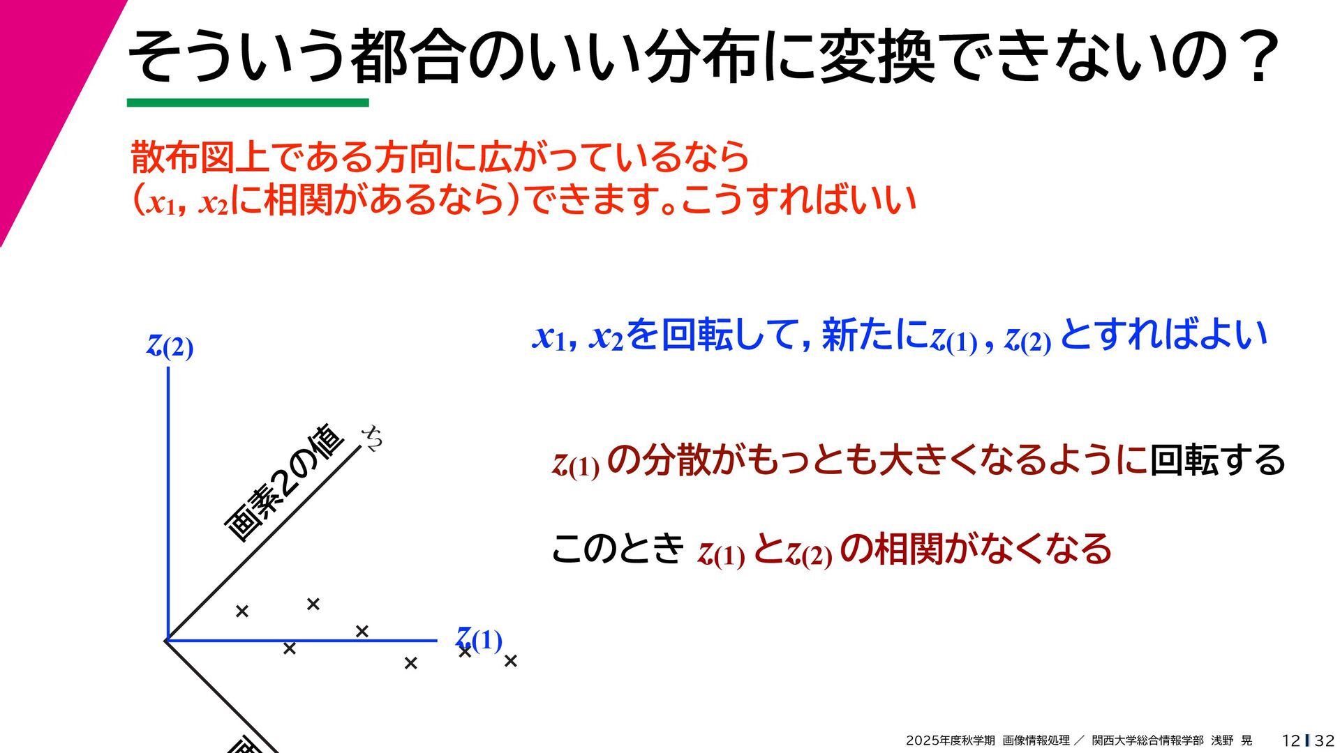 3. 32 2025年度秋学期 画像情報処理 / 関西大学総合情報学部 浅野 晃 そういう都合のいい分布に変換できないの? 12 散布図上である方向に広がっているなら (x1 , x2 に相関があるなら)できます。こうすればいい