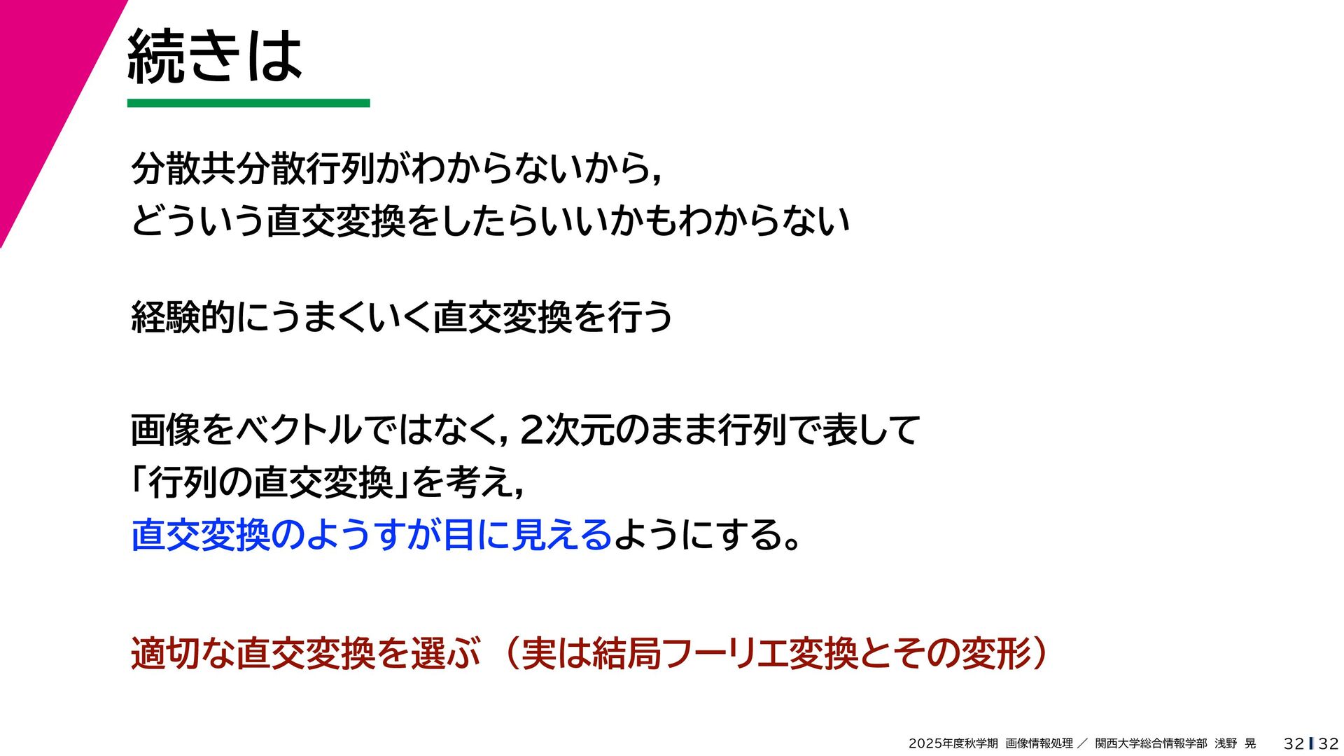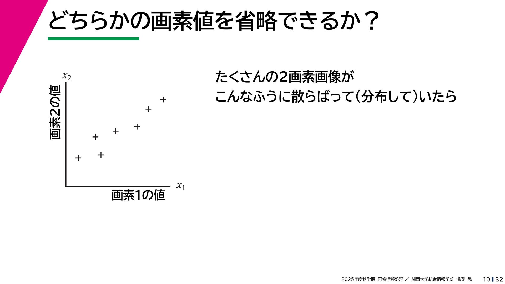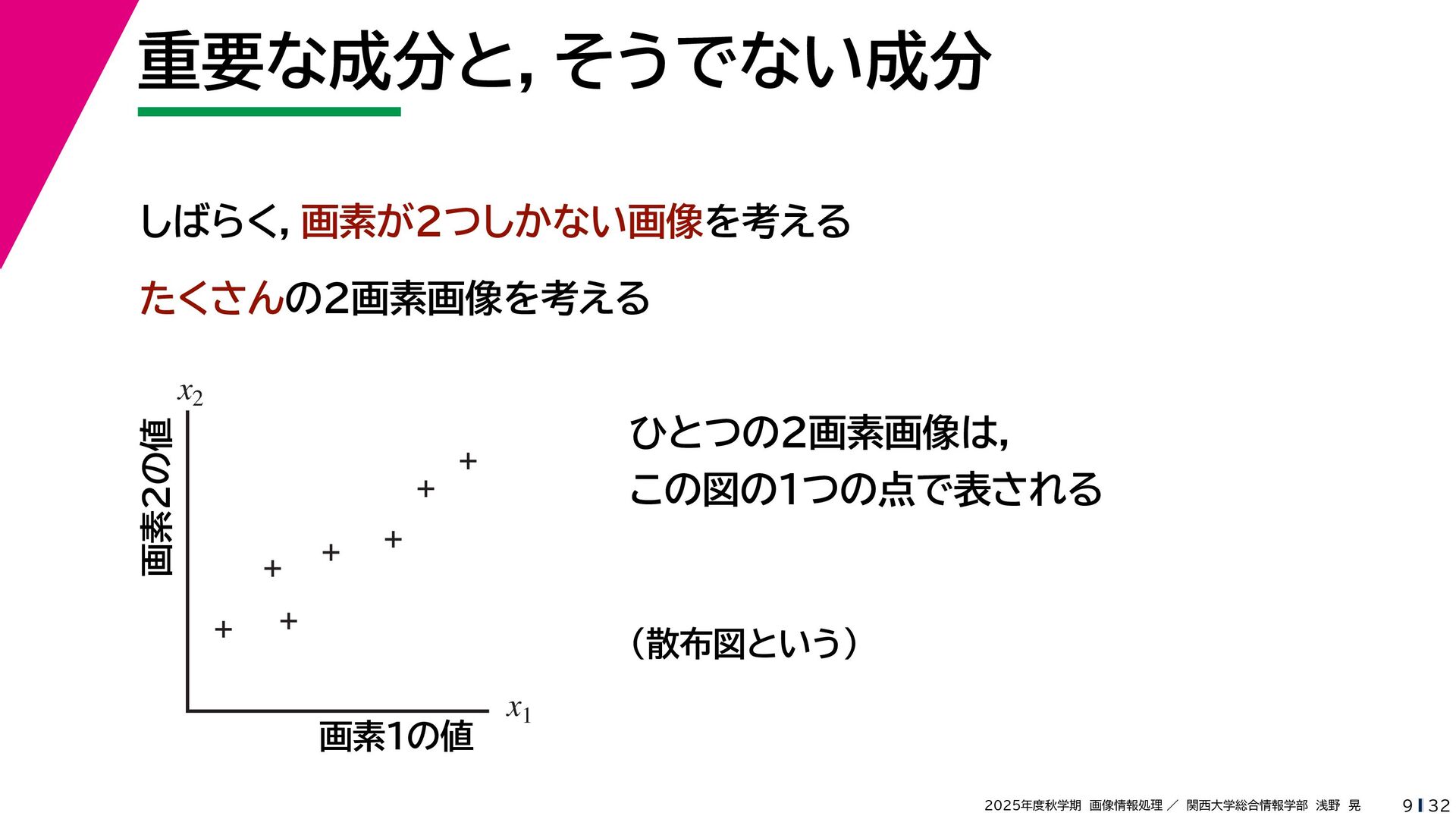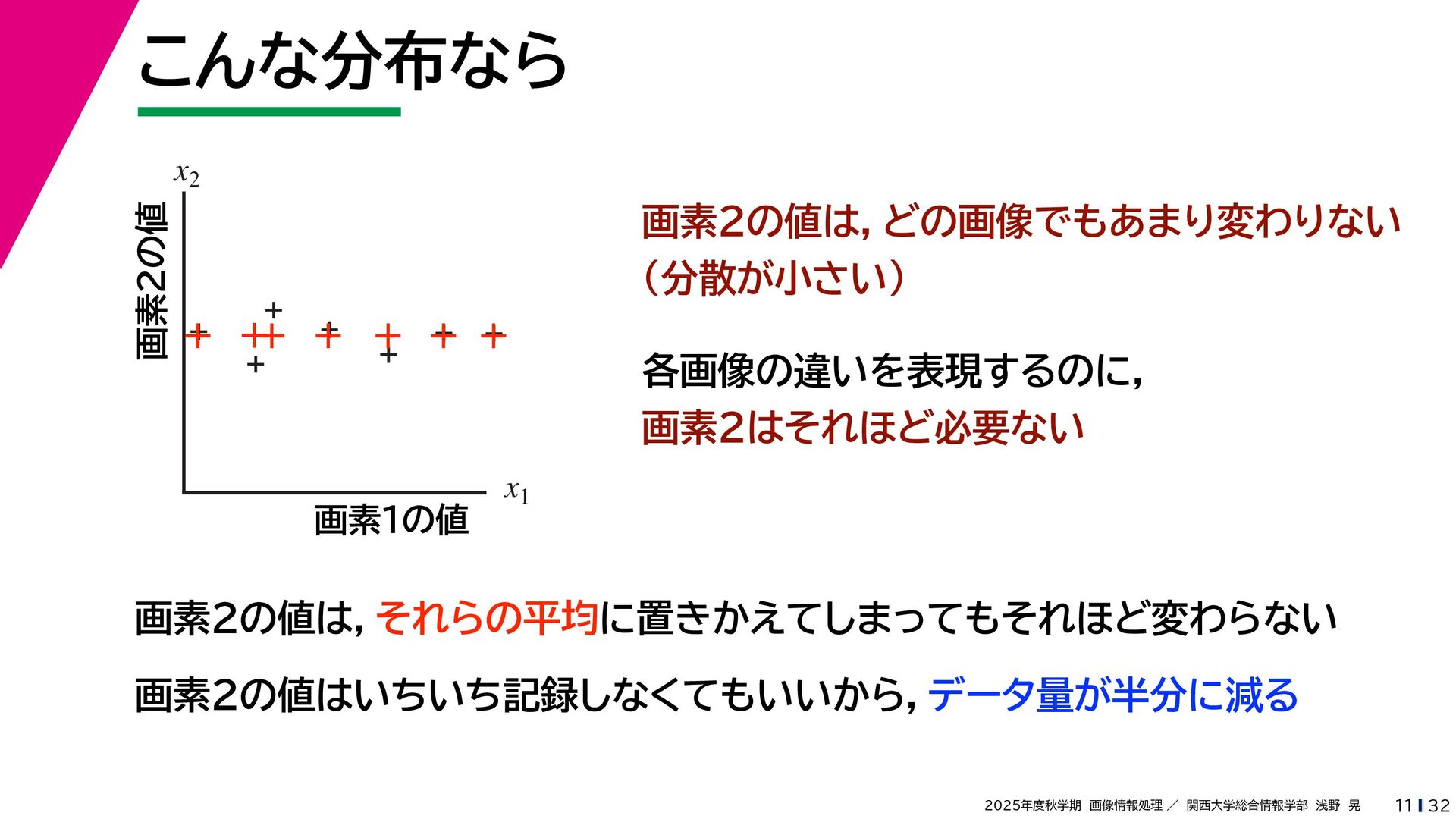 3. 32 2025年度秋学期 画像情報処理 / 関西大学総合情報学部 浅野 晃 そういう都合のいい分布に変換できないの? 12 散布図上である方向に広がっているなら (x1 , x2 に相関があるなら)できます。こうすればいい