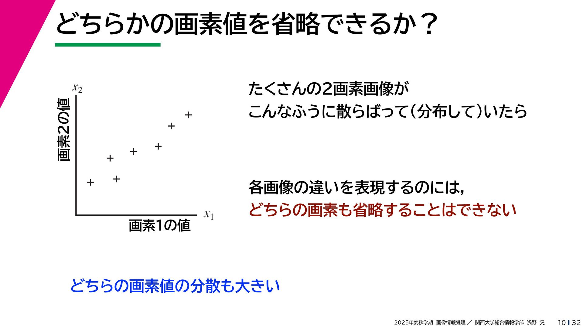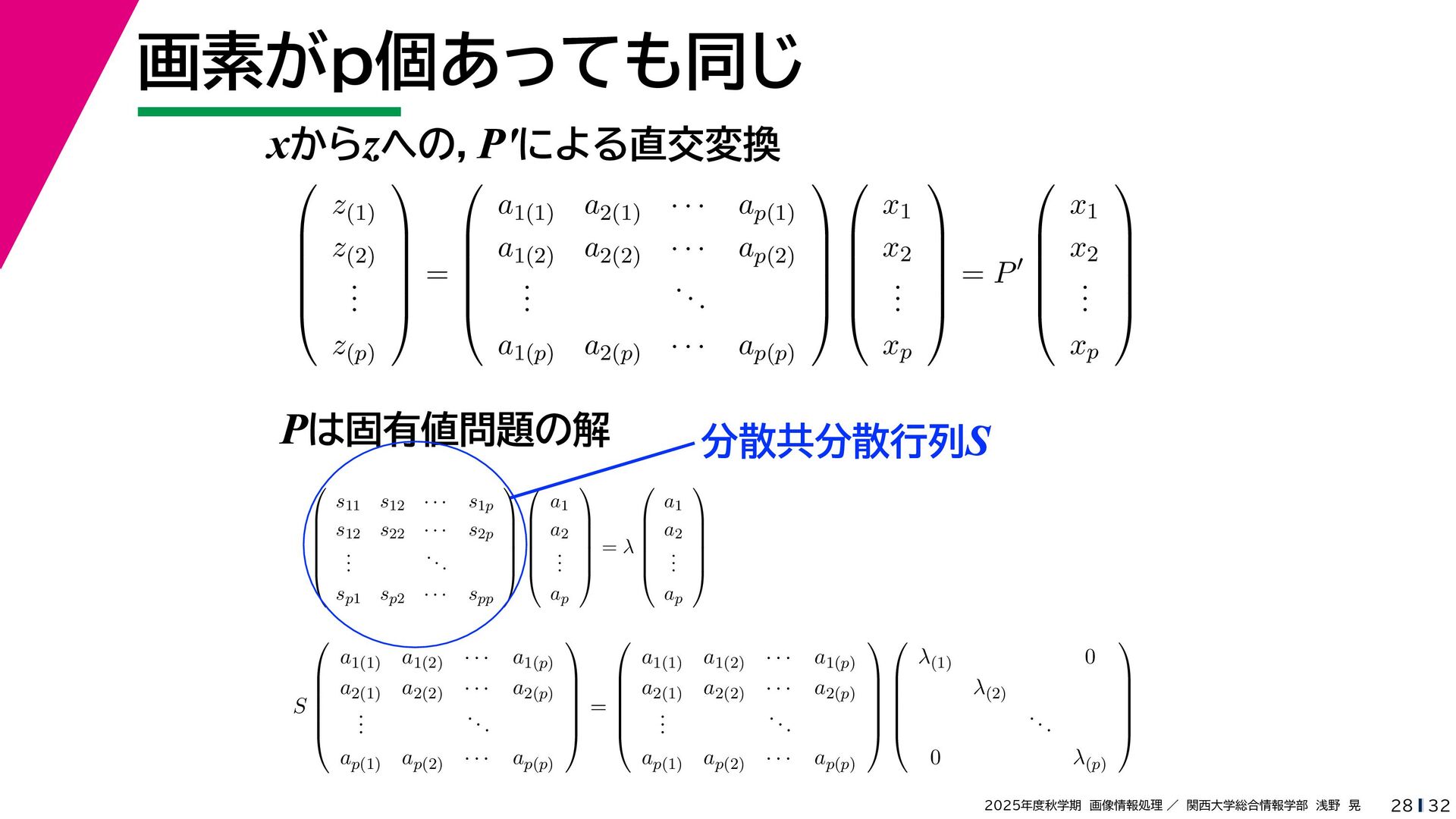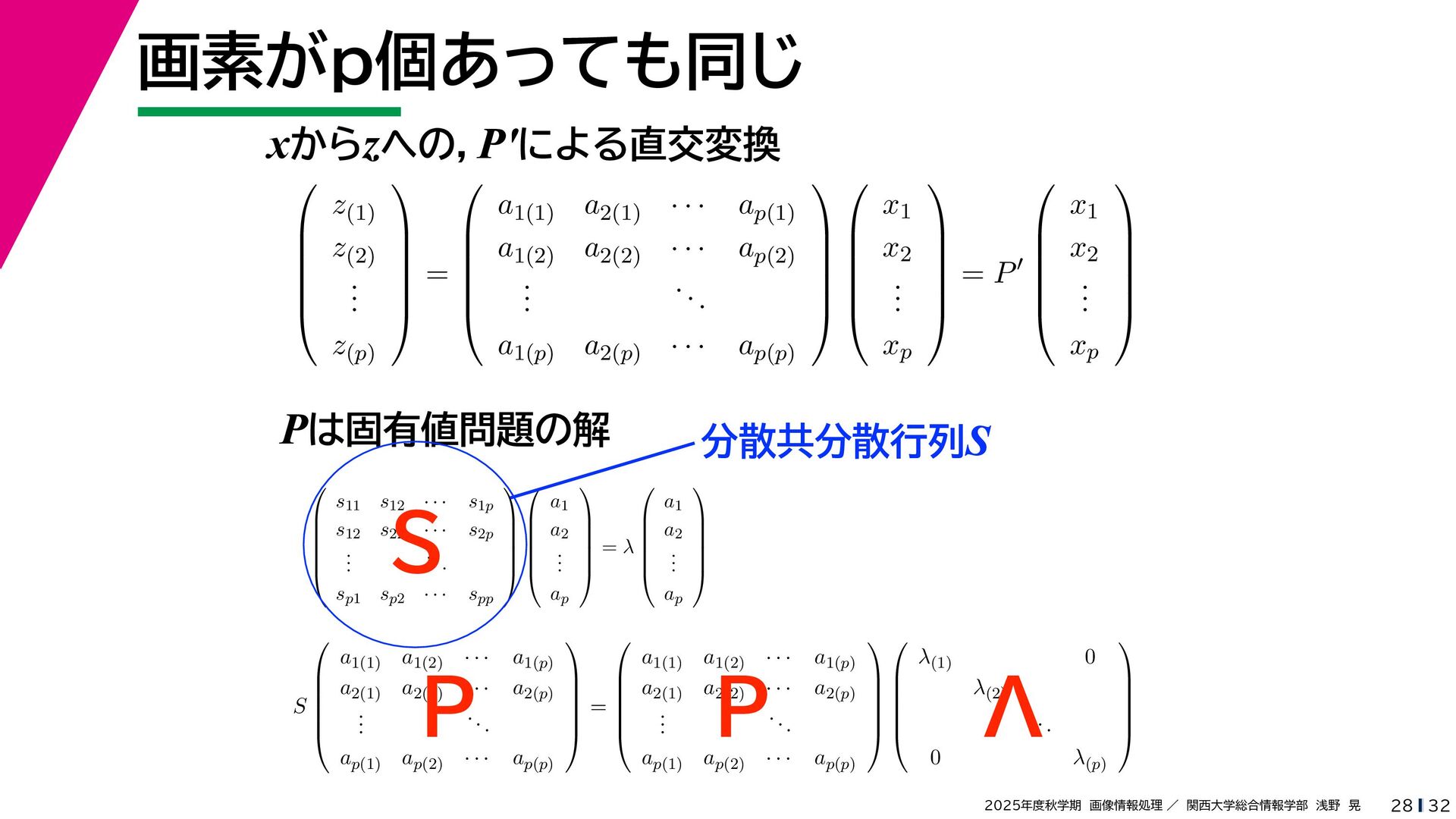 32. 32 2025年度秋学期 画像情報処理 / 関西大学総合情報学部 浅野 晃 画素がp個あっても同じ 28     