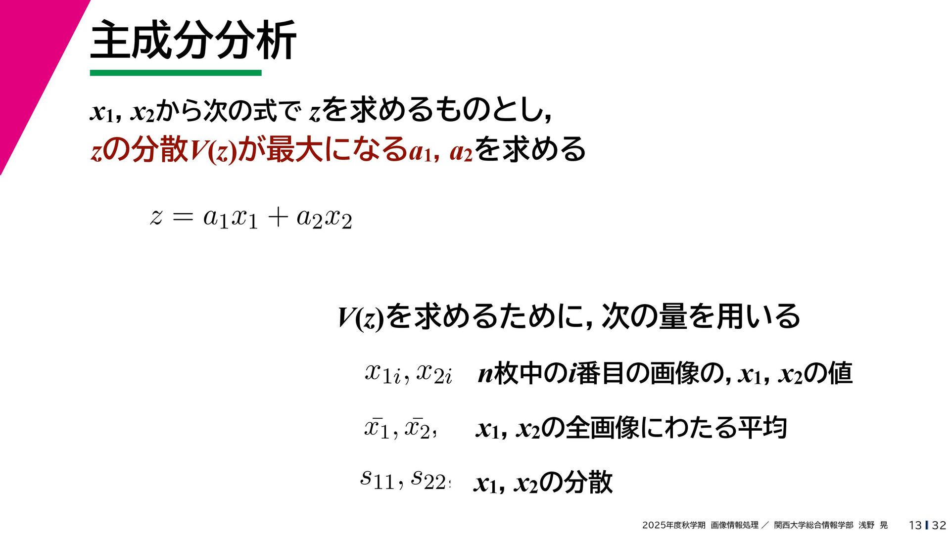 5. 32 2025年度秋学期 画像情報処理 / 関西大学総合情報学部 浅野 晃 主成分分析 13 x1, x2から次の式で zを求めるものとし, zの分散V(z)が最大になるa1, a2