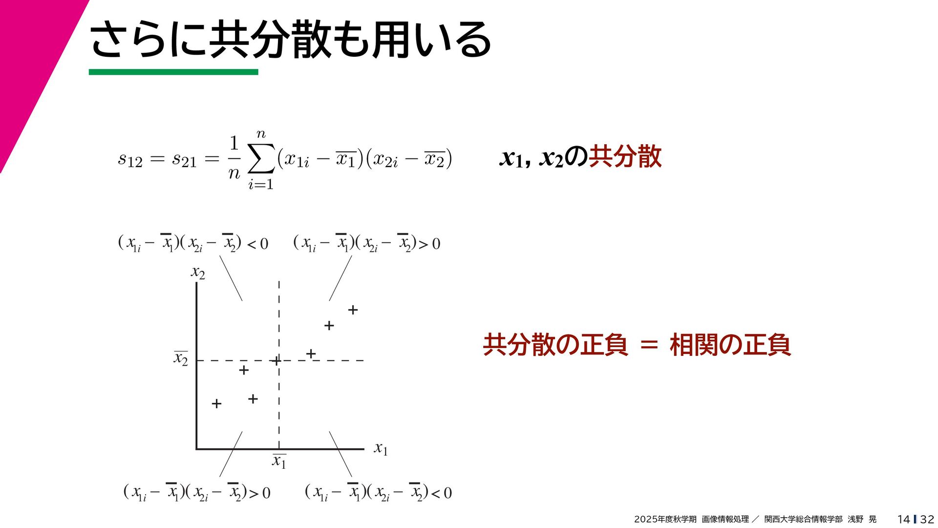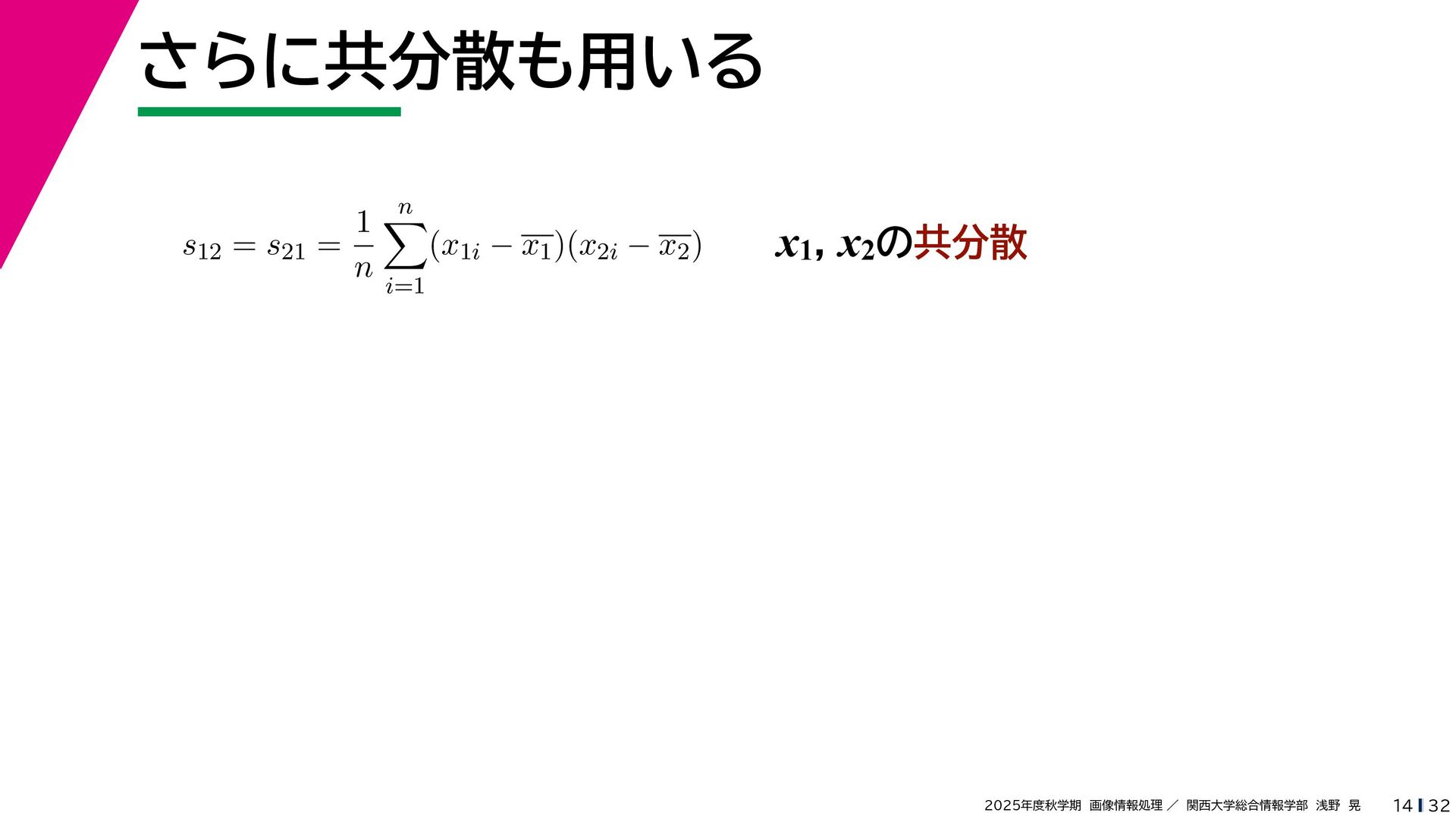 7. 32 2025年度秋学期 画像情報処理 / 関西大学総合情報学部 浅野 晃 さらに共分散も用いる 14 s12 = s21 = 1