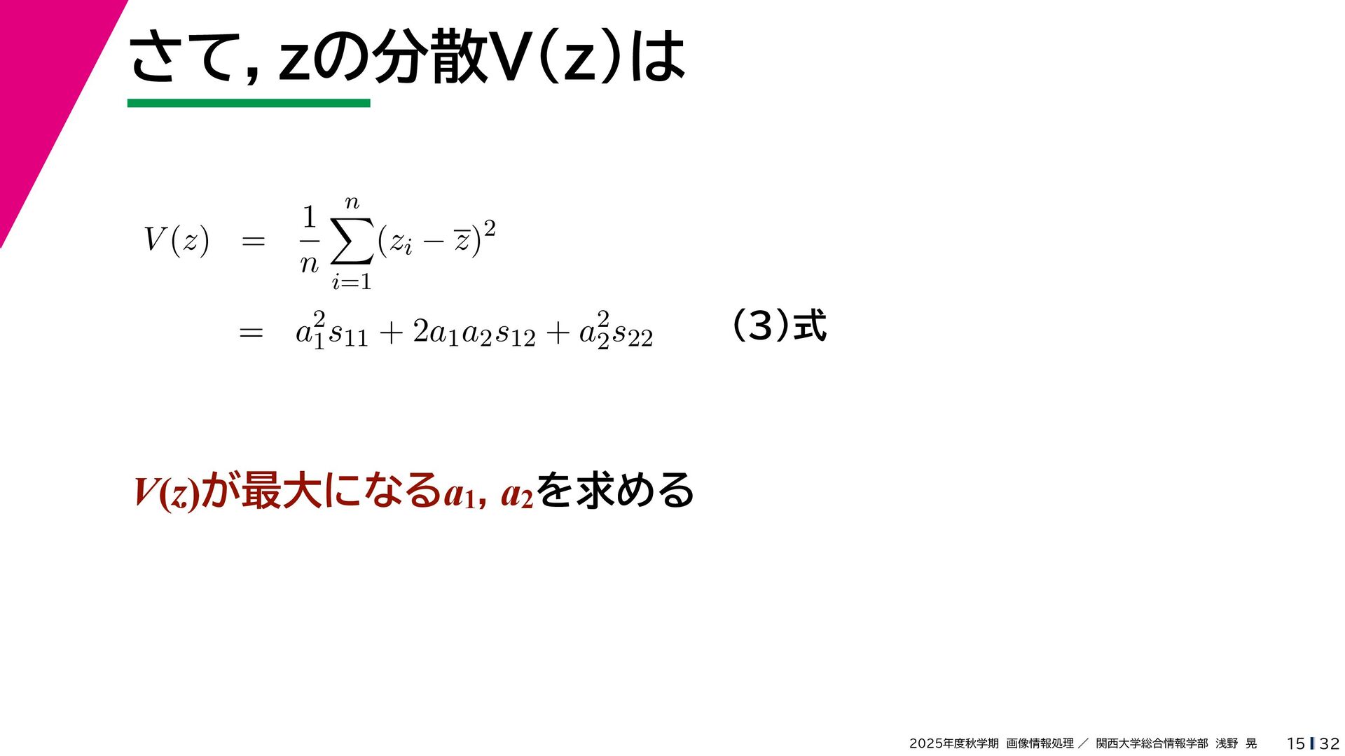 9. 32 2025年度秋学期 画像情報処理 / 関西大学総合情報学部 浅野 晃 さて,zの分散V(z)は 15 (3)式 V(z)が最大になるa1, a2 を求める V