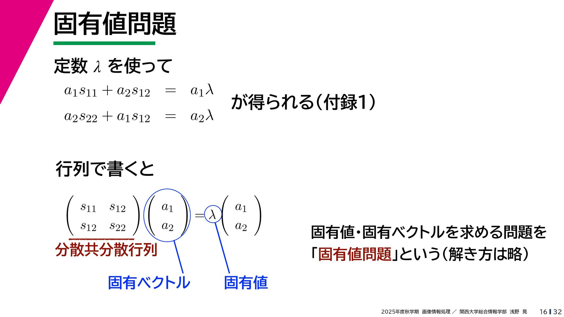 11. 32 2025年度秋学期 画像情報処理 / 関西大学総合情報学部 浅野 晃 固有値問題 16 が得られる(付録1) a1s11 + a2s12 =