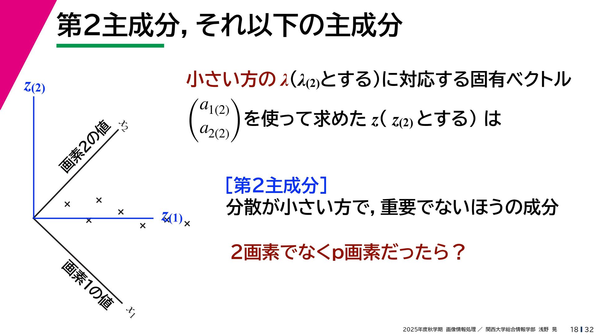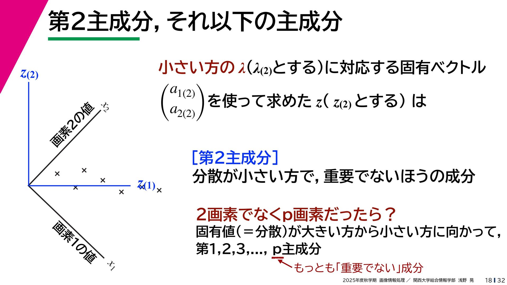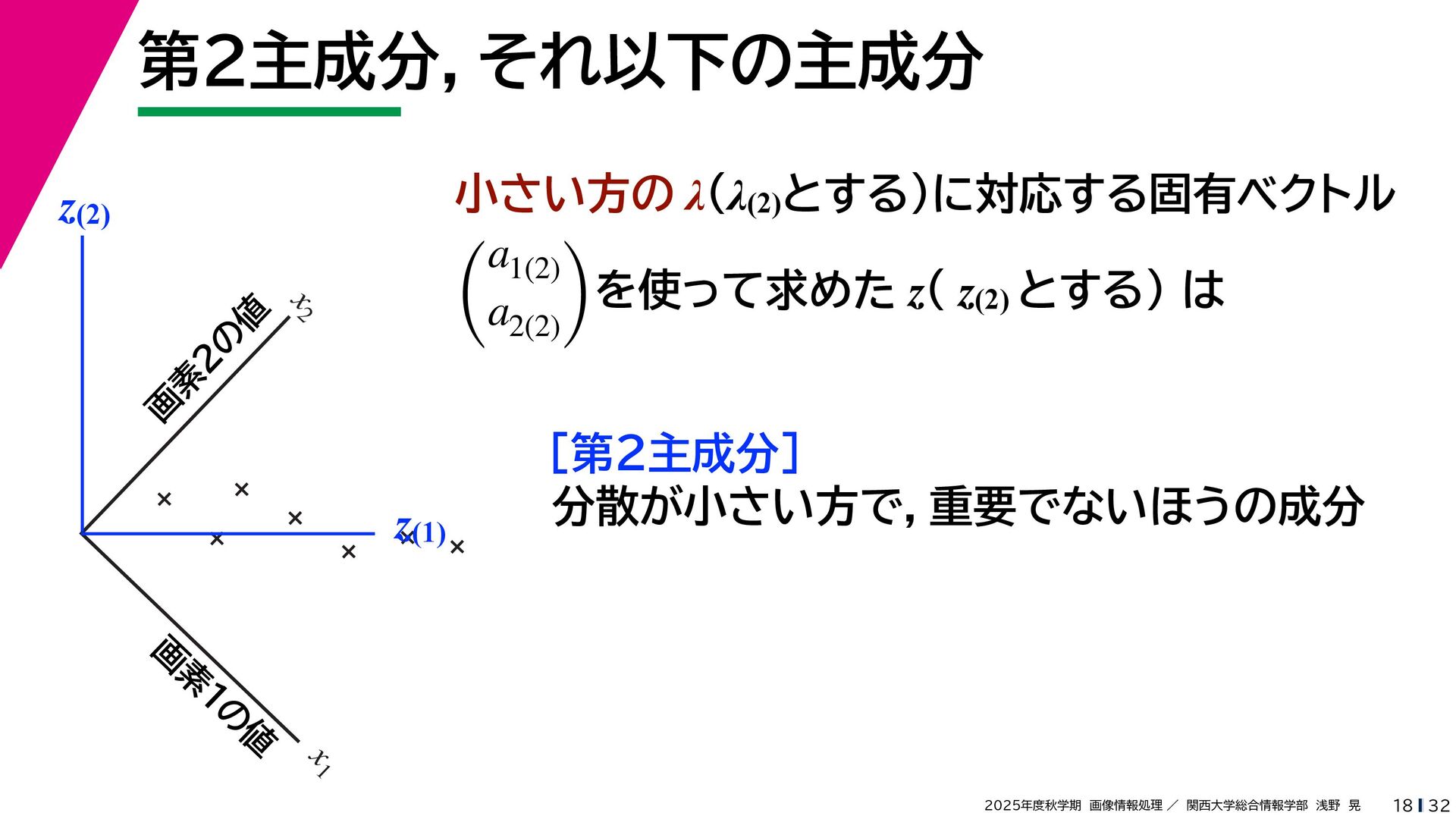 16. 32 2025年度秋学期 画像情報処理 / 関西大学総合情報学部 浅野 晃 第2主成分,それ以下の主成分 18 [第2主成分] 小さい方の λ(λ(2) とする)に対応する固有ベクトル を使って求めた
