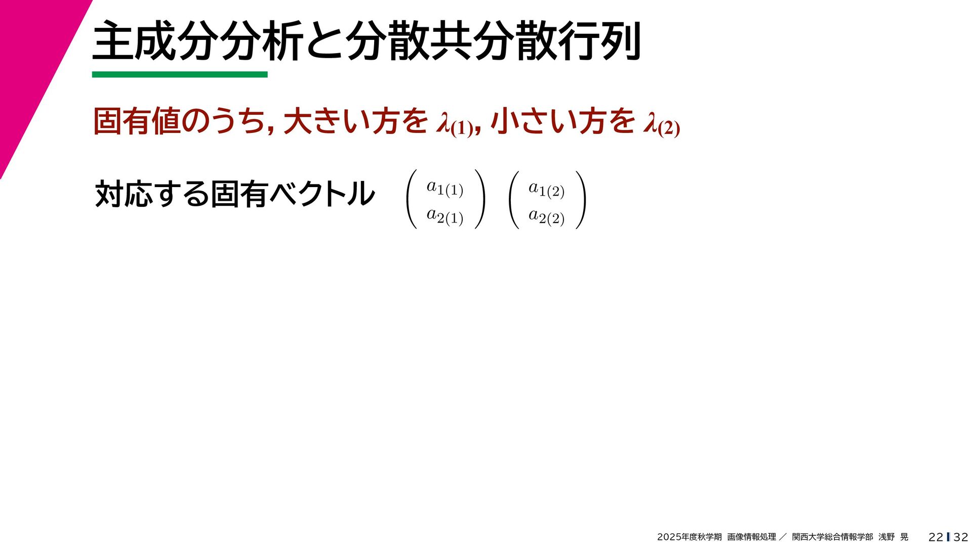 21. 32 2025年度秋学期 画像情報処理 / 関西大学総合情報学部 浅野 晃 主成分分析と分散共分散行列 22 固有値のうち,大きい方を λ(1) ,小さい方を λ(2) 対応する固有ベクトル
